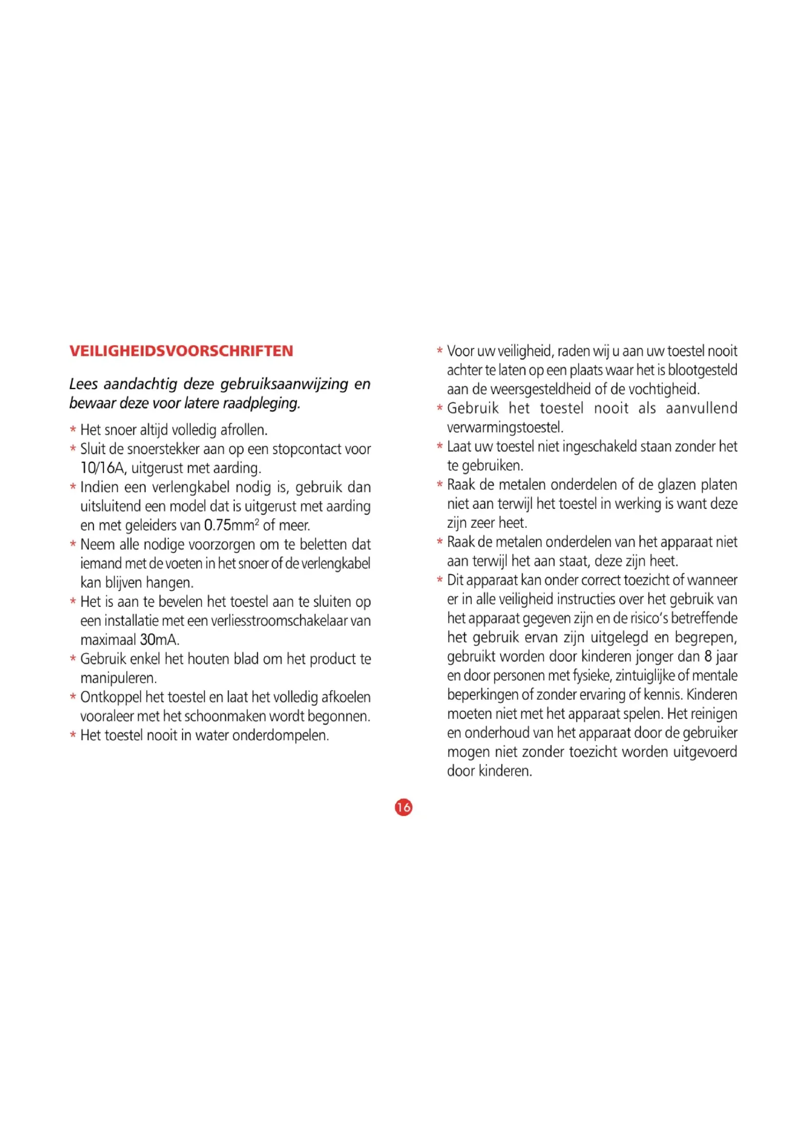 Dit apparaat kan onder correct toezicht of wanneer er in alle veiligheid instructies over het gebruik van het apparaat gegeven zijn en de risico’s betreffende het gebruik ervan zijn uitgelegd en begrepen, gebruikt worden door kinderen jonger dan 8 jaar en door personen met fysieke, zintuiglijke of mentale beperkingen of zonder ervaring of kennis. Kinderen moeten niet met het apparaat spelen. Het reinigen en onderhoud van het apparaat door de gebruiker mogen niet zonder toezicht worden uitgevoerd door kinderen. 16* Houd het apparaat en de stroomkabel buiten bereik van kinderen jonger dan 8 jaar.