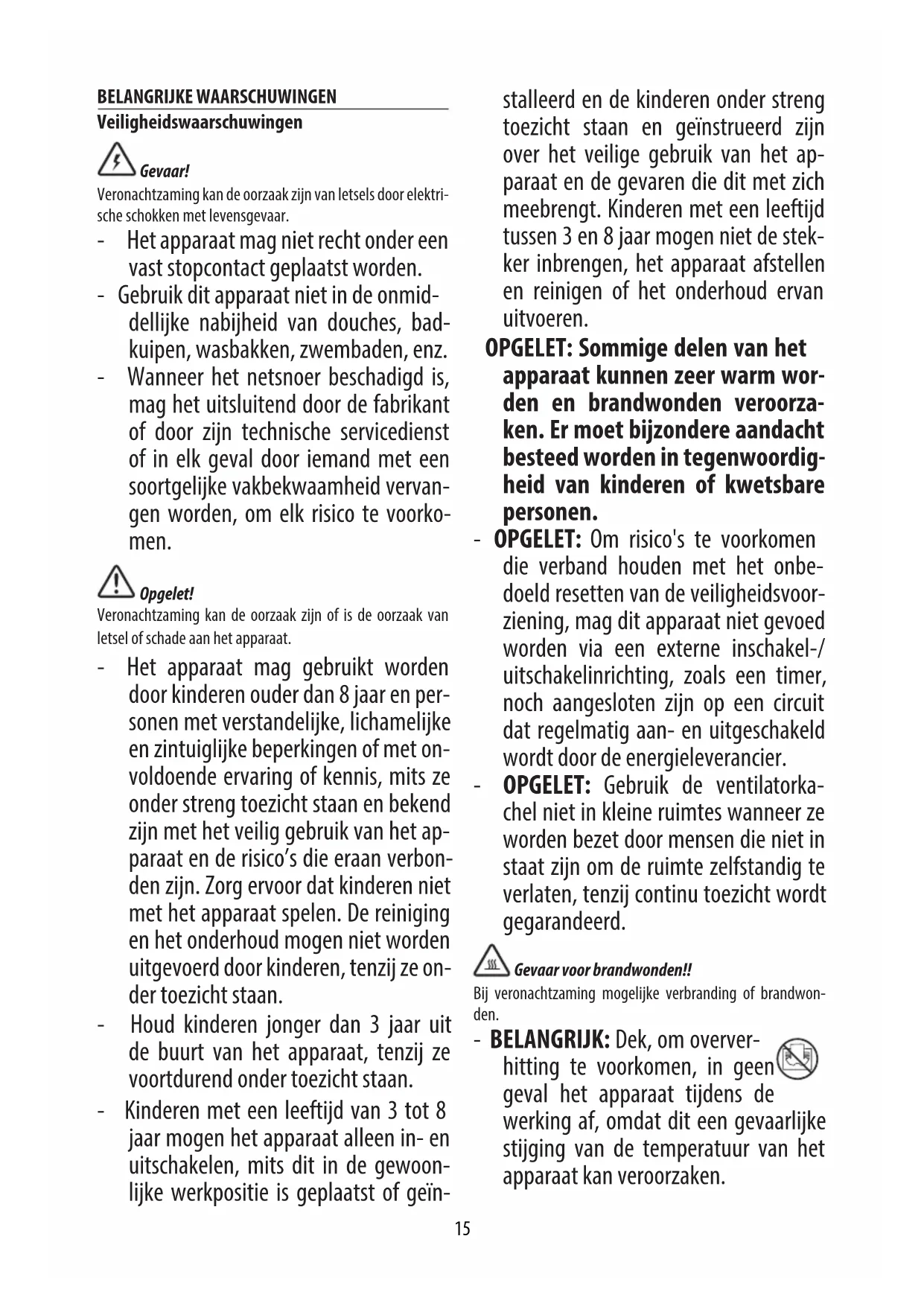 VON KINDERN. - Verschlucken kann infolge chemis- cher Verbrennungen und möglichem Durchbruch der Speiseröhre in weniger als 2 Stunden zu schweren Verletzun- gen oder zum Tod führen. - Prüfen Sie die Vorrichtungen und stel- len Sie sicher, dass das Batteriefach richtig geschlossen ist. Nicht ver- wenden, wenn das Fach nicht sicher ist. - Entsorgen Sie leere Knopfzellen sofort und sicher. Auch entladene Batterien können gefährlich sein. Grundlegende Sicherheitshinweise Werter Kunde - während des Betriebs wird der Stecker dieses Gerätes heiß: dies ist vollkommen normal. Dies ist ein HEIZGERÄT MIT HOHER LEISTUNG, das unseren gewohnt hohen Standards entspricht. Bitte stellen Sie dennoch sicher, dass sich Ihre Wandsteckdosen in gutem Zustand befinden und dass der Stecker richtig in die Steckdose eingesteckt ist, um versehentliche Überhitzung zu vermeiden. Wenn das Gerät über einen längeren Zeitraum hinweg benutzt wird, empfehlen wir Ihnen, den Stecker UND DIE STECKDOSE regelmäßig zu prüfen und im Zweifelsfall einen Elektriker zu Rate zu ziehen. Nur Nicht-EU-Länder: Das Gerät darf nicht von Personen (ein- schließlich Kindern) mit körperlichen, geistigen oder sensorischen Behinde- rungen, oder von Personen, die nicht mit dem Betrieb des Gerätes vertraut sind, gebraucht werden, es sei denn, dass sie von einer für sie und ihre Sicherheit ver- antwortlichen Person beaufsichtigt oder in den Gebrauch des Gerätes eingewiesen wurden. Dafür sorgen, dass die Kinder nicht mit dem Gerät spielen. Entsorgung des Gerätes Das Gerät nicht zusammen mit an- deren Hausabfällen entsorgen, son- dern einem Zentrum für ozielle Mülltrennung übergeben.15 BELANGRIJKE WAARSCHUWINGEN Veiligheidswaarschuwingen Gevaar! Veronachtzaming kan de oorzaak zijn van letsels door elektri- sche schokken met levensgevaar. - Het apparaat mag niet recht onder een vast stopcontact geplaatst worden. - Gebruik dit apparaat niet in de onmid- dellijke nabijheid van douches, bad- kuipen, wasbakken, zwembaden, enz. - Wanneer het netsnoer beschadigd is, mag het uitsluitend door de fabrikant of door zijn technische servicedienst of in elk geval door iemand met een soortgelijke vakbekwaamheid vervan- gen worden, om elk risico te voorko- men. Opgelet! Veronachtzaming kan de oorzaak zijn of is de oorzaak van letsel of schade aan het apparaat. - Het apparaat mag gebruikt worden door kinderen ouder dan 8 jaar en per- sonen met verstandelijke, lichamelijke en zintuiglijke beperkingen of met on- voldoende ervaring of kennis, mits ze onder streng toezicht staan en bekend zijn met het veilig gebruik van het ap- paraat en de risico’s die eraan verbon- den zijn. Zorg ervoor dat kinderen niet met het apparaat spelen. De reiniging en het onderhoud mogen niet worden uitgevoerd door kinderen, tenzij ze on- der toezicht staan. - Houd kinderen jonger dan 3 jaar uit de buurt van het apparaat, tenzij ze voortdurend onder toezicht staan. - Kinderen met een leeftijd van 3 tot 8 jaar mogen het apparaat alleen in- en uitschakelen, mits dit in de gewoon- lijke werkpositie is geplaatst of geïn- stalleerd en de kinderen onder streng toezicht staan en geïnstrueerd zijn over het veilige gebruik van het ap- paraat en de gevaren die dit met zich meebrengt. Kinderen met een leeftijd tussen 3 en 8 jaar mogen niet de stek- ker inbrengen, het apparaat afstellen en reinigen of het onderhoud ervan uitvoeren. OPGELET: Sommige delen van het apparaat kunnen zeer warm wor- den en brandwonden veroorza- ken. Er moet bijzondere aandacht besteed worden in tegenwoordig- heid van kinderen of kwetsbare personen. - OPGELET: Om risico's te voorkomen die verband houden met het onbe- doeld resetten van de veiligheidsvoor- ziening, mag dit apparaat niet gevoed worden via een externe inschakel-/ uitschakelinrichting, zoals een timer, noch aangesloten zijn op een circuit dat regelmatig aan- en uitgeschakeld wordt door de energieleverancier. - OPGELET: Gebruik de ventilatorka- chel niet in kleine ruimtes wanneer ze worden bezet door mensen die niet in staat zijn om de ruimte zelfstandig te verlaten, tenzij continu toezicht wordt gegarandeerd. Gevaar voor brandwonden!! Bij veronachtzaming mogelijke verbranding of brandwon- den. - BELANGRIJK: Dek, om overver- hitting te voorkomen, in geen geval het apparaat tijdens de werking af, omdat dit een gevaarlijke stijging van de temperatuur van het apparaat kan veroorzaken.16 - OPGELET: om het risico op brand te verminderen, dienen stoen, gordij- nen of ander brandbaar materiaal op een minimumafstand van 1 meter van het luchtuitlaatrooster worden gehou- den. Veiligheidsfuncties - Veiligheidsvoorziening: het appa- raat is voorzien van een veiligheids- voorziening die de werking van de ventilatorkachel in geval van onbe- doelde oververhitting (vb. verstopping van de roosters voor de luchtinlaat en -uitlaat, niet of langzaam draaiende motor) onderbreekt. m het apparaat weer in werking te stellen, is het noodzakelijk de stekker enkele minuten uit het stopcontact te halen, de oorzaak van de oververhit- ting weg te nemen en vervolgens de stekker weer in het stopcontact te ste- ken. Als het apparaat nog steeds niet werkt, neem dan contact op met het dichtstbijzijnde De’Longhi servicecen- trum. - Kantelbeveiliging: Sommige mo- dellen zijn voorzien van een kantelbe- veiliging die het apparaat uitschakelt wanneer het omvalt. Om het apparaat weer aan te zetten, zet u het eenvou- digweg weer overeind. Opmerking: Dit symbool duidt op belangrijke tips en informatie voor de gebruiker. - Gebruik het apparaat op een horizon- taal en stabiel oppervlak. - Gebruik het apparaat uitsluitend in verticale positie. - Gebruik het apparaat niet wanneer het gevallen is. - Gebruik het apparaat niet als het zichtbare schade vertoont. - Het gebruik van een verlengsnoer wordt afgeraden. Mocht het gebruik ervan toch nodig zijn, volg dan zorg- vuldig de gebruiksaanwijzingen van het verlengsnoer op en overschrijd niet het maximum vermogen dat op het verleng