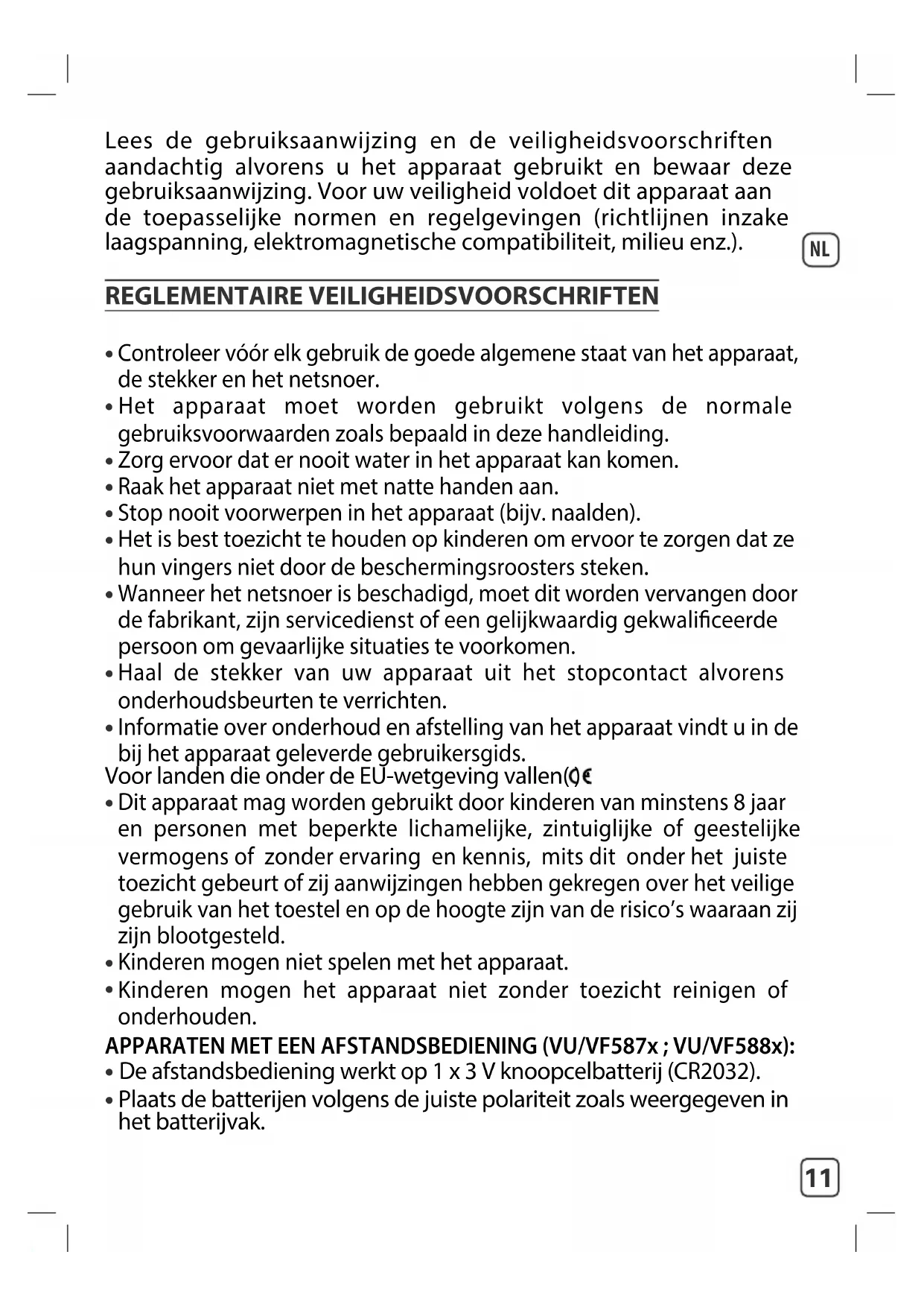 Kinderen mogen het apparaat niet zonder toezicht reinigen of onderhouden. APPARATEN MET EEN AFSTANDSBEDIENING (VU/VF587x ; VU/VF588x):