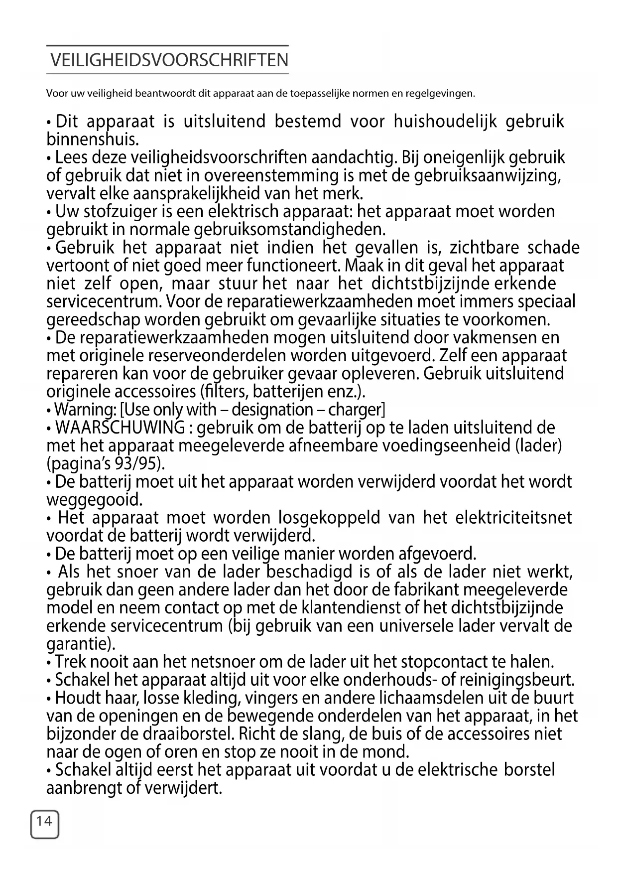 De lader wordt warm. Dit is volkomen normaal. De stofzuiger kan zonder enig risico permanent op de lader aangesloten zijn. De lader is aangesloten, maar uw apparaat laadt niet op. De lader is slecht aangesloten op het apparaat of is defect. Controleer of de lader goed aangesloten is of neem contact op met een erkend servicecentrum om de lader te laten vervangen. Uw apparaat stopt tijdens het stofzuigen en een of meerdere controlelampjes laadstroom knipperen zeer snel. Uw apparaat is misschien oververhit. Schakel het apparaat uit en laat het minstens 1 uur afkoelen. Het apparaat is gestopt nadat het controlelampje laadstroom heeft geknipperd. De batterij van het apparaat is volledig leeg. Laad de stofzuiger opnieuw op.17 De elektroborstel werkt minder goed of maakt een vreemd geluid. De draaiende borstel of de slang is verstopt. Schakel de stofzuiger uit en reinig ze. De borstel is versleten. Neem contact op met een erkend servicecentrum om de borstel te laten vervangen. De drijfriem is versleten. Neem contact op met een erkend servicecentrum om de drijfriem te laten vervangen. De elektroborstel stopt tijdens het stofzuigen. De thermische beveiliging is in werking gesteld. Schakel de stofzuiger uit. Controleer of iets de draaiende beweging van de borstel hindert. Zo ja: verwijder het hinderende voorwerp, maak de elektroborstel schoon en zet de stofzuiger opnieuw aan. Uw stofzuiger zuigt minder goed, maakt lawaai, uit. De buis of de slang is gedeeltelijk verstopt. Ontstop ze. De stofbak is vol. Leeg de bak en maak hem schoon. Het stofreservoir is niet goed geplaatst. Plaats het correct. De zuigmond is verstopt. Demonteer de elektroborstel en maak hem schoon. De beschermende schuimlter van de motor is verzadigd. Maak de lter schoon. Als u de stofzuiger aanzet, beginnen een of meerdere controlelampjes laadstroom zeer snel te knipperen. U gebruikt niet de juiste lader of de lader is defect. Neem contact op met een erkend servicecentrum om de lader te laten vervangen. Gelieve deze gebruiksaanwijzing te bewaren. NL18