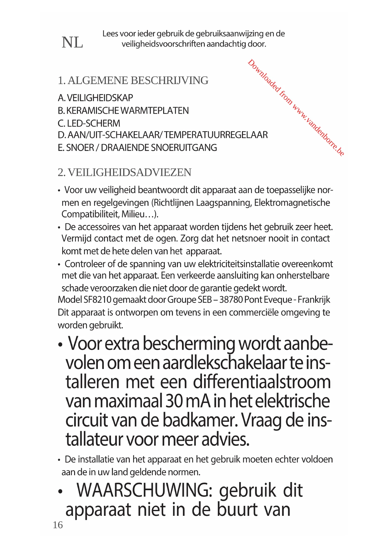 - Controleer of de spanning van uw elektriciteitsinstallatie overeenkomt met die van het apparaat. Een verkeerde aansluiting kan onherstelbare schade veroorzaken die niet door de garantie gedekt wordt. Model SF8210 gemaakt door Groupe SEB – 38780 Pont Eveque - Frankrijk Dit apparaat is ontworpen om tevens in een commerciële omgeving te worden gebruikt.