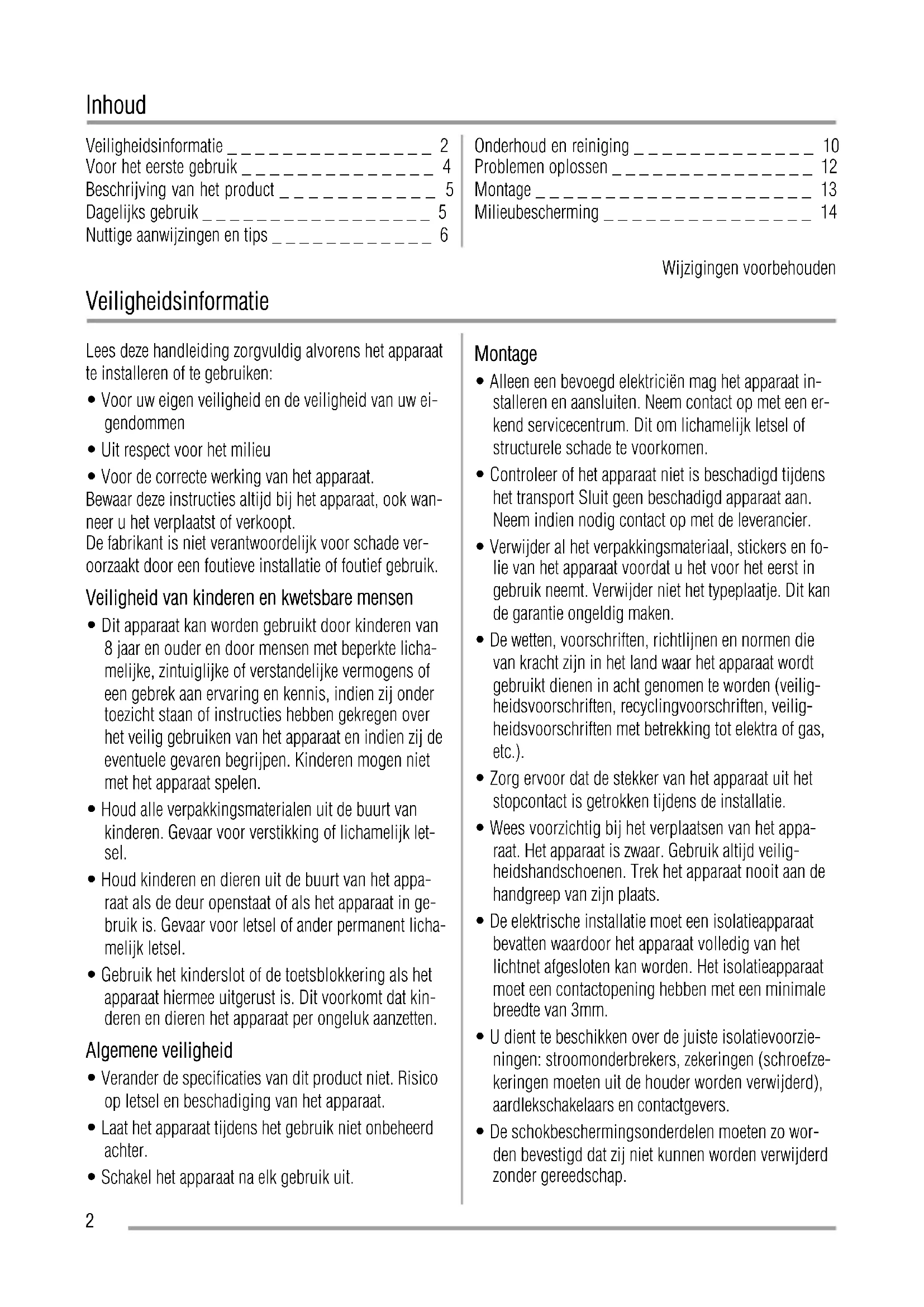 Benutzerinformation 40 Oven Oven Four Backofen ZOB 365Inhoud Veiligheidsinformatie _ _ _ _ _ _ _ _ _ _ _ _ _ _ _ 2 Voor het eerste gebruik _ _ _ _ _ _ _ _ _ _ _ _ _ _ 4 Beschrijving van het product _ _ _ _ _ _ _ _ _ _ _ 5 Dagelijks gebruik _ _ _ _ _ _ _ _ _ _ _ _ _ _ _ _ _ 5 Nuttige aanwijzingen en tips _ _ _ _ _ _ _ _ _ _ _ _ 6 Onderhoud en reiniging _ _ _ _ _ _ _ _ _ _ _ _ _ 10 Problemen oplossen _ _ _ _ _ _ _ _ _ _ _ _ _ _ _ 12 Montage _ _ _ _ _ _ _ _ _ _ _ _ _ _ _ _ _ _ _ _ 13 Milieubescherming _ _ _ _ _ _ _ _ _ _ _ _ _ _ _ 14 Wijzigingen voorbehouden Veiligheidsinformatie Lees deze handleiding zorgvuldig alvorens het apparaat te installeren of te gebruiken: