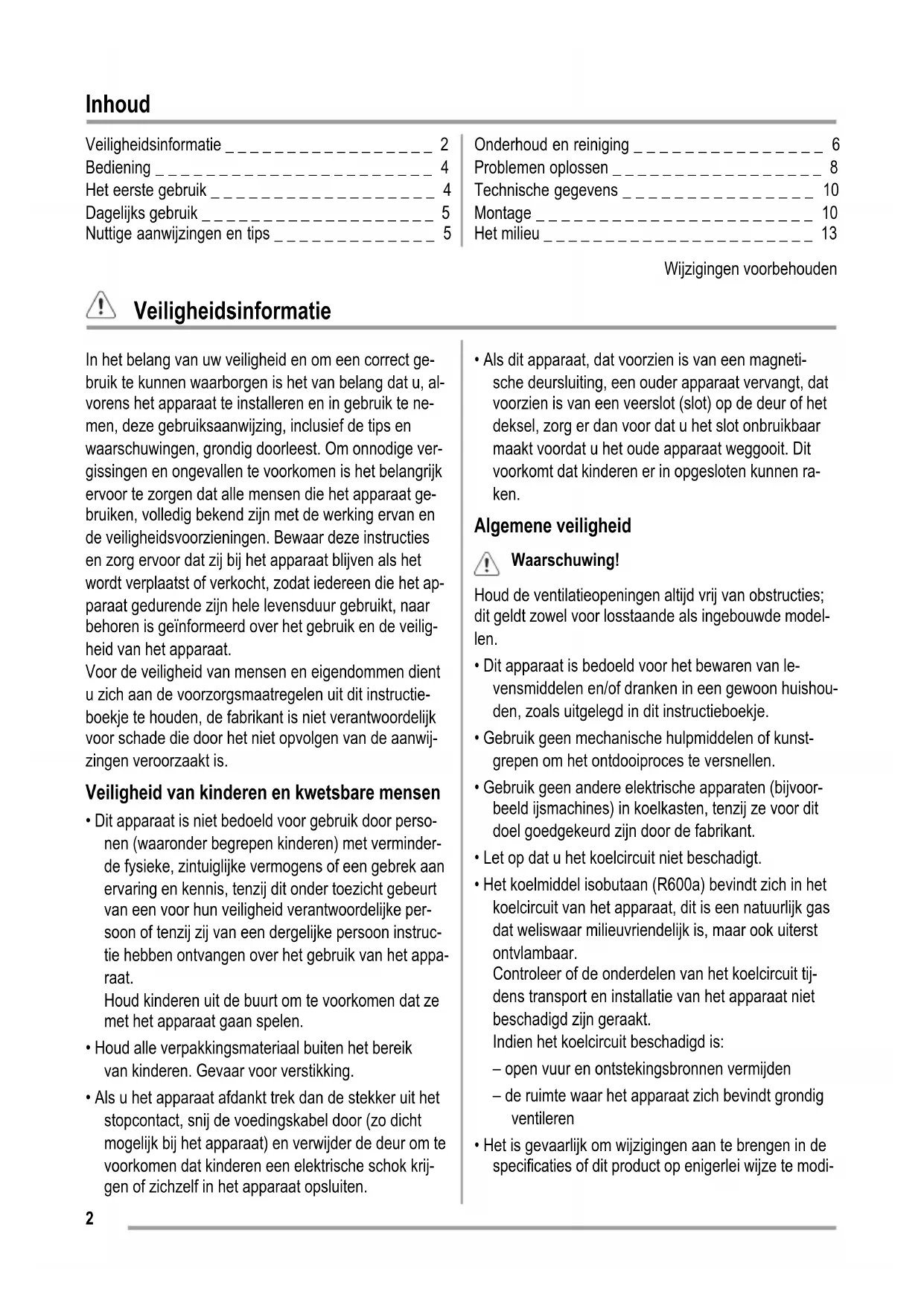- Als dit apparaat, dat voorzien is van een magneti- sche deursluiting, een ouder apparaat vervangt, dat voorzien is van een veerslot (slot) op de deur of het deksel, zorg er dan voor dat u het slot onbruikbaar maakt voordat u het oude apparaat weggooit. Dit voorkomt dat kinderen er in opgesloten kunnen ra- ken. Algemene veiligheid Waarschuwing! Houd de ventilatieopeningen altijd vrij van obstructies; dit geldt zowel voor losstaande als ingebouwde model- len.