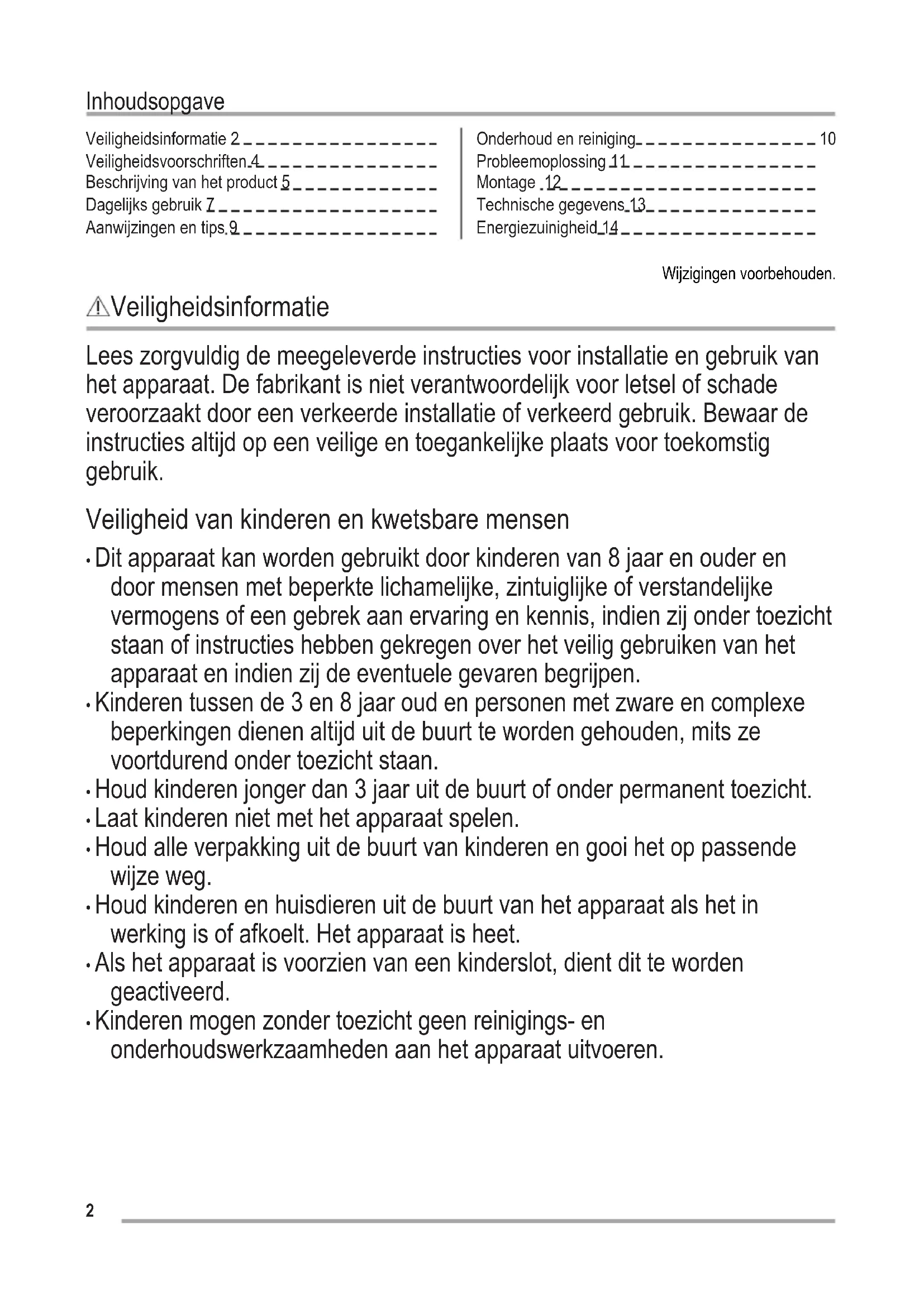 - Kinderen mogen zonder toezicht geen reinigings- en onderhoudswerkzaamheden aan het apparaat uitvoeren. 2Algemene veiligheid