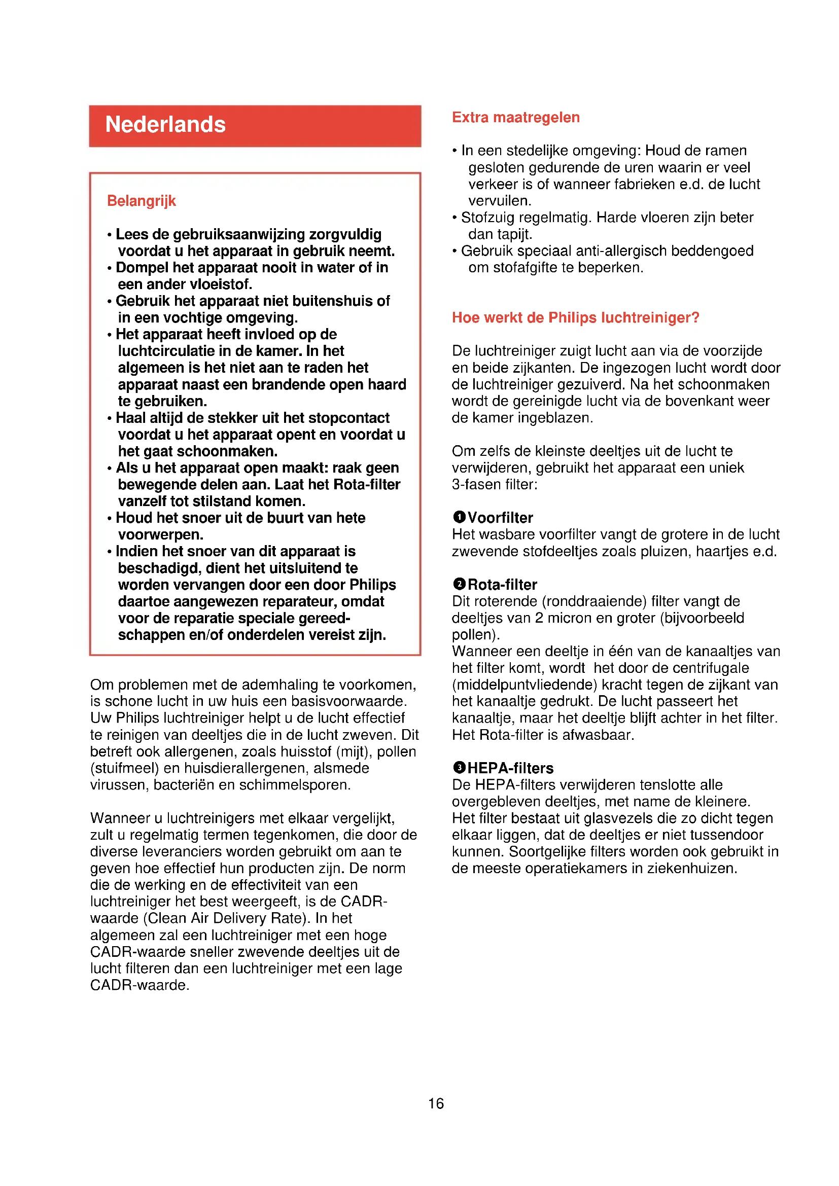 - Gebruik speciaal anti-allergisch beddengoed om stofafgifte te beperken. Hoe werkt de Philips luchtreiniger? De luchtreiniger zuigt lucht aan via de voorzijde en beide zijkanten. De ingezogen lucht wordt door de luchtreiniger gezuiverd. Na het schoonmaken wordt de gereinigde lucht via de bovenkant weer de kamer ingeblazen. Om zelfs de kleinste deeltjes uit de lucht te verwijderen, gebruikt het apparaat een uniek 3-fasen filter: 1 Voorfilter Het wasbare voorfilter vangt de grotere in de lucht zwevende stofdeeltjes zoals pluizen, haartjes e.d. 2 Rota-filter Dit roterende (ronddraaiende) filter vangt de deeltjes van 2 micron en groter (bijvoorbeeld pollen). Wanneer een deeltje in één van de kanaaltjes van het filter komt, wordt het door de centrifugale (middelpuntvliedende) kracht tegen de zijkant van het kanaaltje gedrukt. De lucht passeert het kanaaltje, maar het deeltje blijft achter in het filter. Het Rota-filter is afwasbaar. 3 HEPA-filters De HEPA-filters verwijderen tenslotte alle overgebleven deeltjes, met name de kleinere. Het filter bestaat uit glasvezels die zo dicht tegen elkaar liggen, dat de deeltjes er niet tussendoor kunnen. Soortgelijke filters worden ook gebruikt in de meeste operatiekamers in ziekenhuizen. Nederlands Om problemen met de ademhaling te voorkomen, is schone lucht in uw huis een basisvoorwaarde. Uw Philips luchtreiniger helpt u de lucht effectief te reinigen van deeltjes die in de lucht zweven. Dit betreft ook allergenen, zoals huisstof (mijt), pollen (stuifmeel) en huisdierallergenen, alsmede virussen, bacteriën en schimmelsporen. Wanneer u luchtreinigers met elkaar vergelijkt, zult u regelmatig termen tegenkomen, die door de diverse leveranciers worden gebruikt om aan te geven hoe effectief hun producten zijn. De norm die de werking en de effectiviteit van een luchtreiniger het best weergeeft, is de CADR- waarde (Clean Air Delivery Rate). In het algemeen zal een luchtreiniger met een hoge CADR-waarde sneller zwevende deeltjes uit de lucht filteren dan een luchtreiniger met een lage CADR-waarde.17 Algemene beschrijving (fig. 1)