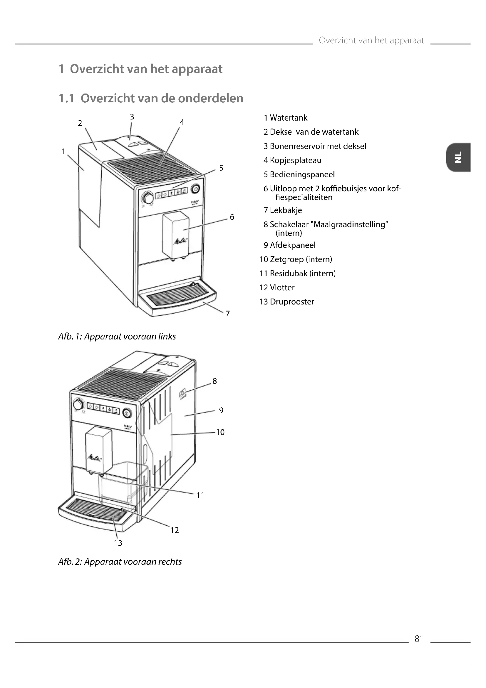 Afb. 2: Apparaat vooraan rechts 1 Watertank 2 Deksel van de watertank 3 Bonenreservoir met deksel 4 Kopjesplateau 5 Bedieningspaneel 6 Uitloop met 2 koebuisjes voor kof- especialiteiten 7 Lekbakje 8 Schakelaar "Maalgraadinstelling" (intern) 9 Afdekpaneel 10 Zetgroep (intern) 11 Residubak (intern) 12 Vlotter 13 DruproosterOverzicht van het apparaat
