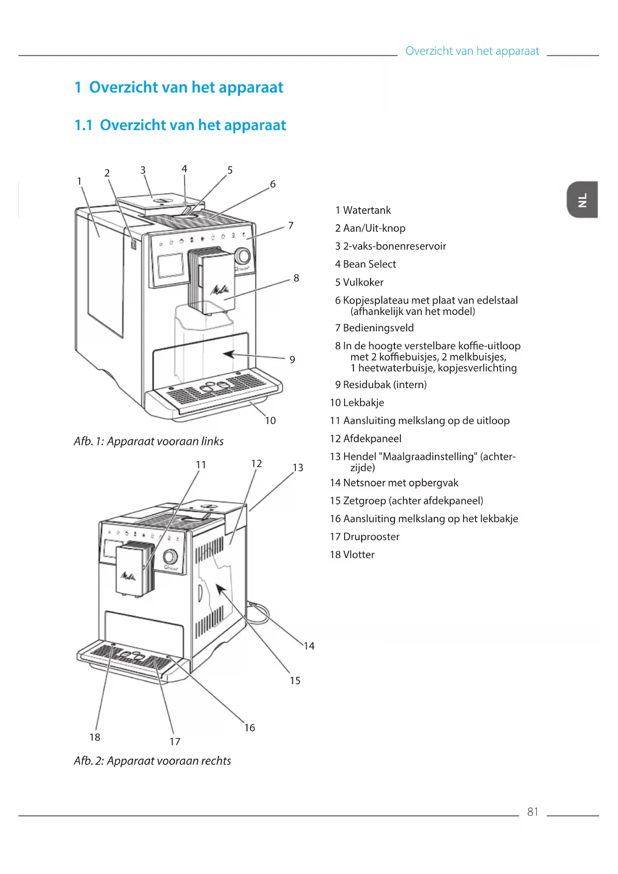 Afb. 2: Apparaat vooraan rechts 1 Watertank 2 Aan/Uit-knop 3 2-vaks-bonenreservoir 4 Bean Select 5 Vulkoker 6 Kopjesplateau met plaat van edelstaal (afhankelijk van het model) 7 Bedieningsveld 8 In de hoogte verstelbare koe-uitloop met 2 koebuisjes, 2 melkbuisjes, 1 heetwaterbuisje, kopjesverlichting 9 Residubak (intern) 10 Lekbakje 11 Aansluiting melkslang op de uitloop 12 Afdekpaneel 13 Hendel "Maalgraadinstelling" (achter- zijde) 14 Netsnoer met opbergvak 15 Zetgroep (achter afdekpaneel) 16 Aansluiting melkslang op het lekbakje 17 Druprooster 18 VlotterOverzicht van het apparaat