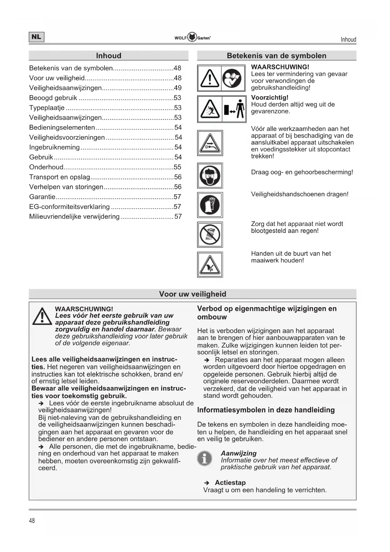 - Milieuvriendelijke verwijdering Betekenis van de symbolen WAARSCHUWING! Lees ter vermindering van gevaar voor verwondingen de gebruikshandleiding! Voorzichtig! Houd derden altijd weg uit de gevarenzone. Vóór alle werkzaamheden aan het apparaat of bij beschadiging van de aansluitkabel apparaat uitschakelen en voedingsstekker uit stopcontact trekken! Draag oog- en gehoorbescherming! Veiligheidshandschoenen dragen! Zorg dat het apparaat niet wordt blootgesteld aan regen! Handen uit de buurt van het maaiwerk houden! Voor uw veiligheid WAARSCHUWING! Lees vóór het eerste gebruik van uw apparaat deze gebruikshandleiding zorgvuldig en handel daarnaar. Bewaar deze gebruikshandleiding voor later gebruik of de volgende eigenaar. Lees alle veiligheidsaanwijzingen en instruc- ties. Het negeren van veiligheidsaanwijzingen en instructies kan tot elektrische schokken, brand en/ of ernstig letsel leiden. Bewaar alle veiligheidsaanwijzingen en instruc- ties voor toekomstig gebruik. Î Lees vóór de eerste ingebruikname absoluut de veiligheidsaanwijzingen! Bij niet-naleving van de gebruikshandleiding en de veiligheidsaanwijzingen kunnen beschadi- gingen aan het apparaat en gevaren voor de bediener en andere personen ontstaan. Î Alle personen, die met de ingebruikname, bedie- ning en onderhoud van het apparaat te maken hebben, moeten overeenkomstig zijn gekwali- ceerd. Verbod op eigenmachtige wijzigingen en ombouw Het is verboden wijzigingen aan het apparaat aan te brengen of hier aanbouwapparaten van te maken. Zulke wijzigingen kunnen leiden tot per- soonlijk letsel en storingen. Î Reparaties aan het apparaat mogen alleen worden uitgevoerd door hiertoe opgedragen en opgeleide personen. Gebruik hierbij altijd de originele reserveonderdelen. Daarmee wordt verzekerd, dat de veiligheid van het apparaat in stand wordt gehouden. Informatiesymbolen in deze handleiding De tekens en symbolen in deze handleiding moe- ten u helpen, de handleiding en het apparaat snel en veilig te gebruiken. Aanwijzing Informatie over het meest eectieve of praktische gebruik van het apparaat. Î Actiestap Vraagt u om een handeling te verrichten.Voor uw veiligheid p. 57