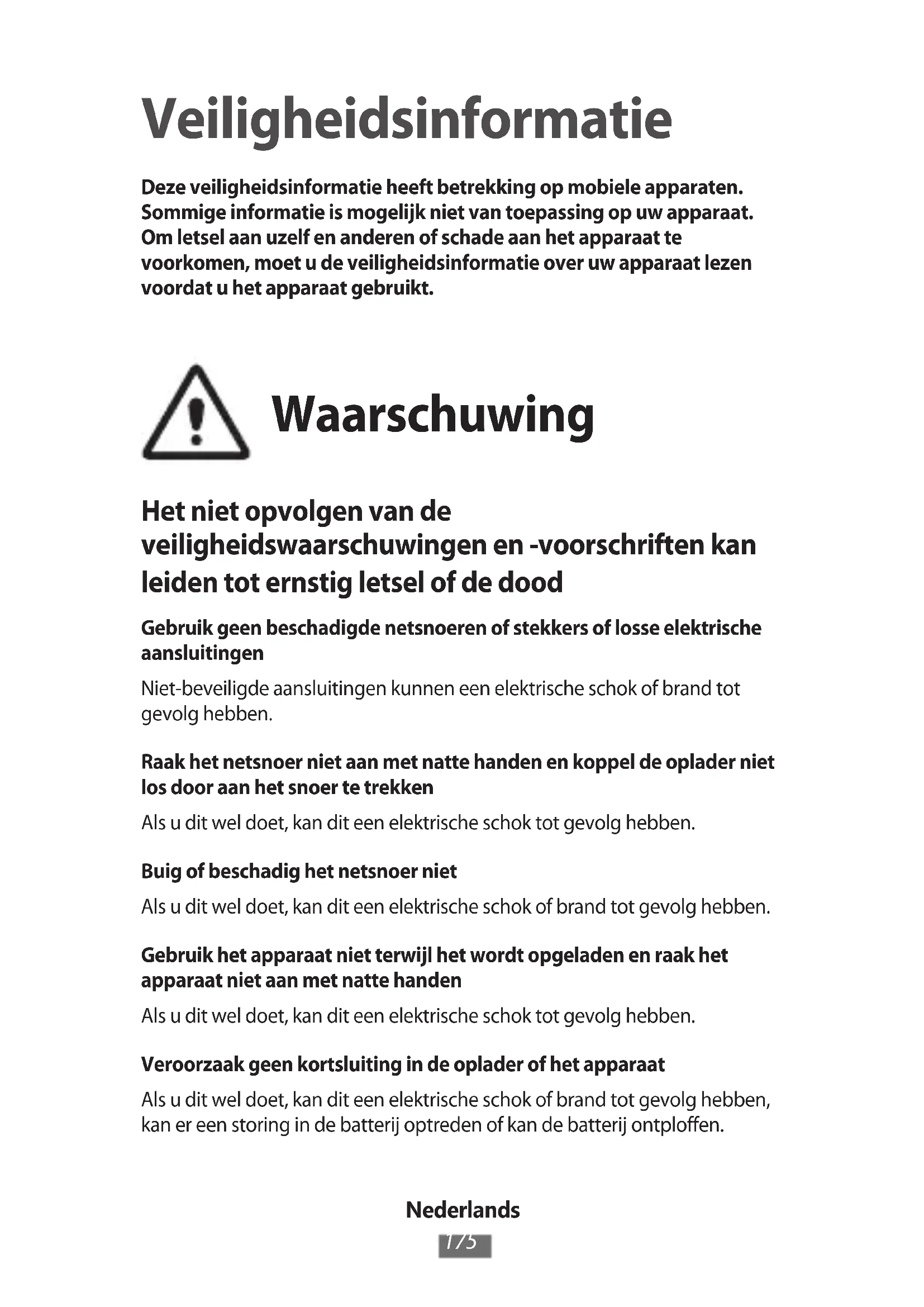 Veiligheidsinformatie Deze veiligheidsinformatie heeft betrekking op mobiele apparaten. Sommige informatie is mogelijk niet van toepassing op uw apparaat. Om letsel aan uzelf en anderen of schade aan het apparaat te voorkomen, moet u de veiligheidsinformatie over uw apparaat lezen voordat u het apparaat gebruikt. Waarschuwing Het niet opvolgen van de veiligheidswaarschuwingen en -voorschriften kan leiden tot ernstig letsel of de dood Gebruik geen beschadigde netsnoeren of stekkers of losse elektrische aansluitingenNiet-beveiligde aansluitingen kunnen een elektrische schok of brand tot gevolg hebben.Raak het netsnoer niet aan met natte handen en koppel de oplader niet los door aan het snoer te trekkenAls u dit wel doet, kan dit een elektrische schok tot gevolg hebben.Buig of beschadig het netsnoer nietAls u dit wel doet, kan dit een elektrische schok of brand tot gevolg hebben.Gebruik het apparaat niet terwijl het wordt opgeladen en raak het apparaat niet aan met natte handenAls u dit wel doet, kan dit een elektrische schok tot gevolg hebben.Veroorzaak geen kortsluiting in de oplader of het apparaatAls u dit wel doet, kan dit een elektrische schok of brand tot gevolg hebben, kan er een storing in de batterij optreden of kan de batterij ontploffen.Nederlands