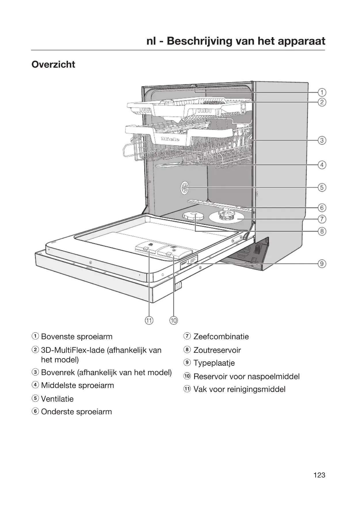 Accessoires Gebruik alleen originele Miele onderdelen. Als andere onderdelen worden aan- of ingebouwd, vervalt de aansprakelijkheid van Miele op basis van de garantie en/of de productaansprakelijkheid. Miele geeft u na afloop van de serieproductie van de vaatwasser een leveringsgarantie van maximaal 15jaar en minimaal 10jaar voor essentiële onderdelen. Transport Transporteer de vaatwasser uitsluitend rechtop, zodat er geen restwater in de elektrische besturing stroomt. Hierdoor kunnen sto- ringen worden veroorzaakt. Ruim de vaatwasser voorafgaand aan het transport uit en bevestig losse onderdelen, zoals korven, slangen en kabels. Als de veiligheidsinstructies en waarschuwingen niet worden op- gevolgd, kan Miele niet aansprakelijk worden gesteld voor schade die daarvan het gevolg is.nl - Eerste ingebruikneming