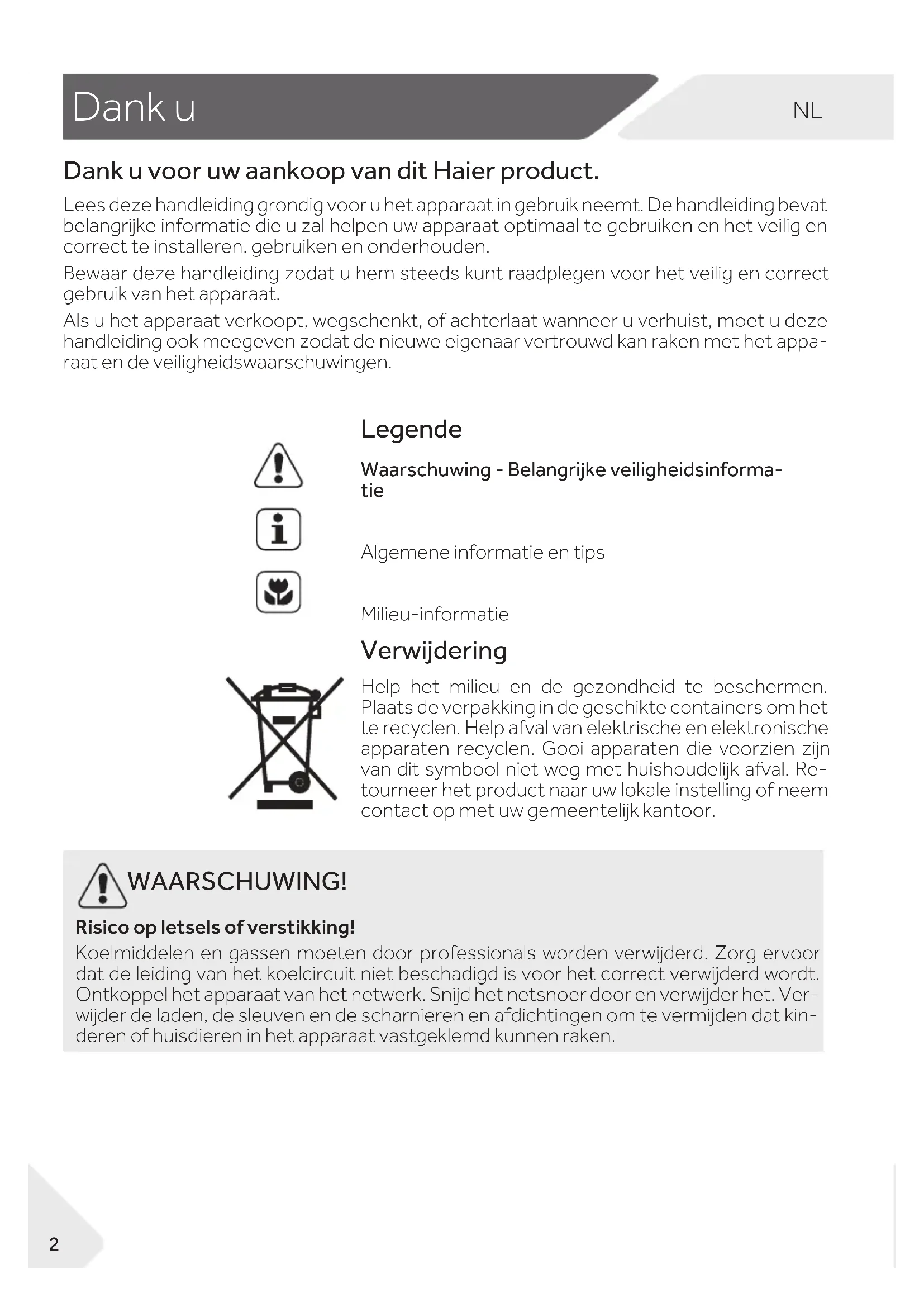 Legende Waarschuwing - Belangrijke veiligheidsinforma- tie Algemene informatie en tips Milieu-informatie Verwijdering Help het milieu en de gezondheid te beschermen. Plaats de verpakking in de geschikte containers om het te recyclen. Help afval van elektrische en elektronische apparaten recyclen. Gooi apparaten die voorzien zijn van dit symbool niet weg met huishoudelijk afval. Re- tourneer het product naar uw lokale instelling of neem contact op met uw gemeentelijk kantoor. Dank u voor uw aankoop van dit Haier product. Lees deze handleiding grondig voor u het apparaat in gebruik neemt. De handleiding bevat belangrijke informatie die u zal helpen uw apparaat optimaal te gebruiken en het veilig en correct te installeren, gebruiken en onderhouden. Bewaar deze handleiding zodat u hem steeds kunt raadplegen voor het veilig en correct gebruik van het apparaat. Als u het apparaat verkoopt, wegschenkt, of achterlaat wanneer u verhuist, moet u deze handleiding ook meegeven zodat de nieuwe eigenaar vertrouwd kan raken met het appa- raat en de veiligheidswaarschuwingen. WAARSCHUWING! Risico op letsels of verstikking! Koelmiddelen en gassen moeten door professionals worden verwijderd. Zorg ervoor dat de leiding van het koelcircuit niet beschadigd is voor het correct verwijderd wordt. Ontkoppel het apparaat van het netwerk. Snijd het netsnoer door en verwijder het. Ver- wijder de laden, de sleuven en de scharnieren en afdichtingen om te vermijden dat kin- deren of huisdieren in het apparaat vastgeklemd kunnen raken.