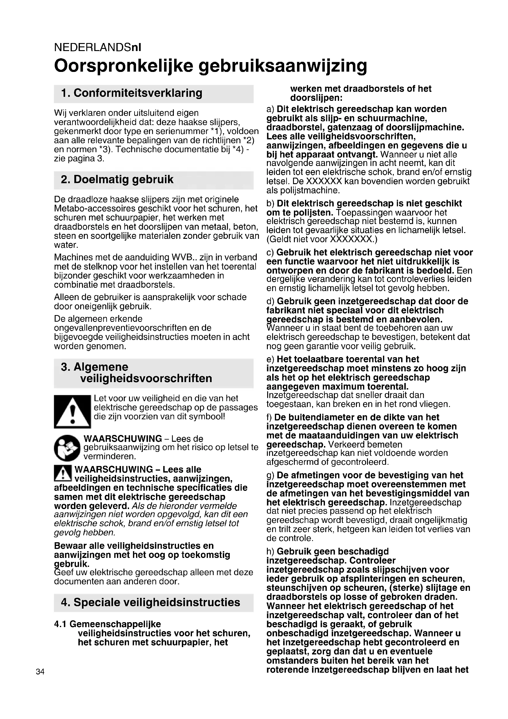 Oorspronkelijke gebruiksaanwijzing Wij verklaren onder uitsluitend eigen verantwoordelijkheid dat: deze haakse slijpers, gekenmerkt door type en serienummer *1), voldoen aan alle relevante bepalingen van de richtlijnen *2) en normen *3). Technische documentatie bij *4) - zie pagina 3. De draadloze haakse slijpers zijn met originele Metabo-accessoires geschikt voor het schuren, het schuren met schuurpapier, het werken met draadborstels en het doorslijpen van metaal, beton, steen en soortgelijke materialen zonder gebruik van water. Machines met de aanduiding WVB.. zijn in verband met de stelknop voor het instellen van het toerental bijzonder geschikt voor werkzaamheden in combinatie met draadborstels. Alleen de gebruiker is aansprakelijk voor schade door oneigenlijk gebruik. De algemeen erkende ongevallenpreventievoorschriften en de bijgevoegde veiligheidsinstructies moeten in acht worden genomen. Let voor uw veiligheid en die van het elektrische gereedschap op de passages die zijn voorzien van dit symbool! WAARSCHUWING – Lees de gebruiksaanwijzing om het risico op letsel te verminderen. WAARSCHUWING – Lees alle veiligheidsinstructies, aanwijzingen, afbeeldingen en technische specificaties die samen met dit elektrische gereedschap worden geleverd. Als de hieronder vermelde aanwijzingen niet worden opgevolgd, kan dit een elektrische schok, brand en/of ernstig letsel tot gevolg hebben. Bewaar alle veiligheidsinstructies en aanwijzingen met het oog op toekomstig gebruik. Geef uw elektrische gereedschap alleen met deze documenten aan anderen door.