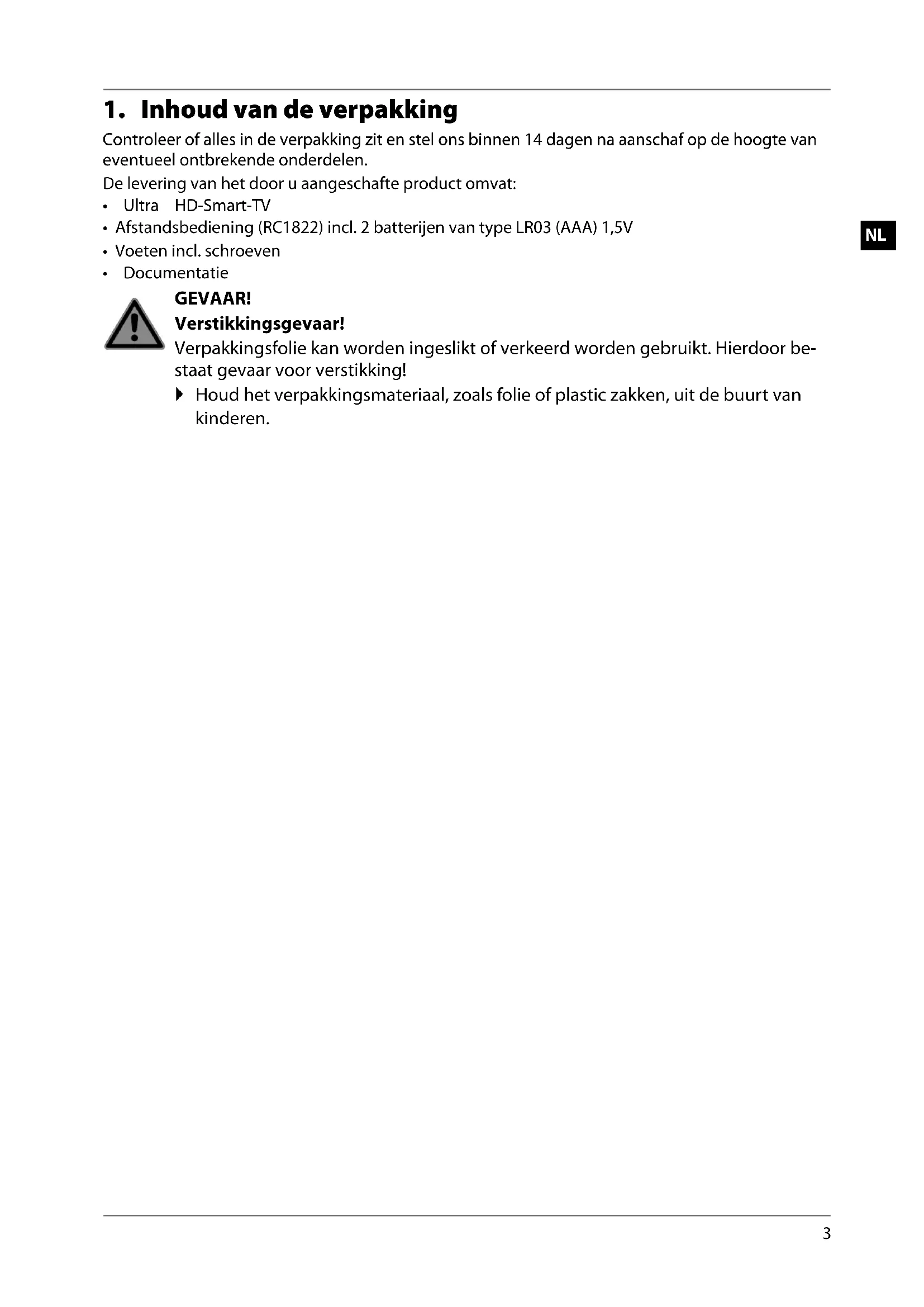- Bewaar het verpakkingsmateriaal goed en gebruik alleen dit om de televisie te vervoeren. GEVAAR! Verstikkingsgevaar! Verpakkingsfolie kan worden ingeslikt of verkeerd worden gebruikt. Hierdoor be- staat gevaar voor verstikking! Houd het verpakkingsmateriaal, zoals folie of plastic zakken, uit de buurt van kinderen. MD31451-5 ML eCom QSG 30031191_3_5_7_9 Final.indb 8MD31451-5 ML eCom QSG 30031191_3_5_7_9 Final.indb 8 13.01.2021 14:56:4313.01.2021 14:56:439
