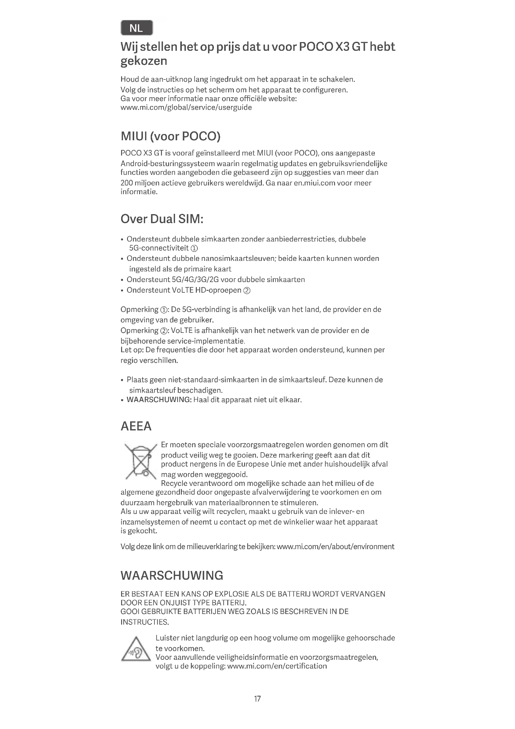 - WAARSCHUWING: Haal dit apparaat niet uit elkaar. AEEA Er moeten speciale voorzorgsmaatregelen worden genomen om dit product veilig weg te gooien. Deze markering gee aan dat dit product nergens in de Europese Unie met ander huishoudelijk afval mag worden weggegooid. Recycle verantwoord om mogelijke schade aan het milieu of de algemene gezondheid door ongepaste afvalverwijdering te voorkomen en om duurzaam hergebruik van materiaalbronnen te stimuleren. Als u uw apparaat veilig wilt recyclen, maakt u gebruik van de inlever- en inzamelsystemen of neemt u contact op met de winkelier waar het apparaat is gekocht. Volg deze link om de milieuverklaring te bekijken: www.mi.com/en/about/environment WAARSCHUWING ER BESTAAT EEN KANS OP EXPLOSIE ALS DE BATTERIJ WORDT VERVANGEN DOOR EEN ONJUIST TYPE BATTERIJ. GOOI GEBRUIKTE BATTERIJEN WEG ZOALS IS BESCHREVEN IN DE INSTRUCTIES. Luister niet langdurig op een hoog volume om mogelijke gehoorschade te voorkomen. Voor aanvullende veiligheidsinformatie en voorzorgsmaatregelen, volgt u de koppeling: www.mi.com/en/certification 17Belangrijke veiligheidsinformatie Lees alle veiligheidsinformatie voordat u het apparaat gebruikt:
