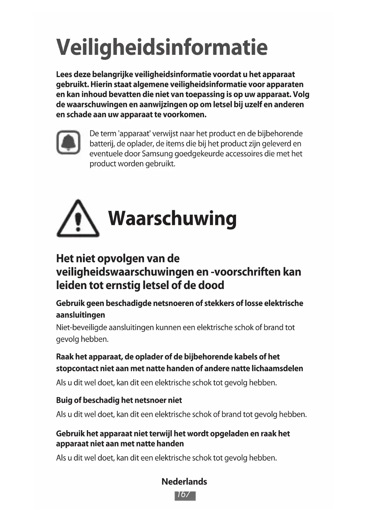 Veiligheidsinformatie Lees deze belangrijke veiligheidsinformatie voordat u het apparaat gebruikt. Hierin staat algemene veiligheidsinformatie voor apparaten en kan inhoud bevatten die niet van toepassing is op uw apparaat. Volg de waarschuwingen en aanwijzingen op om letsel bij uzelf en anderen en schade aan uw apparaat te voorkomen.De term 'apparaat' verwijst naar het product en de bijbehorende batterij, de oplader, de items die bij het product zijn geleverd en eventuele door Samsung goedgekeurde accessoires die met het product worden gebruikt. Waarschuwing Het niet opvolgen van de veiligheidswaarschuwingen en -voorschriften kan leiden tot ernstig letsel of de dood Gebruik geen beschadigde netsnoeren of stekkers of losse elektrische aansluitingenNiet-beveiligde aansluitingen kunnen een elektrische schok of brand tot gevolg hebben.Raak het apparaat, de oplader of de bijbehorende kabels of het stopcontact niet aan met natte handen of andere natte lichaamsdelenAls u dit wel doet, kan dit een elektrische schok tot gevolg hebben.Buig of beschadig het netsnoer nietAls u dit wel doet, kan dit een elektrische schok of brand tot gevolg hebben.Gebruik het apparaat niet terwijl het wordt opgeladen en raak het apparaat niet aan met natte handenAls u dit wel doet, kan dit een elektrische schok tot gevolg hebben.Nederlands