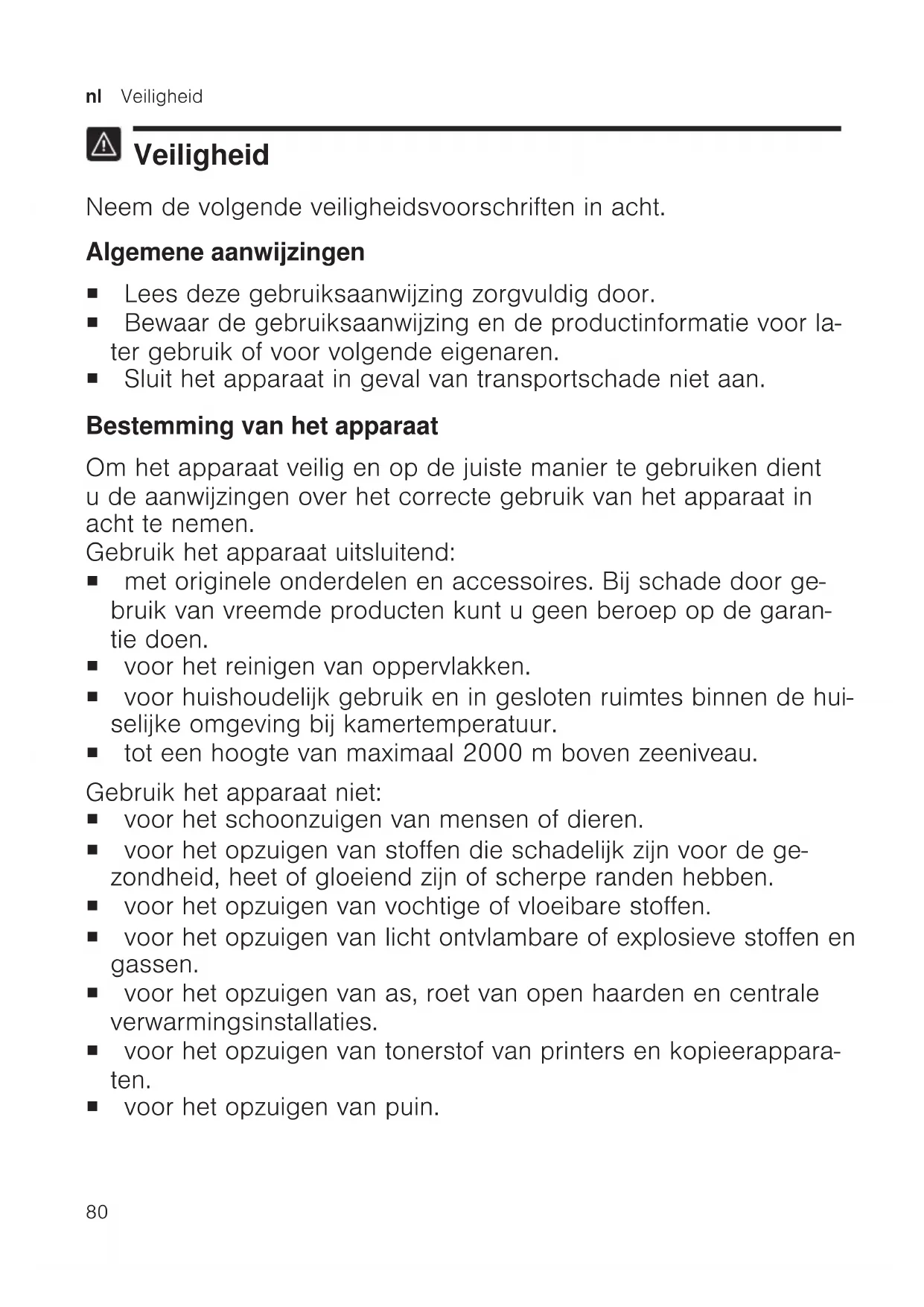 Veiligheid Neem de volgende veiligheidsvoorschriften in acht. Algemene aanwijzingen ¡ Lees deze gebruiksaanwijzing zorgvuldig door. ¡ Bewaar de gebruiksaanwijzing en de productinformatie voor la- ter gebruik of voor volgende eigenaren. ¡ Sluit het apparaat in geval van transportschade niet aan. Bestemming van het apparaat Om het apparaat veilig en op de juiste manier te gebruiken dient u de aanwijzingen over het correcte gebruik van het apparaat in acht te nemen. Gebruik het apparaat uitsluitend: ¡ met originele onderdelen en accessoires. Bij schade door ge- bruik van vreemde producten kunt u geen beroep op de garan- tie doen. ¡ voor het reinigen van oppervlakken. ¡ voor huishoudelijk gebruik en in gesloten ruimtes binnen de hui- selijke omgeving bij kamertemperatuur. ¡ tot een hoogte van maximaal 2000m boven zeeniveau. Gebruik het apparaat niet: ¡ voor het schoonzuigen van mensen of dieren. ¡ voor het opzuigen van stoffen die schadelijk zijn voor de ge- zondheid, heet of gloeiend zijn of scherpe randen hebben. ¡ voor het opzuigen van vochtige of vloeibare stoffen. ¡ voor het opzuigen van licht ontvlambare of explosieve stoffen en gassen. ¡ voor het opzuigen van as, roet van open haarden en centrale verwarmingsinstallaties. ¡ voor het opzuigen van tonerstof van printers en kopieerappara- ten. ¡ voor het opzuigen van puin.Veiligheid nl