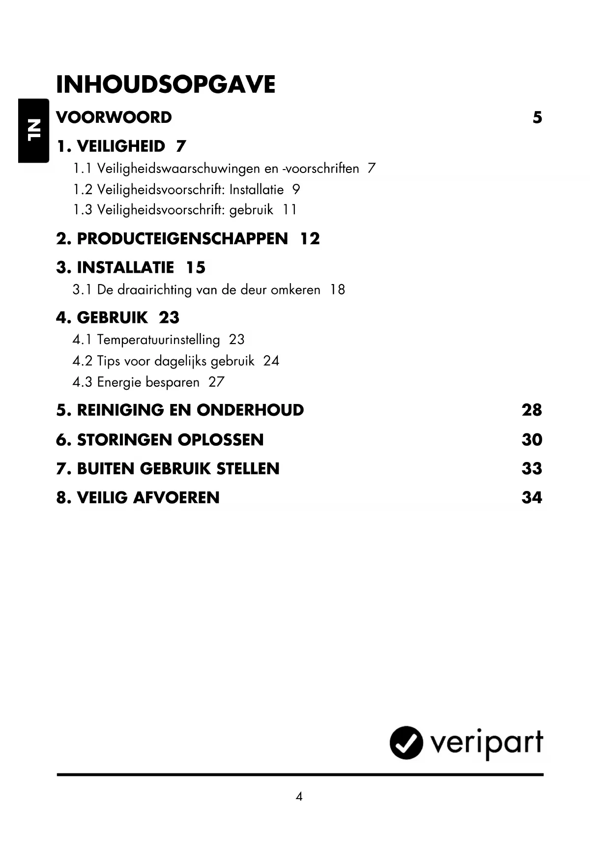 Auteursrecht De in deze handleiding afgebeelde gegevens, waaronder begrepen teksten, foto’s, grasche tekeningen, beeldmerken, (handels)namen en logo’s, zijn eigendom van Coolblue B.V. en worden beschermd door het auteursrecht, merkenrecht en/ of enig ander intellectueel eigendomsrecht, tenzij deze gegevens toebehoren aan een derde. Het is u nimmer toegestaan de inhoud van de handleiding geheel of gedeeltelijk te reproduceren, over te dragen, te verspreiden, te bewaren of tegen vergoeding beschikbaar te stellen aan derden, zonder de voorafgaande schriftelijke toestemming van Coolblue B.V. en/of de derde waar de gegevens aan toebehoren. Contactgegevens Veripart Veripart is een geregistreerd merk van Coolblue B.V. De klantenservice kunt u bereiken via: https://www.coolblue.nl/klantenservice OPMERKING!