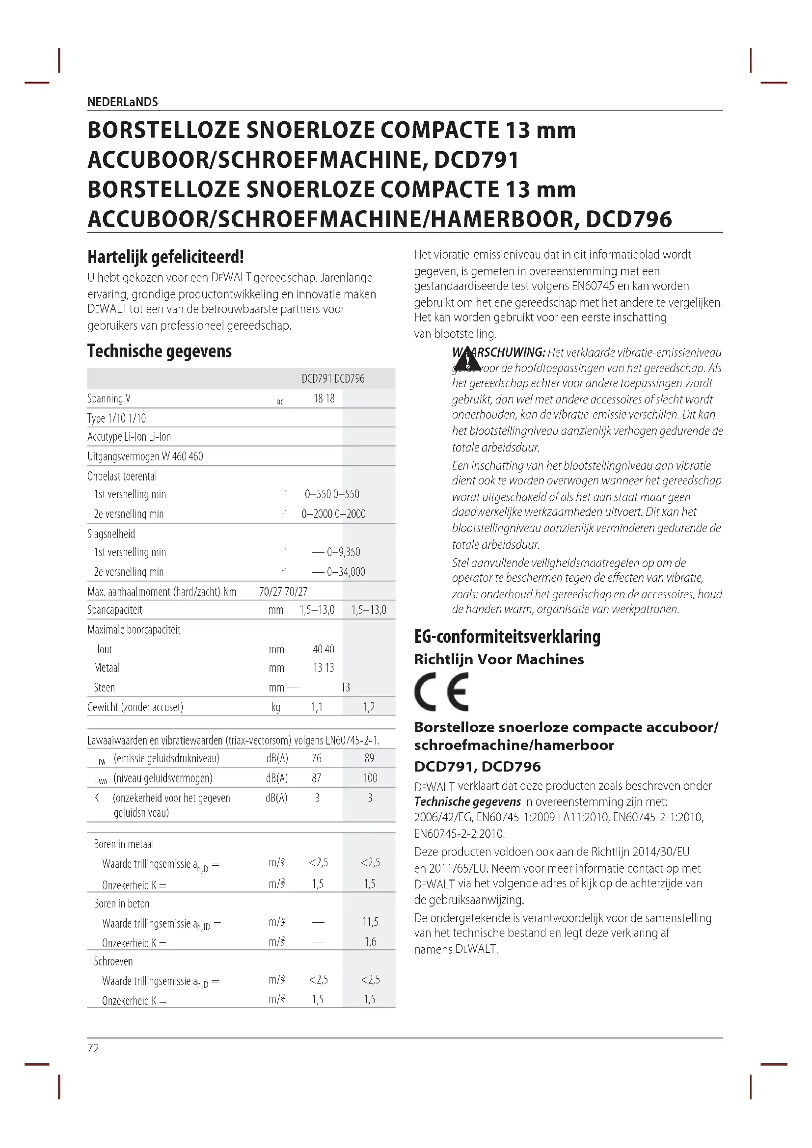 WAARSCHUWING: Het verklaarde vibratie-emissieniveau geldt voor de hoofdtoepassingen van het gereedschap. Als het gereedschap echter voor andere toepassingen wordt gebruikt, dan wel met andere accessoires of slecht wordt onderhouden, kan de vibratie-emissie verschillen. Dit kan het blootstellingniveau aanzienlijk verhogen gedurende de totalearbeidsduur. Een inschatting van het blootstellingniveau aan vibratie dient ook te worden overwogen wanneer het gereedschap wordt uitgeschakeld of als het aan staat maar geen daadwerkelijke werkzaamheden uitvoert. Dit kan het blootstellingniveau aanzienlijk verminderen gedurende de totalearbeidsduur. Stel aanvullende veiligheidsmaatregelen op om de operator te beschermen tegen de effecten van vibratie, zoals: onderhoud het gereedschap en de accessoires, houd de handen warm, organisatie vanwerkpatronen. EG-conformiteitsverklaring Richtlijn Voor Machines Borstelloze snoerloze compacte accuboor/ schroefmachine/hamerboor DCD791, DCD796 DEWALT verklaart dat deze producten zoals beschreven onder Technische gegevens in overeenstemming zijn met: 2006/42/EG, EN60745-1:2009+A11:2010, EN60745-2-1:2010, EN60745-2-2:2010. Deze producten voldoen ook aan de Richtlijn 2014/30/EU en 2011/65/EU. Neem voor meer informatie contact op met DEWALT via het volgende adres of kijk op de achterzijde van degebruiksaanwijzing. De ondergetekende is verantwoordelijk voor de samenstelling van het technische bestand en legt deze verklaring af namens DEWALT