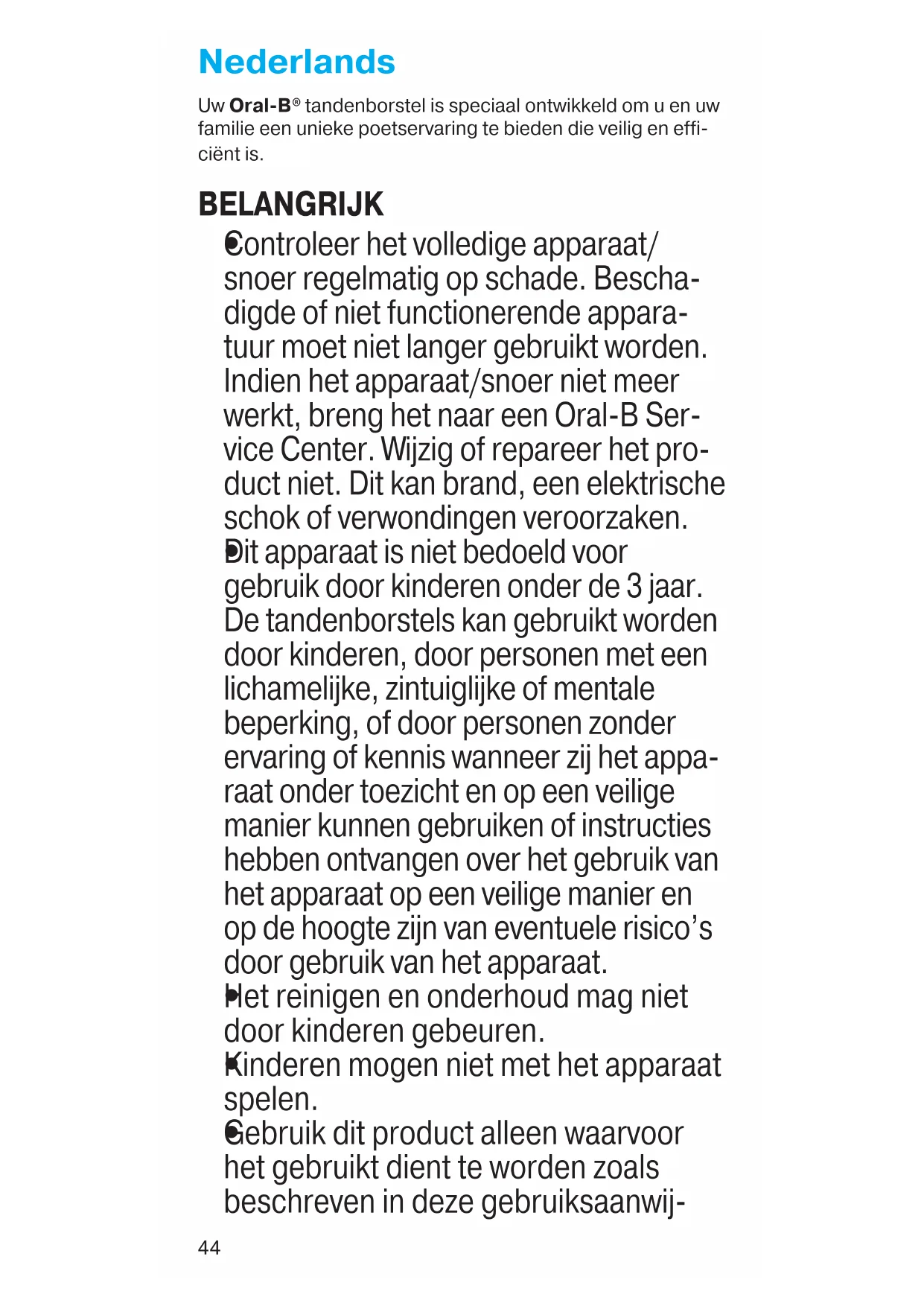 Controleer het volledige apparaat/ snoer regelmatig op schade. Bescha- digde of niet functionerende appara- tuur moet niet langer gebruikt worden. Indien het apparaat/snoer niet meer werkt, breng het naar een Oral-B Ser- vice Center. Wijzig of repareer het pro- duct niet. Dit kan brand, een elektrische schok of verwondingen veroorzaken.