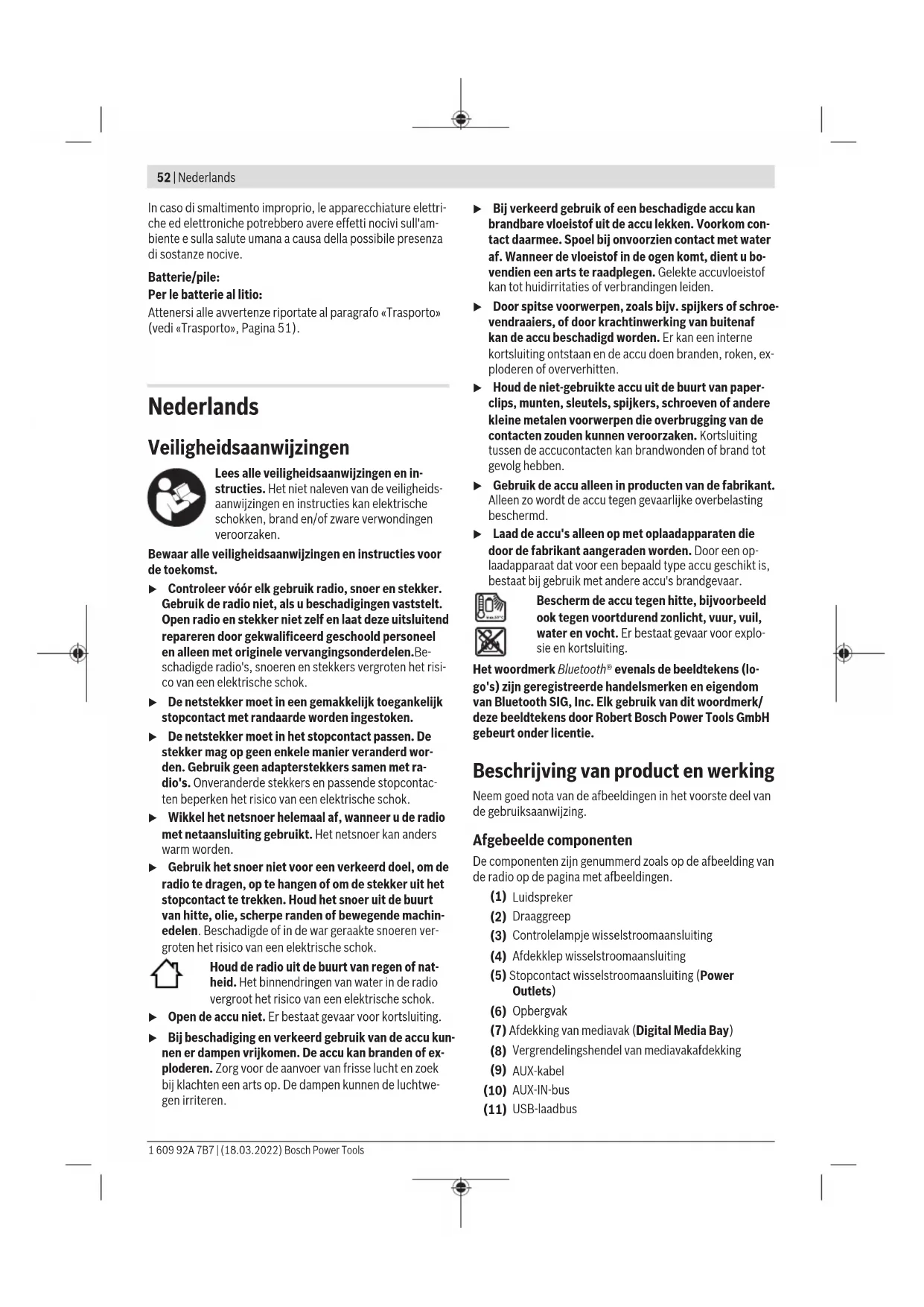 Isolatieklasse /Ⅰ /Ⅰ Aanbevolen omgevingstemperatuur bij het opladen °C 0…+35 0…+35 Toegestane omgevingstemperatuur bij het gebruik °C 0…+35 0…+35 Toegestane omgevingstemperatuur bij opslag °C −20…+50 −20…+50 Aanbevolen accu's GBA 18V… ProCORE18V… GBA 18V… ProCORE18V… Aanbevolen oplaadapparaten GAL 18… GAX 18… GAL 36… GAL 18… GAX 18… GAL 36… A) Afhankelijk van gebruikte accu Energievoorziening radio De energievoorziening van de radio kan via de netaansluiting of via een Li-Ion-accu(26) plaatsvinden. Als de accu voor energievoorziening dient, dan staan alleen de functies audiomodus en energievoorziening van externe apparaten via de geïntegreerde USB-aansluiting ter beschik- king. Bosch Power Tools 1 609 92A 7B7 | (18.03.2022)54 | Nederlands Werking op netstroom u Let op de netspanning! De spanning van de stroombron moet overeenkomen met de gegevens op het typeplaatje van de radio. Met 230V aangeduide radio's kunnen ook met 220V worden gebruikt. Werking met accu u Gebruik alleen de in de technische gegevens vermelde oplaadapparaten. Alleen deze oplaadapparaten zijn af- gestemd op de Li-Ion-accu die bij uw radio moet worden gebruikt. Aanwijzing: Het gebruik van accu's die niet geschikt zijn voor uw radio, kan leiden tot storingen of beschadiging van de radio. De Li-Ion-accu is door de „Electronic Cell Protection (ECP)“ tegen diepontlading beschermd. Als de accu leeg is, wordt de radio door een veiligheidsschakeling uitgeschakeld. u Schakel de radio niet opnieuw in, nadat deze door de veiligheidsschakeling werd uitgeschakeld. De accu kan anders beschadigd worden. Accu vervangen Open de vergrendelingshendel(28) van de accuafdekking en klap de accuafdekking(27) open. Voor het verwijderen van de accu drukt u op de accu- ontgrendelingstoets(25) en trekt u de accu uit het accuvak. Gebruik daarbij geen geweld. Voor het plaatsen van de accu schuift u deze zodanig in de accuhouder(29) dat de aansluitingen van de accu op de aansluitingen van de accuhouder liggen. Laat de accu vast- klikken. Sluit de accuafdekking(27) en vergrendel deze. Accu-oplaadaanduiding Bij geplaatste accu kunt u de laadtoestand van de accu(26) op het display zien, bij weggenomen accu op de accu zelf. Accu-oplaadaanduiding op het display De accu-oplaadaanduiding(b) verschijnt op het display zo- dra een accu met voldoende spanning geplaatst en de radio niet met het elektriciteitsnet verbonden is. Aanduiding Capaciteit 80−100 % 60−80 % 40−60 % 20−40 % 5−20 % 0−5 % Accu-oplaadaanduiding op de accu Als de accu uit de radio wordt genomen, kan de laadtoestand door de groene LED's van de oplaadaanduiding op de accu worden aangegeven. Druk op de toets voor de oplaadaanduiding of , om de laadtoestand aan te geven. Als er na het drukken op de toets voor de oplaadaanduiding geen LED brandt, dan is de accu defect en moet vervangen worden. Accutype GBA 18V... LED's Capaciteit Permanent licht 3× groen 60−100% Permanent licht 2× groen 30−60% Permanent licht 1× groen 5−30% Knipperlicht 1× groen 0−5% Accutype ProCORE18V... LED's Capaciteit Permanent licht 5× groen 80−100 % Permanent licht 4× groen 60−80 % Permanent licht 3× groen 40−60 % Permanent licht 2× groen 20−40 % Permanent licht 1× groen 5−20 % Knipperlicht 1× groen 0−5 % Bufferbatterijen plaatsen/vervangen Voor het opslaan van tijd en andere instellingen bij de radio moeten bufferbatterijen worden geplaatst. Hiervoor wordt het gebruik van alkalinebatterijen geadviseerd. Open de vergrendelingshendel(28) van de accuafdekking en klap de accuafdekking(27) open. Verwijder eventueel de accu(26). Voor het openen van de batterijvakafdekking(24) drukt u op de vergrendeling(23) en verwijdert u de batterijvakafdek- king. Plaats de meegeleverde bufferbatterijen. Let er hierbij op dat de polen juist worden geplaatst volgens de afbeelding op de binnenkant van het batterijvak. Breng de batterijvakafdekking(24) weer aan. "REPLACE AA BATTERY WHEN UNIT NOLONGER KEEPS CORRECT TIME": Vervang de bufferbatterijen, wanneer de tijd op de radio niet meer wordt opgeslagen. Vervang altijd alle batterijen tegelijk. Gebruik alleen batterij- en van één fabrikant en met dezelfde capaciteit. u Haal de bufferbatterijen uit de radio, wanneer u deze langere tijd niet gebruikt. De bufferbatterijen kunnen bij een langere opslagduur in de radio corroderen en zichzelf ontladen. 1 609 92A 7B7 | (18.03.2022) Bosch Power ToolsNederlands | 55 Gebruik u Bescherm de radio tegen direct contact met water. Het binnendringen van water in de radio vergroot het risi- co van een elektrische schok. u Houd de afdekkingen van accuvak, mediavak en wis- selstroomaansluitingen indien mogelijk gesloten. De gesloten afdekkingen beschermen de radio tegen water en stof. Audiomodus In-/uitschakelen Voor het inschakelen van de radio drukt u op de aan/uit- toets(15). Het display(16) wordt geactiveerd en de audio- bron die bij de laatste keer uitschakelen van de radio was in- gesteld, wordt afgespeeld. Om de radio uit te schakelen drukt u opnieuw op de aan/uit- toets(15). De actuele instelling van de audiobron wordt op- geslagen. Geluidsvolume instellen Na het inschakelen van de radio is altijd een laag volume in- gesteld. Voor het verhogen van het volume draait u de Clock- knop(14) (GPB18V‑5C) of de Menu-knop(22) (GPB18V‑5SC) rechtsom, voor het verlagen van het volu- me linksom. De volume-instelling verschijnt met de waarde tussen 0 en 30 op het display. Zet het volume vóór het instellen of wisse- len van een radiozender op een lage waarde, vóór het starten van een externe audiobron op een gemiddelde waarde. Voor het uitschakelen van het geluid kunt u kort op de Mute- toets(12) drukken. Op het display verschijnt de aanduiding geluid dempen(f). Om het geluid weer in te schakelen, drukt u opnieuw kort op de Mute-toets of draait u de Clock-knop(14) (GPB18V‑5C) of de Menu-knop(22) (GPB18V‑5SC) rechtsom. Klank instellen Voor een optimale audioweergave is
