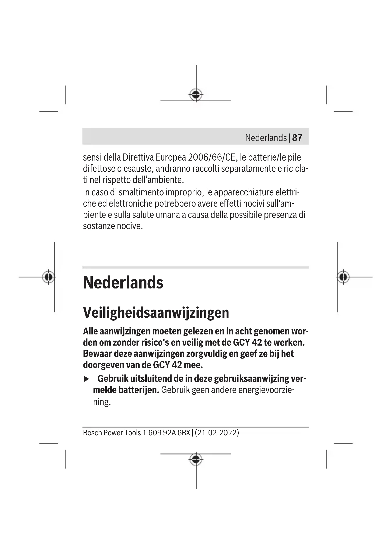 Het bereik kan afhankelijk van externe omstandigheden, met inbegrip van de gebruikte ontvanger, sterk variëren. Binnen gesloten ruimten en door metalen barrières (bijv. muren, schappen, koffers enz.) kan het Bluetooth®-bereik duidelijk geringer zijn. Systeemvereisten GCY 42 Mobiel eindapparaat (ta- blet, smartphone) Android 6.0 (en hoger) iOS 11 (en hoger) 1 609 92A 6RX | (21.02.2022) Bosch Power ToolsNederlands | 93 Montage en gebruik Energievoorziening u Verwijder de afdekking voor de Bluetooth® Low Energy Module GCY 42 op het elektrische gereedschap, bijv. met een schroevendraaier of een groot muntstuk. Door het gebruik van ongeschikte voorwerpen kan de elektronica of de afdekking beschadigd worden. – Volg voor de ingebruikname na aankoop of vervangen van de batterij (1) de handelingen op de pagina's met afbeel- dingen. Neem daarbij goed nota van de volgende aanwijzin- gen. Eerste ingebruikname (zie afbeeldingen A1–A5) Aanwijzing: Bewaar de plaatshouder (3) van de GCY42 goed. Breng de plaatshouder weer aan, wanneer u het elektrische gereedschap zonder GCY 42 doorgeeft. Plaats de batterij (1) met de pluspool naar boven in de GCY 42 (2). Het is niet nodig om de batterij erin te drukken; de bat- terij klikt niet vanzelf vast. Deze wordt pas bij het sluiten van de afdekking op de daarvoor bestemde positie vastgezet. Bosch Power Tools 1 609 92A 6RX | (21.02.2022)94 | Nederlands Om de GCY42 na het plaatsen te initialiseren, bedient u de aan/uit-schakelaar van het elektrische gereedschap. Batterij vervangen (zie afbeeldingen B1–B4) Pak de lege batterij (1) alleen met de vingers weg. Voordat de batterij helemaal leeg is, verschijnt in de app een waarschuwing. GCY 42 verwijderen (zie afbeeldingen C1–C2) Gebruik bij het verwijderen van de GCY42 (2) geen geweld. Gebruik geen spitse of scherpe gereedschappen. Aanwijzing: Draai eventueel het elektrische gereedschap om de GCY42 gemakkelijker te kunnen wegnemen. Ingebruikname Zodra de batterij (1) is geplaatst en de aan/uit-schakelaar op het elektrische gereedschap bediend wordt, zendt de GCY42 continu een signaal uit. Het Bluetooth®-signaal wordt pas on- derbroken, wanneer de batterij leeg of defect is of eruit ge- haald wordt. Meer informatie krijgt u direct in de app van Bosch. 1 609 92A 6RX | (21.02.2022) Bosch Power ToolsNederlands | 95 Installatie en instelling van de app Om de GCY42 te kunnen gebruiken, moet u eerst de app Bosch Toolbox installeren. – Download de app Bosch Toolbox via een dienovereenkom- stige app-store (Apple App Store, Google Play Store). Aanwijzing: Een gebruikersaccount bij de betreffende App- Store is noodzakelijk. – Selecteer vervolgens in de app het menupunt MyTools. – Het display van uw mobiele eindapparaat toont alle ver- volgstappen voor de verbinding van uw elektrische gereed- schap met het eindapparaat. Aanwijzing: Volg eerst de tutorial van de app helemaal. Daar- door krijgt u een beter overzicht van de verbindingsprocedure en het gebruik van de Connectivity-functies. Gegevensoverdracht via Bluetooth® De GCY42 heeft een regelmatig zendinterval. Afhankelijk van omgeving kunnen meerdere zendintervallen nodig zijn, voor- dat de GCY 42 herkend wordt. Mocht de GCY 42 niet herkend worden, controleer dan het volgende: Bosch Power Tools 1 609 92A 6RX | (21.02.2022)96 | Nederlands – Is de afstand tot het mobiele eindapparaat te groot? Verklein de afstand tussen mobiel eindapparaat en GCY 42. – Is de batterij te zwak of leeg? Vervang de batterij. – Schakel op uw mobiele apparaat Bluetooth® uit en weer in. Controleer of de GCY42 nu herkend wordt. Onderhoud en service Onderhoud en reiniging Verwijder vervuilingen met een kwastje. Gebruik geen reini- gings- of oplosmiddelen. Klantenservice en gebruiksadvies Onze klantenservice beantwoordt uw vragen over reparatie en onderhoud van uw product en over vervangingsonderdelen. Explosietekeningen en informatie over vervangingsonderdelen vindt u ook op: www.bosch-pt.com Het Bosch-gebruiksadviesteam helpt u graag bij vragen over onze producten en accessoires. 1 609 92A 6RX | (21.02.2022) Bosch Power ToolsNederlands | 97 Vermeld bij vragen en bestellingen van vervangingsonderdelen altijd het uit tien cijfers bestaande productnummer volgens het typeplaatje van het product. Nederland Tel.: (076) 579 54 54 Fax: (076) 579 54 94 E-mail: gereedschappen@nl.bosch.com Meer serviceadressen vindt u onder: www.bosch-pt.com/serviceaddresses Afvalverwijdering GCY 42-modules, accessoires en verpakkingen moeten op een milieuvriendelijke manier gerecycled worden. Gooi elektronische componenten en batterijen niet bij het huisvuil! Alleen voor landen van de EU: Volgens de Europese richtlijn 2012/19/EU inzake afgedankte elektrische en elektronische apparatuur en de implementatie in nationaal recht moeten niet meer bruikbare elektrische ge- reedschappen en volgens de Europese richtlijn 2006/66/EG moeten defecte of verbruikte accu’s/batterijen apart worden Bosch Power Tools 1 609 92A 6RX | (21.02.2022)98 | Dansk ingezameld en op een voor het milieu verantwoorde wijze wor- den gerecycled. Bij een verkeerde afvoer kunnen afgedankte elektrische en elektronische apparaten vanwege de mogelijke aanwezigheid van gevaarlijke stoffen schadelijke uitwerkingen op het milieu en de gezondheid van mensen hebben. Dansk Sikkerhedsinstrukser Samtlige anvisninger skal læses og overholdes for at kun- ne arbejde sikkert og risikofrit medGCY42. Gem anvisnin- gerne, og sørg for at levere dem med, hvisGCY42 gives vi- dere til andre. u Brug kun de batterier, der er anført i denne driftsvejled- ning. Brug ikke andre energikilder. ADVARSEL 1 609 92A 6RX | (21.02.2022) Bosch Power ToolsDansk | 99 Sørg for, at knapcellebatteriet er utilgænge- ligt for børn. Knapceller er farlige. u Knapceller må aldrig kommes i munden eller indføres i andre kropsåbninger. Hvis du har mistanke om, at knap- cellebatteriet er blevet slugt eller ført ind i en anden kropsåbning, skal du straks søge læge. En slugt k