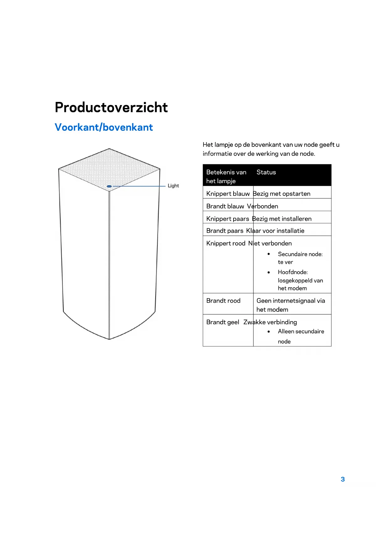 Zorg dat de stekker in het stopcontact zit en uw node is ingeschakeld. Houd de resetknop aan de onderkant ingedrukt. Het lampje op de bovenkant van de node wordt rood en gaat stapsgewijs uit. Laat de knop pas los als het lampje uit is gegaan en vervolgens helderrood is geworden.33 Specificaties Linksys Velop Productnaam