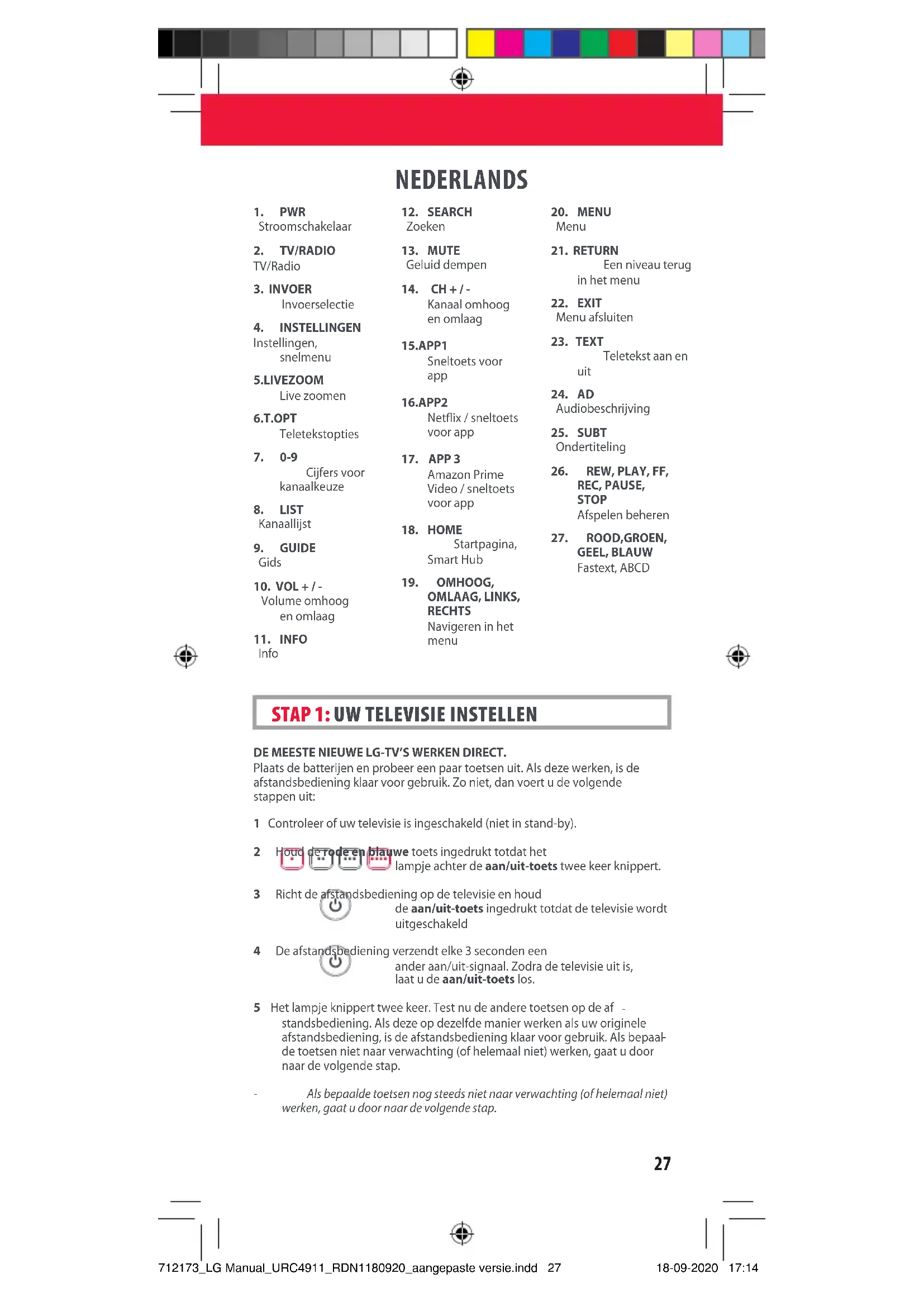 ripristinato. ITALIANO 712173_LG Manual_URC4911_RDN1180920_aangepaste versie.indd 26712173_LG Manual_URC4911_RDN1180920_aangepaste versie.indd 26 18-09-2020 17:1418-09-2020 17:1427 NEDERLANDS DE MEESTE NIEUWE LG-TV’S WERKEN DIRECT. Plaats de batterijen en probeer een paar toetsen uit. Als deze werken, is de afstandsbediening klaar voor gebruik. Zo niet, dan voert u de volgende stappen uit: 1 Controleer of uw televisie is ingeschakeld (niet in stand-by). 2 Houd de rode en blauwe toets ingedrukt totdat het lampje achter de aan/uit-toets twee keer knippert. 3 Richt de afstandsbediening op de televisie en houd de aan/uit-toets ingedrukt totdat de televisie wordt uitgeschakeld 4 De afstandsbediening verzendt elke 3 seconden een ander aan/uit-signaal. Zodra de televisie uit is, laat u de aan/uit-toets los. 5 Het lampje knippert twee keer. Test nu de andere toetsen op de af