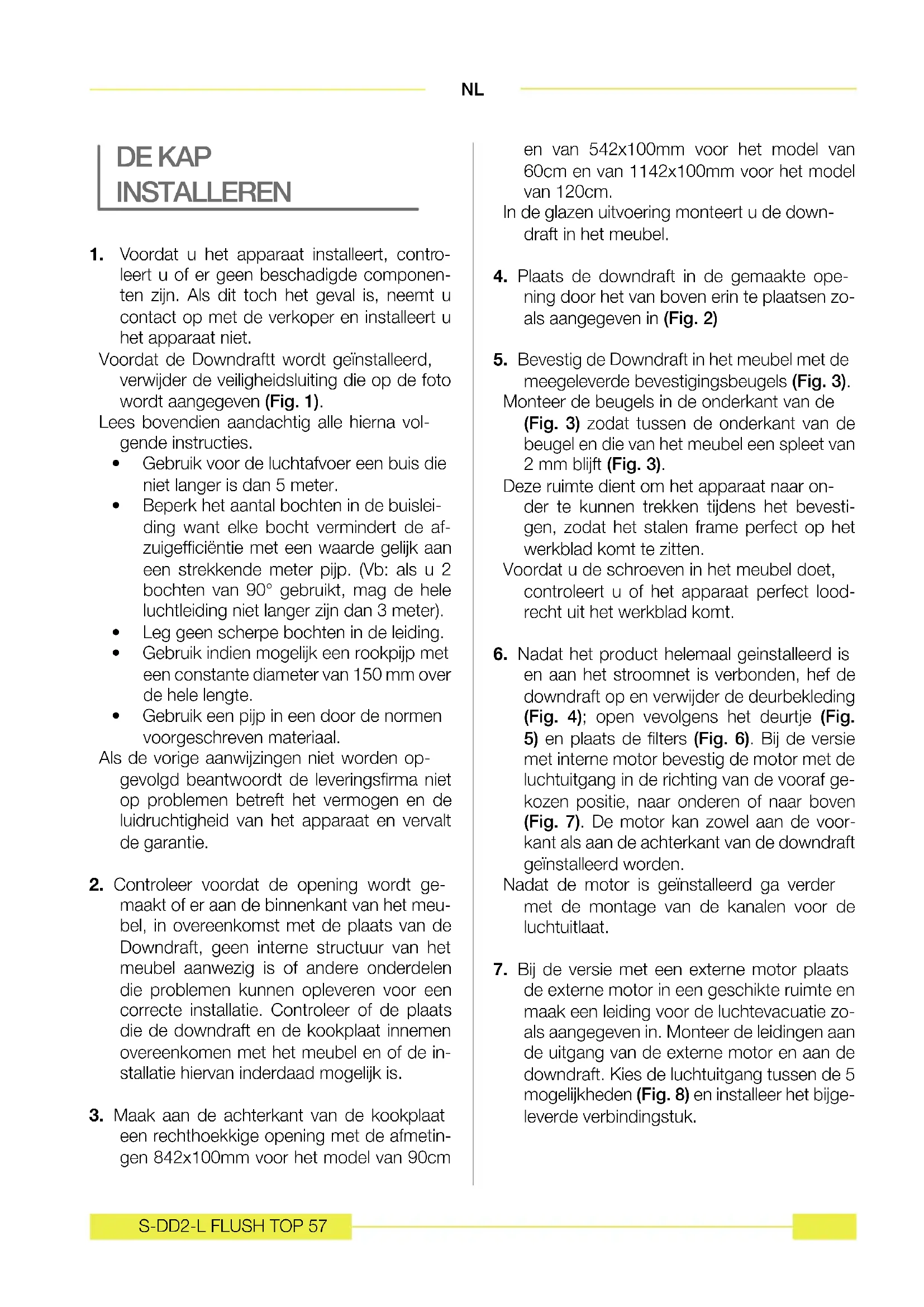 - OpdeDowndraftzittenveiligheidsschakelaars die het apparaat uitschakelen als het paneel vooraan op de filters wordt losgemaakt. Met de bedoeling om constant onze producten te verbeteren, behouden we ons het recht voor om de technische, functionele of esthetische kenmerken te veranderen die voortkomen uit in- novatie. Bij de versie externe motor moet voor het normale gebruik van de downdraft een ex- terne motor gebruikt worden van dezelfde fabri- kant. De verzamelde lucht mag niet geleid worden in een buis die wordt gebruikt voor het lossen van rook voor apparaten die met elektrische energie worden gevoed of met andere energie (centrale verwarmingsystemen enz.) Voor de lucht die af- gevoerd moet worden respecteer de voorschrif- ten van de plaatselijke autoriteit. WAARSCHUWING bewaar altijd deze gebruiksaanwijzing sa- men met de afzuigkap. Als het apparaat wordt verkocht of afgestaan aan anderen moet ze altijd vergezeld gaan van deze gebruiksaanwijzing. Wij bedanken u dat u deze aanwijzingen doorleest voordat u het apparaat gaat installeren en gebruiken. Deze aanwijzingen zijn speciaal opgesteld voor uw persoonlijke veiligheid en die van anderen.S-DD2-L FLUSH TOP 55