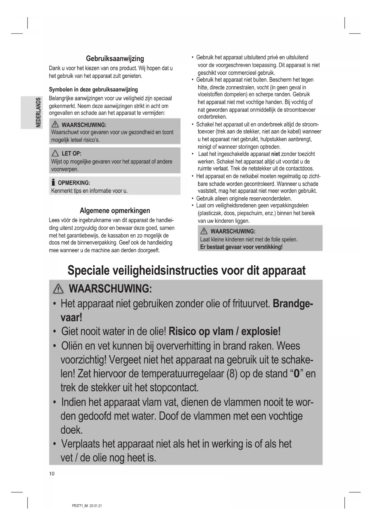 - Verplaats het apparaat niet als het in werking is of als het vet / de olie nog heet is.FR3771_IM 20.01.21