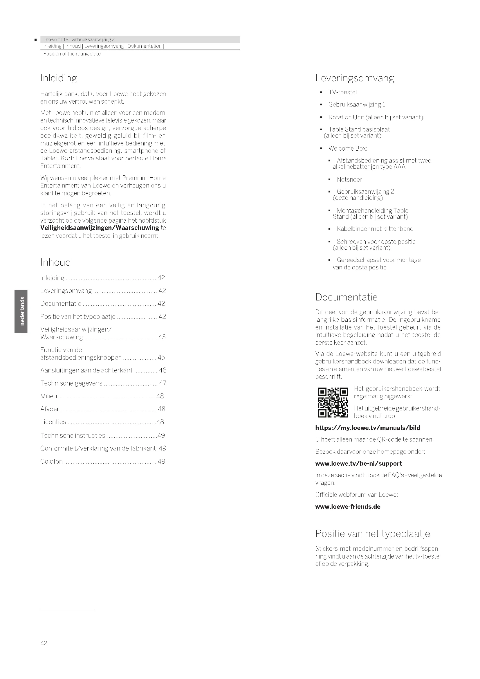 - Loewe bild v | Gebruiksaanwijzing 2 Inleiding | Inhoud | Leveringsomvang | Dokumentation | Position of the rating plate Inleiding Hartelijk dank, dat u voor Loewe hebt gekozen en ons uw vertrouwen schenkt. Met Loewe hebt u niet alleen voor een modern en technisch innovatieve televisie gekozen, maar ook voor tijdloos design, verzorgde scherpe beeldkwaliteit, geweldig geluid bij film- en muziekgenot en een intuïtieve bediening met de Loewe-afstandsbediening, smartphone of Tablet. Kort: Loewe staat voor perfecte Home Entertainment. Wij wensen u veel plezier met Premium Home Entertainment van Loewe en verheugen ons u klant te mogen begroeten. In het belang van een veilig en langdurig storingsvrij gebruik van het toestel, wordt u verzocht op de volgende pagina het hoofdstuk Veiligheidsaanwijzingen/Waarschuwing te lezen voordat u het toestel in gebruik neemt. Inhoud Inleiding p. 42