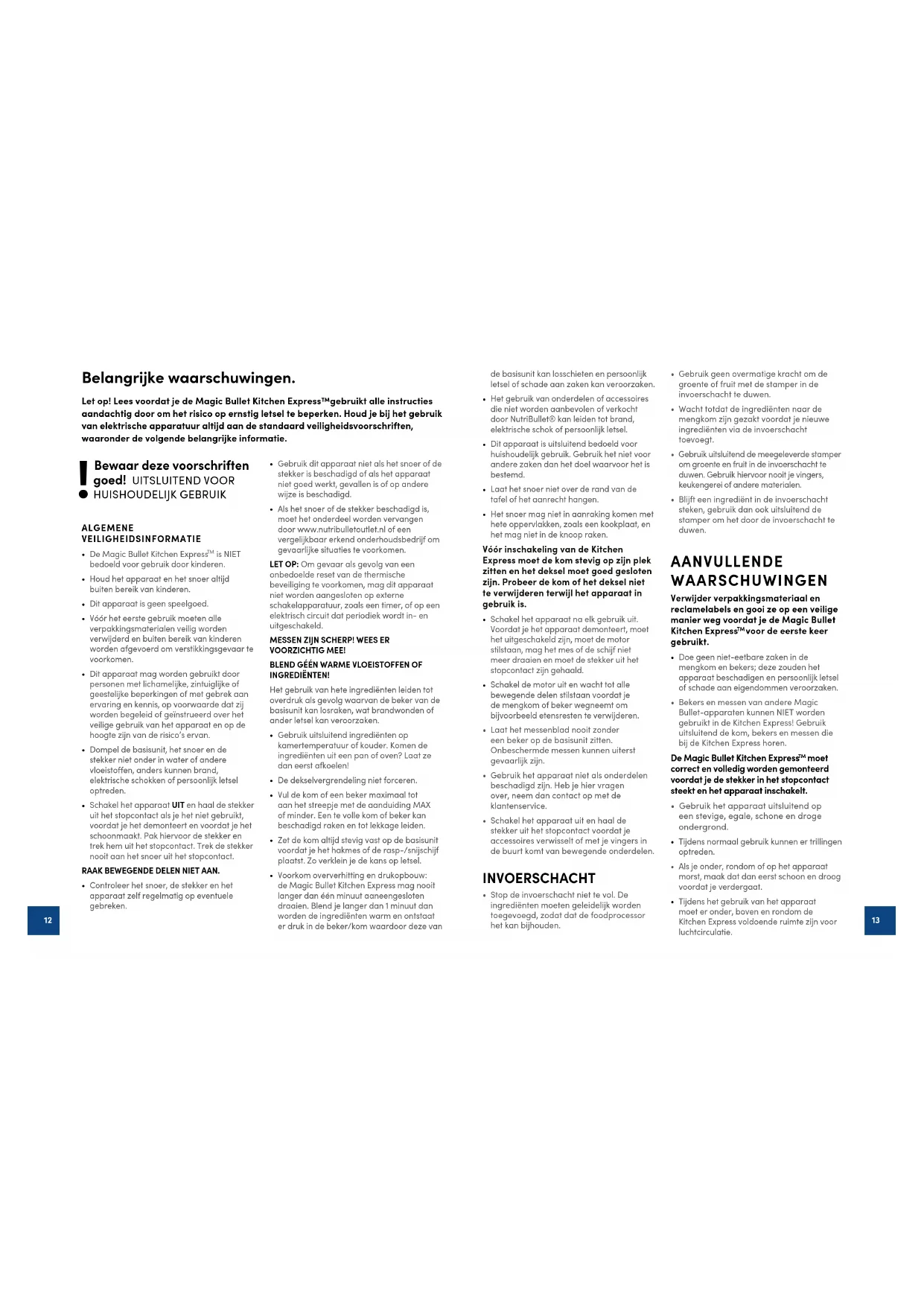 , de culinaire krachtpatser in klein formaat. Hij is gemakkelijker dan een traditionele foodprocessor, kleiner dan een blender en ook nog eens leuker dan allebei. We willen graag dat je ervaringen geweldig zijn dus vragen we je om deze handleiding zorgvuldig door te lezen voor (elk) gebruik. We zeggen niet dat je hiermee kunt toveren, maar we zeggen ook niet dat je er niet mee kunt toveren! Inhoud. How to find serial numberunder the Motor Base.1312 Bewaar deze voorschriften goed! UITSLUITEND VOOR HUISHOUDELIJK GEBRUIK ALGEMENE VEILIGHEIDSINFORMATIE De Magic Bullet Kitchen Express is NIET bedoeld voor gebruik door kinderen. Houd het apparaat en het snoer altijd buiten bereik van kinderen. Dit apparaat is geen speelgoed. Vóór het eerste gebruik moeten alle verpakkingsmaterialen veilig worden verwijderd en buiten bereik van kinderen worden afgevoerd om verstikkingsgevaar te voorkomen. Dit apparaat mag worden gebruikt door personen met lichamelijke, zintuiglijke of geestelijke beperkingen of met gebrek aan ervaring en kennis, op voorwaarde dat zij worden begeleid of geïnstrueerd over het veilige gebruik van het apparaat en op de hoogte zijn van de risico’s ervan. Dompel de basisunit, het snoer en de stekker niet onder in water of andere vloeistoen, anders kunnen brand, elektrische schokken of persoonlijk letsel optreden. Schakel het apparaat UIT en haal de stekker uit het stopcontact als je het niet gebruikt, voordat je het demonteert en voordat je het schoonmaakt. Pak hiervoor de stekker en trek hem uit het stopcontact. Trek de stekker nooit aan het snoer uit het stopcontact.RAAK BEWEGENDE DELEN NIET AAN. Controleer het snoer, de stekker en het apparaat zelf regelmatig op eventuele gebreken. Gebruik dit apparaat niet als het snoer of de stekker is beschadigd of als het apparaat niet goed werkt, gevallen is of op andere wijze is beschadigd. Als het snoer of de stekker beschadigd is, moet het onderdeel worden vervangen door www.nutribulletoutlet.nl of een vergelijkbaar erkend onderhoudsbedrijf om gevaarlijke situaties te voorkomen.LET OP: Om gevaar als gevolg van een onbedoelde reset van de thermische beveiliging te voorkomen, mag dit apparaat niet worden aangesloten op externe schakelapparatuur, zoals een timer, of op een elektrisch circuit dat periodiek wordt in- en uitgeschakeld.MESSEN ZIJN SCHERP! WEES ER VOORZICHTIG MEE!BLEND GÉÉN WARME VLOEISTOFFEN OF INGREDIËNTEN!Het gebruik van hete ingrediënten leiden tot overdruk als gevolg waarvan de beker van de basisunit kan losraken, wat brandwonden of ander letsel kan veroorzaken. Gebruik uitsluitend ingrediënten op kamertemperatuur of kouder. Komen de ingrediënten uit een pan of oven? Laat ze dan eerst afkoelen! De dekselvergrendeling niet forceren. Vul de kom of een beker maximaal tot aan het streepje met de aanduiding MAX of minder. Een te volle kom of beker kan beschadigd raken en tot lekkage leiden. Zet de kom altijd stevig vast op de basisunit voordat je het hakmes of de rasp-/snijschijf plaatst. Zo verklein je de kans op letsel. Voorkom oververhitting en drukopbouw: de Magic Bullet Kitchen Express mag nooit langer dan één minuut aaneengesloten draaien. Blend je langer dan 1 minuut dan worden de ingrediënten warm en ontstaat er druk in de beker/kom waardoor deze van de basisunit kan losschieten en persoonlijk letsel of schade aan zaken kan veroorzaken. Het gebruik van onderdelen of accessoires die niet worden aanbevolen of verkocht door NutriBullet® kan leiden tot brand, elektrische schok of persoonlijk letsel. Dit apparaat is uitsluitend bedoeld voor huishoudelijk gebruik. Gebruik het niet voor andere zaken dan het doel waarvoor het is bestemd. Laat het snoer niet over de rand van de tafel of het aanrecht hangen. Het snoer mag niet in aanraking komen met hete oppervlakken, zoals een kookplaat, en het mag niet in de knoop raken.Vóór inschakeling van de Kitchen Express moet de kom stevig op zijn plek zitten en het deksel moet goed gesloten zijn. Probeer de kom of het deksel niet te verwijderen terwijl het apparaat in gebruik is. Schakel het apparaat na elk gebruik uit. Voordat je het apparaat demonteert, moet het uitgeschakeld zijn, moet de motor stilstaan, mag het mes of de schijf niet meer draaien en moet de stekker uit het stopcontact zijn gehaald. Schakel de motor uit en wacht tot alle bewegende delen stilstaan voordat je de mengkom of beker wegneemt om bijvoorbeeld etensresten te verwijderen.• Laat het messenblad nooit zonder een beker op de basisunit zitten. Onbeschermde messen kunnen uiterst gevaarlijk zijn.• Gebruik het apparaat niet als onderdelen beschadigd zijn. Heb je hier vragen over, neem dan contact op met de klantenservice.• Schakel het apparaat uit en haal de stekker uit het stopcontact voordat je accessoires verwisselt of met je vingers in de buurt komt van bewegende onderdelen. INVOERSCHACHT