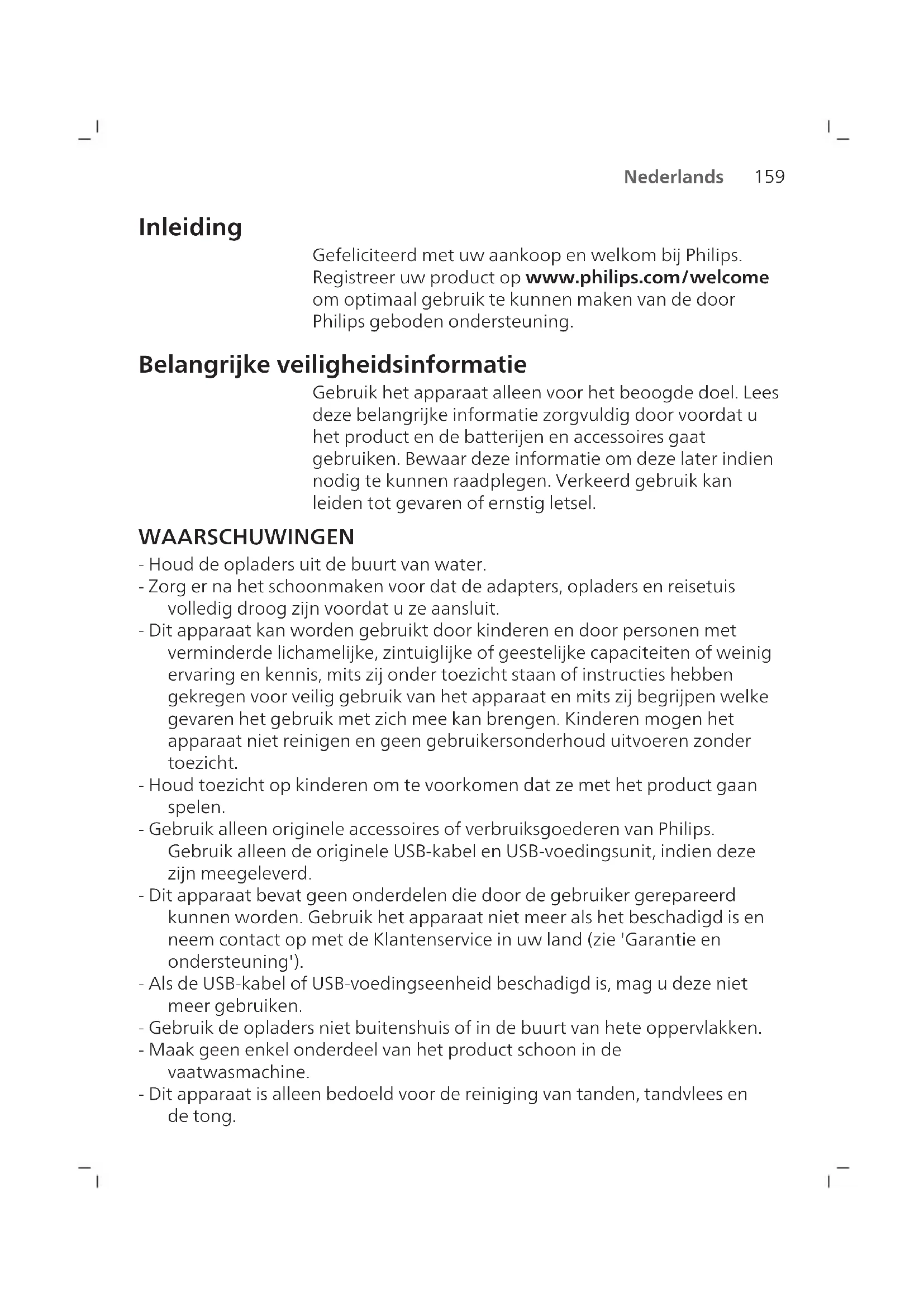 Nederlands Inleiding Gefeliciteerd met uw aankoop en welkom bij Philips. Registreer uw product op www.philips.com/welcome om optimaal gebruik te kunnen maken van de door Philips geboden ondersteuning. Belangrijke veiligheidsinformatie Gebruik het apparaat alleen voor het beoogde doel. Lees deze belangrijke informatie zorgvuldig door voordat u het product en de batterijen en accessoires gaat gebruiken. Bewaar deze informatie om deze later indien nodig te kunnen raadplegen. Verkeerd gebruik kan leiden tot gevaren of ernstig letsel. WAARSCHUWINGEN - Houd de opladers uit de buurt van water. - Zorg er na het schoonmaken voor dat de adapters, opladers en reisetuis volledig droog zijn voordat u ze aansluit. - Dit apparaat kan worden gebruikt door kinderen en door personen met verminderde lichamelijke, zintuiglijke of geestelijke capaciteiten of weinig ervaring en kennis, mits zij onder toezicht staan of instructies hebben gekregen voor veilig gebruik van het apparaat en mits zij begrijpen welke gevaren het gebruik met zich mee kan brengen. Kinderen mogen het apparaat niet reinigen en geen gebruikersonderhoud uitvoeren zonder toezicht. - Houd toezicht op kinderen om te voorkomen dat ze met het product gaan spelen. - Gebruik alleen originele accessoires of verbruiksgoederen van Philips. Gebruik alleen de originele USB-kabel en USB-voedingsunit, indien deze zijn meegeleverd. - Dit apparaat bevat geen onderdelen die door de gebruiker gerepareerd kunnen worden. Gebruik het apparaat niet meer als het beschadigd is en neem contact op met de Klantenservice in uw land (zie 'Garantie en ondersteuning'). - Als de USB-kabel of USB-voedingseenheid beschadigd is, mag u deze niet meer gebruiken. - Gebruik de opladers niet buitenshuis of in de buurt van hete oppervlakken. - Maak geen enkel onderdeel van het product schoon in de vaatwasmachine. - Dit apparaat is alleen bedoeld voor de reiniging van tanden, tandvlees en de tong.160 Nederlands - Gebruik een opzetborstel niet als de borstelharen verbogen of geknakt zijn. Vervang de opzetborstel elke 3 maanden of eerder indien deze tekenen van slijtage vertoont. - Vermijd direct contact met producten die essentiële oliën of kokosolie bevatten. Als gevolg van dergelijk contact kunnen borstelharen losraken. MEDISCHE WAARSCHUWINGEN - Stop met het gebruik van het apparaat en raadpleeg uw tandarts/arts als er na gebruik sprake is van overmatig bloeden, als er na 1 week gebruik nog steeds bloedingen optreden of als u ongemak of pijn ervaart. - Raadpleeg uw tandarts voordat u dit apparaat gebruikt als u in de afgelopen 2 maanden een chirurgische behandeling aan uw mond of uw tandvlees hebt ondergaan. - Als u een pacemaker of ander geïmplanteerd apparaat hebt, neemt u vóór gebruik van het apparaat contact op met uw arts of de fabrikant van het geïmplanteerde apparaat. - Raadpleeg uw arts voordat u dit apparaat gebruikt als u medische klachten hebt. - Dit apparaat is bedoeld voor thuisgebruik en is niet bedoeld om door meerdere personen te worden gebruikt in een tandartsenpraktijk of een instelling.