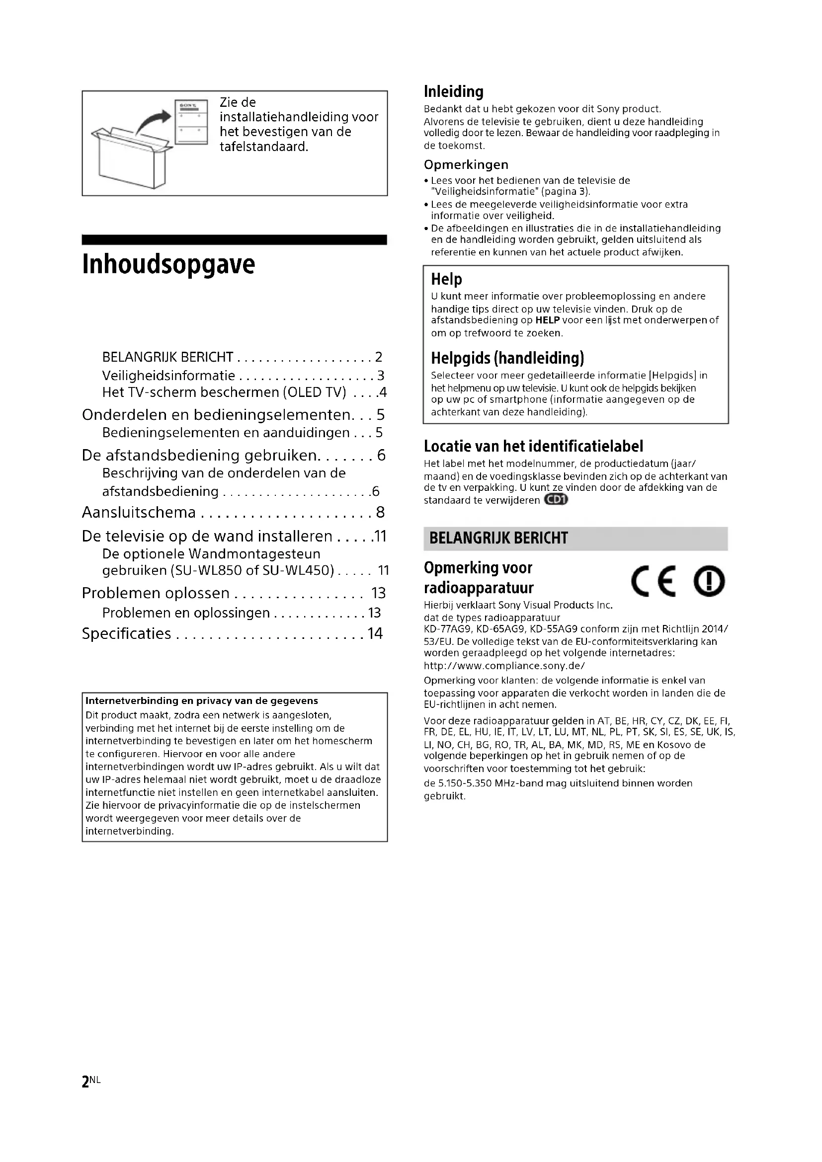 t bevestigen van de tafelstandaard. Internetverbinding en privacy van de gegevensDit product maakt, zodra een netwerk is aangesloten, verbinding met het internet bij de eerste instelling om de internetverbinding te bevestigen en later om het homescherm te configureren. Hiervoor en voor alle andere internetverbindingen wordt uw IP-adres gebruikt. Als u wilt dat uw IP-adres helemaal niet wordt gebruikt, moet u de draadloze internetfunctie niet instellen en geen internetkabel aansluiten. Zie hiervoor de privacyinformatie die op de instelschermen wordt weergegeven voor meer details over de internetverbinding. Help U kunt meer informatie over probleemoplossing en andere handige tips direct op uw televisie vinden. Druk op de afstandsbediening op HELP voor een lijst met onderwerpen of om op trefwoord te zoeken. Helpgids (handleiding) Selecteer voor meer gedetailleerde informatie [Helpgids] in het helpmenu op uw televisie. U kunt ook de helpgids bekijken op uw pc of smartphone (informatie aangegeven op de achterkant van deze handleiding). BELANGRIJK BERICHT3