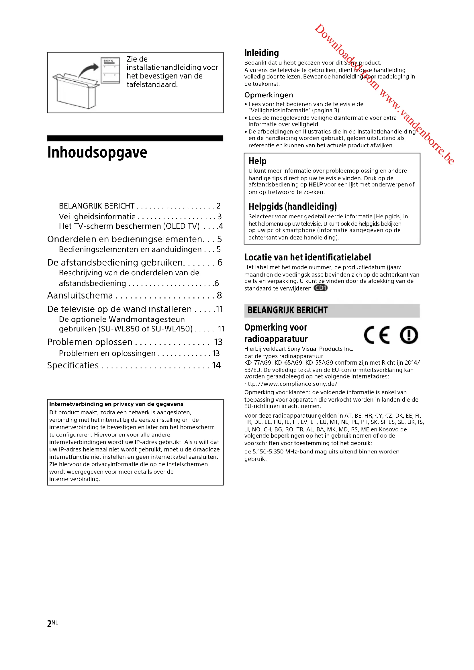 - Lees voor het bedienen van de televisie de "Veiligheidsinformatie" (pagina 3).• Lees de meegeleverde veiligheidsinformatie voor extra informatie over veiligheid.• De afbeeldingen en illustraties die in de installatiehandleiding en de handleiding worden gebruikt, gelden uitsluitend als referentie en kunnen van het actuele product afwijken. Locatie van het identificatielabel Het label met het modelnummer, de productiedatum (jaar/maand) en de voedingsklasse bevinden zich op de achterkant van de tv en verpakking. U kunt ze vinden door de afdekking van de standaard te verwijderen . Opmerking voor radioapparatuur Hierbij verklaart Sony Visual Products Inc. dat de types radioapparatuur KD-77AG9, KD-65AG9, KD-55AG9 conform zijn met Richtlijn 2014/53/EU. De volledige tekst van de EU-conformiteitsverklaring kan worden geraadpleegd op het volgende internetadres: http://www.compliance.sony.de/Opmerking voor klanten: de volgende informatie is enkel van oepassing voor apparaten die verkocht worden in landen die de EU-richtlijnen in acht nemen.Voor deze radioapparatuur gelden in AT, BE, HR, CY, CZ, DK, EE, FI, FR, DE, EL, HU, IE, IT, LV, LT, LU, MT, NL, PL, PT, SK, SI, ES, SE, UK, IS,LI, NO, CH, BG, RO, TR, AL, BA, MK, MD, RS, ME en Kosovo de volgende beperkingen op het in gebruik nemen of op de voorschriften voor toestemming tot het gebruik:de 5.150-5.350 MHz-band mag uitsluitend binnen worden gebr uikt.Zie de installatiehandleiding voor t bevestigen van de tafelstandaard.Internetverbinding en privacy van de gegevensDit product maakt, zodra een netwerk is aangesloten, verbinding met het internet bij de eerste instelling om de internetverbinding te bevestigen en later om het homescherm te configureren. Hiervoor en voor alle andere internetverbindingen wordt uw IP-adres gebruikt. Als u wilt dat uw IP-adres helemaal niet wordt gebruikt, moet u de draadloze internetfunctie niet instellen en geen internetkabel aansluiten. Zie hiervoor de privacyinformatie die op de instelschermen wordt weergegeven voor meer details over de internetverbinding. Help U kunt meer informatie over probleemoplossing en andere handige tips direct op uw televisie vinden. Druk op de afstandsbediening op HELP voor een lijst met onderwerpen of om op trefwoord te zoeken. Helpgids (handleiding) Selecteer voor meer gedetailleerde informatie [Helpgids] in het helpmenu op uw televisie. U kunt ook de helpgids bekijken op uw pc of smartphone (informatie aangegeven op de achterkant van deze handleiding). BELANGRIJK BERICHT Downloaded from www.vandenborre.be3