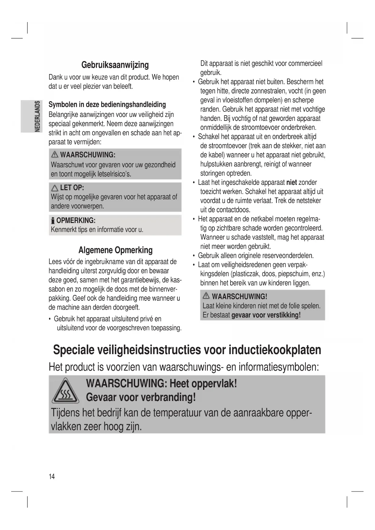 - Laat om veiligheidsredenen geen verpak- kingsdelen (plasticzak, doos, piepschuim, enz.) binnen het bereik van uw kinderen liggen. WAARSCHUWING! Laat kleine kinderen niet met de folie spelen. Er bestaat gevaar voor verstikking! Speciale veiligheidsinstructies voor inductiekookplaten Het product is voorzien van waarschuwings- en informatiesymbolen: WAARSCHUWING: Heet oppervlak! Gevaar voor verbranding! Tijdens het bedrijf kan de temperatuur van de aanraakbare opper- vlakken zeer hoog zijn.15 WAARSCHUWING: