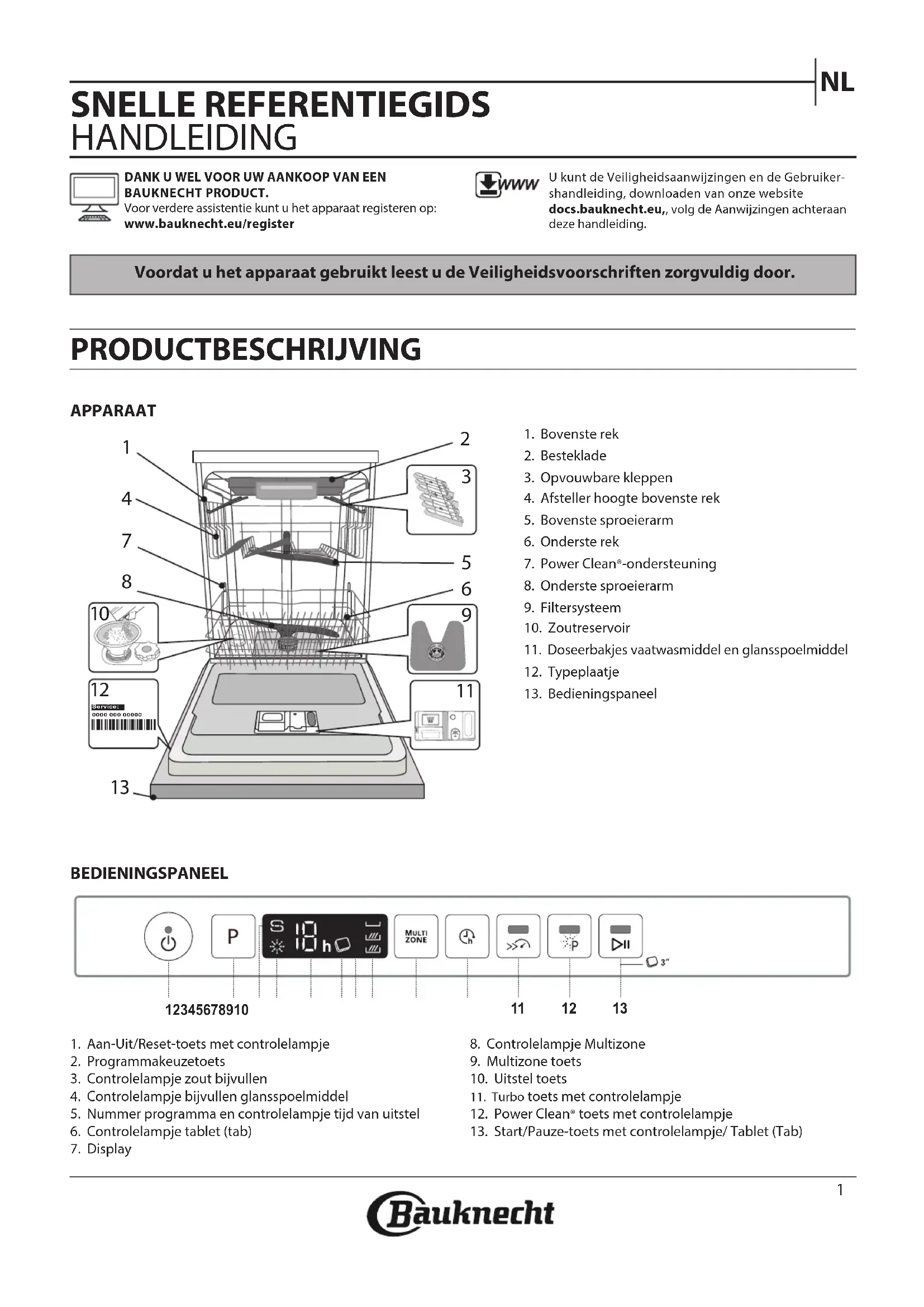 APPARAAT SNELLE REFERENTIEGIDS HANDLEIDING BEDIENINGSPANEEL DANK U WEL VOOR UW AANKOOP VAN EEN BAUKNECHT PRODUCT. Voor verdere assistentie kunt u het apparaat registeren op:www.bauknecht.eu/registerU kunt de Veiligheidsaanwijzingen en de Gebruiker-shandleiding, downloaden van onze website docs.bauknecht.eu,, volg de Aanwijzingen achteraan deze handleiding.1. Bovenste rek2. Besteklade3. Opvouwbare kleppen4. Afsteller hoogte bovenste rek5. Bovenste sproeierarm6. Onderste rek7. Power Clean®-ondersteuning8. Onderste sproeierarm9. Filtersysteem10. Zoutreservoir11. Doseerbakjes vaatwasmiddel en glansspoelmiddel12. Typeplaatje13. Bedieningspaneel1. Aan-Uit/Reset-toets met controlelampje2. Programmakeuzetoets3. Controlelampje zout bijvullen4. Controlelampje bijvullen glansspoelmiddel5. Nummer programma en controlelampje tijd van uitstel6. Controlelampje tablet (tab)7. Display8. Controlelampje Multizone9. Multizone toets10. Uitstel toets11. Turbo toets met controlelampje12. Power Clean® toets met controlelampje13. Start/Pauze-toets met controlelampje/ Tablet (Tab) Voordat u het apparaat gebruikt leest u de Veiligheidsvoorschriften zorgvuldig door. PRODUCTBESCHRIJVING 1 2 3 4 5 6 7 8 9 1011 12 130000 000 00000 Service: