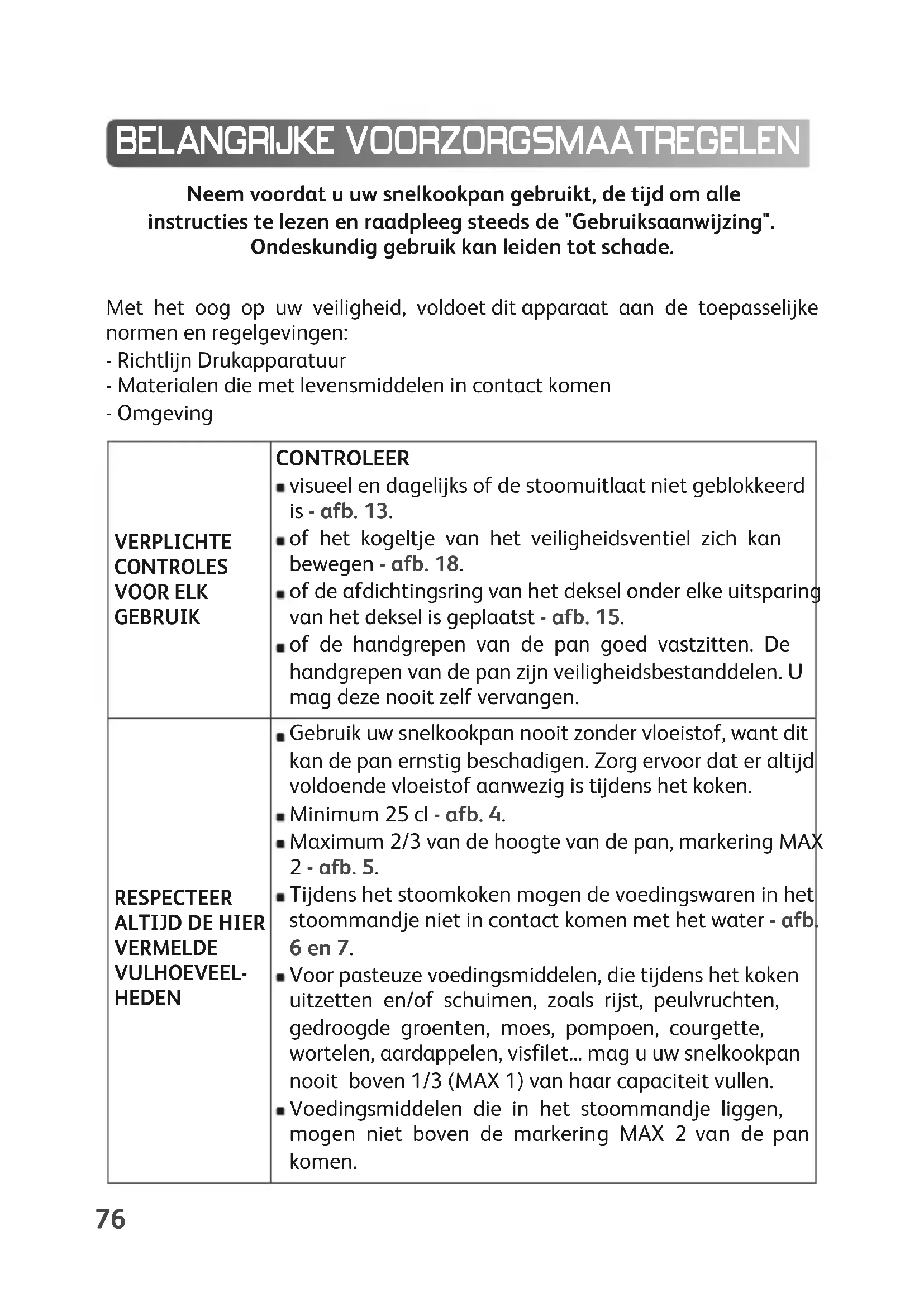 VOOR EN TIJDENS HET KOKEN Houd kinderen tijdens het gebruik buiten het bereik van de snelkookpan. Uw snelkookpan kookt onder druk. Ondeskundig gebruik kan leiden tot ernstige brandwonden door heet water. Verzeker u ervan dat de snelkookpan goed is gesloten voordat u hem in werking stelt. (Zie paragraaf "Sluiten"). Let erop tijdens het koken dat het ventiel steeds fluistert. Als er geen stoom ontsnapt, open dan de snelkookpan en controleer of er nog voldoende vloeistof is en of de stoomuitlaat niet geblokkeerd is. Als na deze controle nog steeds geen stoom ontsnapt, verhoog dan zachtjes de warmtebron. Kook geen voedingsmiddelen die veiligheidsvoorzieningen kunnen blokkeren: - veenbessen - parelgerst - havervlokken - spliterwten - noedels, macaroni, spaghetti - rabarber - aalbessen Bereid nooit een recept op basis van dierlijke melk in uw snelkookpan. Als u een snelkookpan met een roestvrijstalen pan heeft, gebruik dan nooit grof zout in uw snelkookpan, maar voeg fijn zout toe aan het einde van het koken. Zo vermijdt u dat er putjes worden gevormd op de bodem van de snelkookpan. Gebruik uw snelkookpan niet om onder druk te braden met olie. Gebruik uw snelkookpan niet voor een ander doel dan waarvoor deze is bestemd. Plaats uw snelkookpan niet in een warme oven. Doe nooit aluminiumfolie die niet goed vastzit in uw snelkookpan. Doe nooit huishoudfolie in uw snelkookpan. Alcoholdampen zijn ontvlambaar. Breng deze aan de kook gedurende ongeveer 2 minuten voordat u het deksel sluit. Houd toezicht op de snelkookpan bij het bereiden van recepten die alcohol bevatten. Gebruik de geschikte warmtebron(nen) overeenkomstig de gebruiksaanwijzingen.78 NA HET KOKEN... Voor modellen met een anti-aanbaklaag: gebruik geen gardes, metalen en/of scherp keukengerei. Om de etenswaren in uw keukengerei te laten uitlekken, tik niet op de rand van de pan om het risico op schade of lekkage te vermijden. Verdraai geleidelijk het drukventiel (A) door naar eigen wens de drukverlaging te kiezen, tot tegenover de markering van het pictogram - afb. 10. Indien u bij het vrijkomen van de stoom ongewone spatten vaststelt, plaats het drukventiel (A) terug in de modus "Snelkookpan" en voer een snelle drukverlaging onder koud water uit - afb. 14. Indien de veiligheidsindicator (D) niet daalt, plaats uw snelkookpan in koud water - afb. 14. Manipuleer nooit de veiligheidsindicator. Na het koken van vlees met een oppervlakkige huid (zoals ossentong) die onder invloed van de druk kan zwellen, het vlees niet doorprikken zolang de huid opgezwollen is; u loopt het risico te worden verbrand. Prik het vlees door voordat u gaat koken. Voor pasteuze voedingsmiddelen die tijdens het koken uitzetten of schuimen, zoals rijst, peulvruchten, gedroogde groenten, moes, pompoen, courgette, wortelen, aardappelen, visfilet... laat uw snelkookpan enkele minuten afkoelen, en voer dan een afkoeling onder koud water uit. Schud de snelkookpan lichtjes en systematisch, voor elke opening en na controle dat de veiligheidsindicator is gedaald, om het ontsnappen van stoombellen, die u zouden kunnen verbranden, te voorkomen. Deze handeling is vooral belangrijk bij het snel laten ontsnappen van de stoom of na het koelen met koud water. Verplaats uw snelkookpan onder druk met uiterste voorzichtigheid. Raak de warme oppervlakken niet aan. Gebruik de handgrepen en knoppen. Draag zo nodig ovenhandschoenen. Bij het bereiden van soepen, raden wij aan een snelle drukverlaging onder koud water uit te voeren (zie "Einde van het koken in de modus 'Snelkookpan' ") Let erop dat het ventiel in de drukverlagingsstand staat voordat u uw snelkookpan opent. De veiligheidsindicator (D) moet op de laagste stand staan. Open nooit uw snelkookpan met geweld. Verzeker u ervan dat de interne druk is gedaald. De veiligheidsindicator (D) moet op de laagste stand staan. (Zie paragraaf "Beveiliging").BEWAAR DEZE INSTRUCTIES