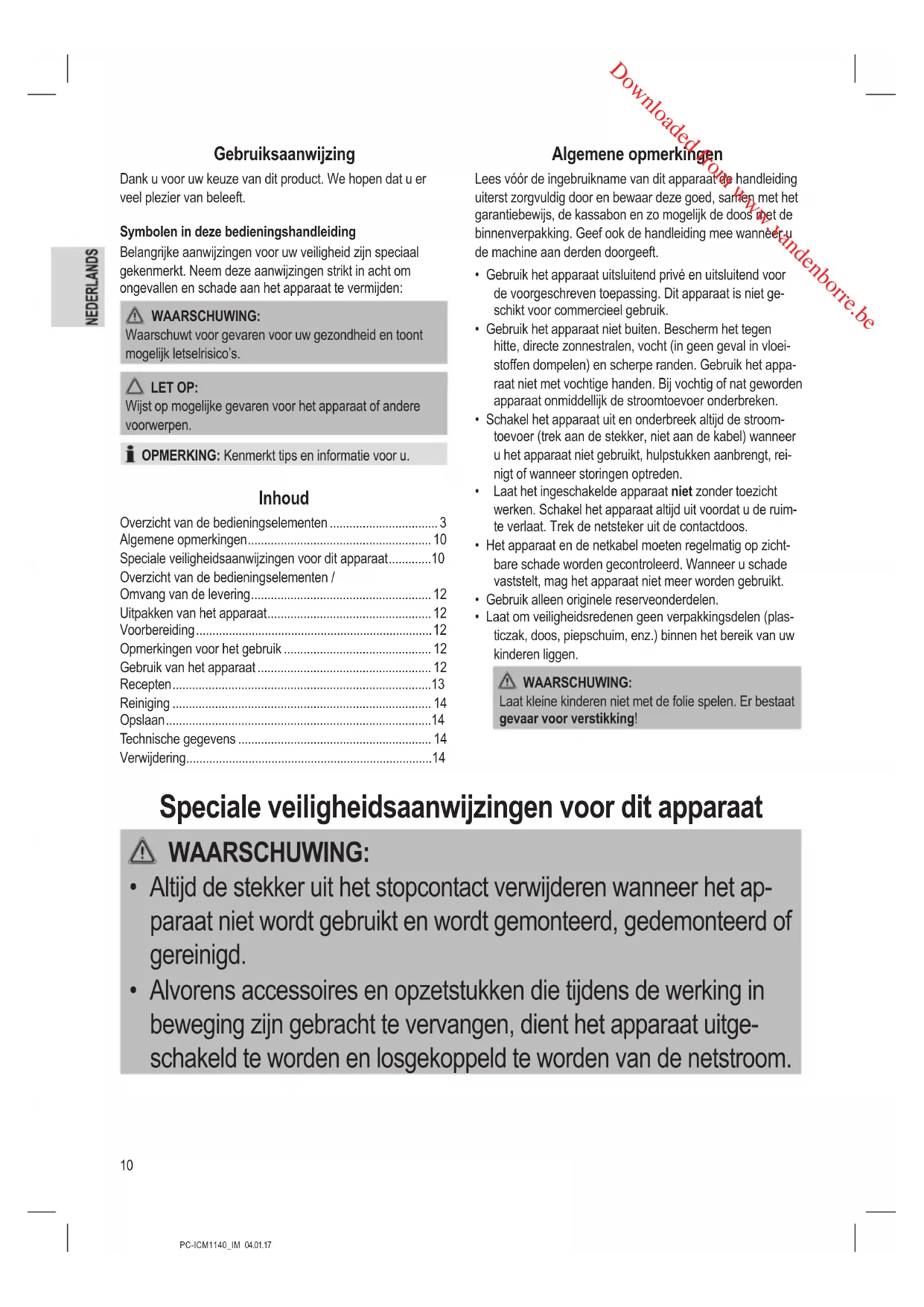 - Alvorens accessoires en opzetstukken die tijdens de werking in beweging zijn gebracht te vervangen, dient het apparaat uitge- schakeld te worden en losgekoppeld te worden van de netstroom. Downloaded from www.vandenborre.be11 PC-ICM1140_IM 04.01.17 WAARSCHUWING: