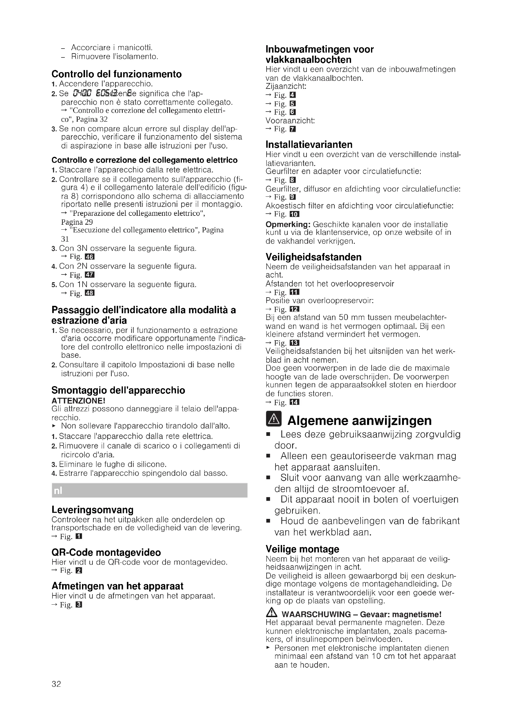 Algemene aanwijzingen ¡ Lees deze gebruiksaanwijzing zorgvuldig door. ¡ Alleen een geautoriseerde vakman mag het apparaat aansluiten. ¡ Sluit voor aanvang van alle werkzaamhe- den altijd de stroomtoevoer af. ¡ Dit apparaat nooit in boten of voertuigen gebruiken. ¡ Houd de aanbevelingen van de fabrikant van het werkblad aan. Veilige montage Neem bij het monteren van het apparaat de veilig- heidsaanwijzingen in acht. De veiligheid is alleen gewaarborgd bij een deskun- dige montage volgens de montagehandleiding. De installateur is verantwoordelijk voor een goede wer- king op de plaats van opstelling. WAARSCHUWING‒Gevaar: magnetisme! Het apparaat bevat permanente magneten. Deze kunnen elektronische implantaten, zoals pacema- kers, of insulinepompen beïnvloeden.