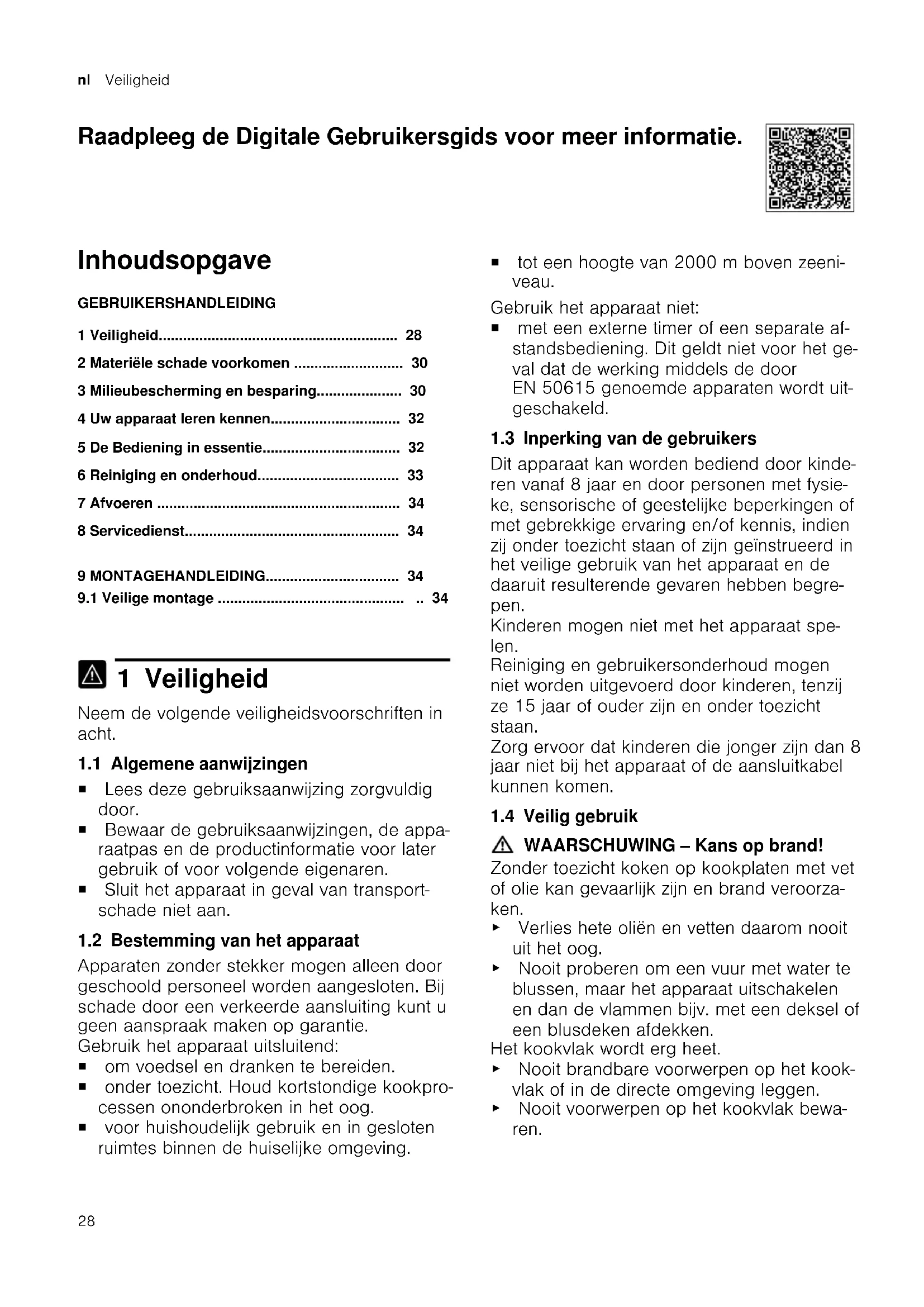 1 Veiligheid Neem de volgende veiligheidsvoorschriften in acht. 1.1 Algemene aanwijzingen ¡ Lees deze gebruiksaanwijzing zorgvuldig door. ¡ Bewaar de gebruiksaanwijzingen, de appa- raatpas en de productinformatie voor later gebruik of voor volgende eigenaren. ¡ Sluit het apparaat in geval van transport- schade niet aan. 1.2 Bestemming van het apparaat Apparaten zonder stekker mogen alleen door geschoold personeel worden aangesloten. Bij schade door een verkeerde aansluiting kunt u geen aanspraak maken op garantie. Gebruik het apparaat uitsluitend: ¡ om voedsel en dranken te bereiden. ¡ onder toezicht. Houd kortstondige kookpro- cessen ononderbroken in het oog. ¡ voor huishoudelijk gebruik en in gesloten ruimtes binnen de huiselijke omgeving. ¡ tot een hoogte van 2000m boven zeeni- veau. Gebruik het apparaat niet: ¡ met een externe timer of een separate af- standsbediening. Dit geldt niet voor het ge- val dat de werking middels de door EN50615 genoemde apparaten wordt uit- geschakeld. 1.3 Inperking van de gebruikers Dit apparaat kan worden bediend door kinde- ren vanaf 8 jaar en door personen met fysie- ke, sensorische of geestelijke beperkingen of met gebrekkige ervaring en/of kennis, indien zij onder toezicht staan of zijn geïnstrueerd in het veilige gebruik van het apparaat en de daaruit resulterende gevaren hebben begre- pen. Kinderen mogen niet met het apparaat spe- len. Reiniging en gebruikersonderhoud mogen niet worden uitgevoerd door kinderen, tenzij ze 15jaar of ouder zijn en onder toezicht staan. Zorg ervoor dat kinderen die jonger zijn dan 8 jaar niet bij het apparaat of de aansluitkabel kunnen komen. 1.4 Veilig gebruik WAARSCHUWING‒Kans op brand! Zonder toezicht koken op kookplaten met vet of olie kan gevaarlijk zijn en brand veroorza- ken. ▶ Verlies hete oliën en vetten daarom nooit uit het oog. ▶ Nooit proberen om een vuur met water te blussen, maar het apparaat uitschakelen en dan de vlammen bijv. met een deksel of een blusdeken afdekken. Het kookvlak wordt erg heet. ▶ Nooit brandbare voorwerpen op het kook- vlak of in de directe omgeving leggen. ▶ Nooit voorwerpen op het kookvlak bewa- ren.Veiligheid nl