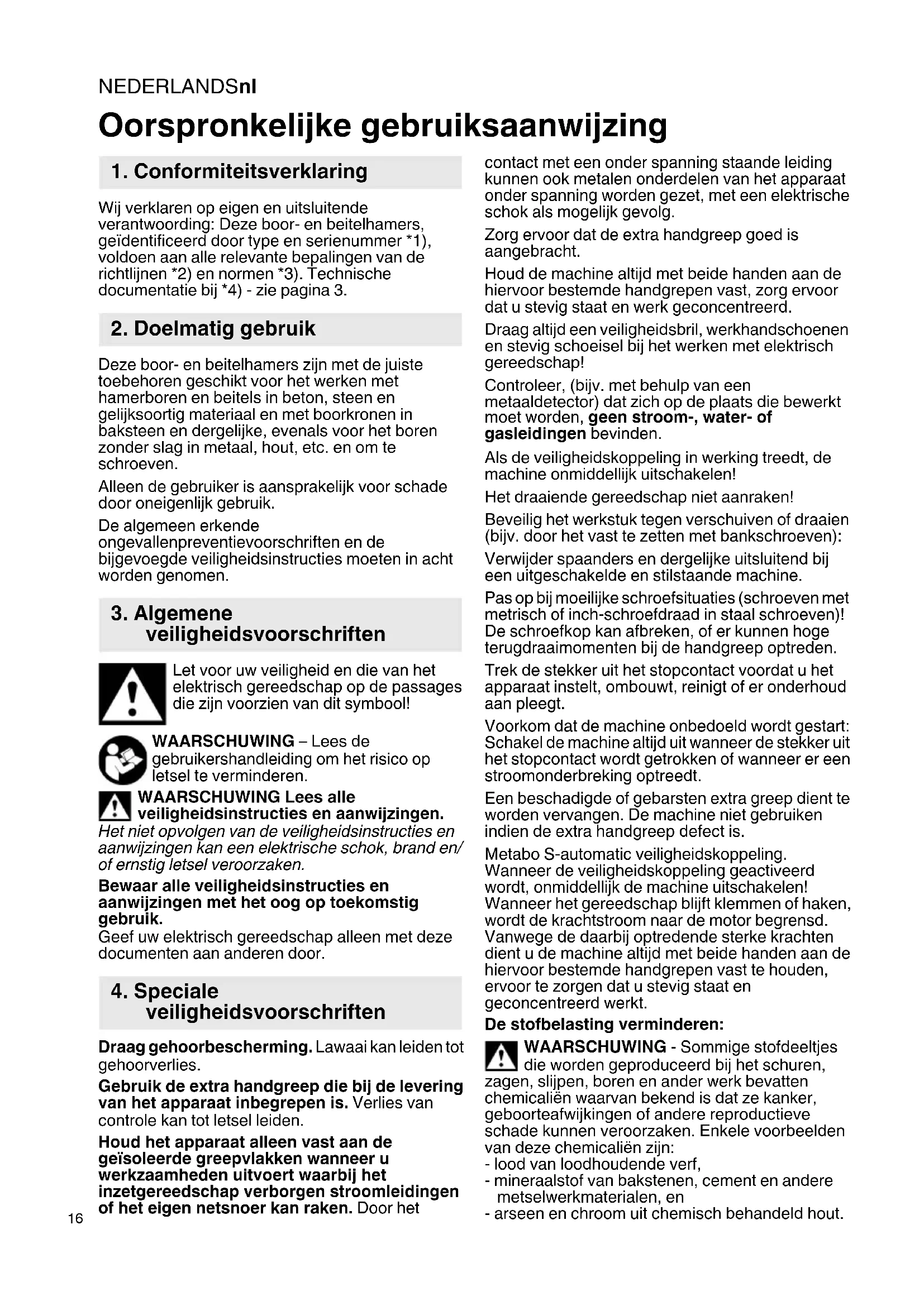 Wij verklaren op eigen en uitsluitende verantwoording: Deze boor- en beitelhamers, geïdentificeerd door type en serienummer *1), voldoen aan alle relevante bepalingen van de richtlijnen *2) en normen *3). Technische documentatie bij *4) - zie pagina 3. Deze boor- en beitelhamers zijn met de juiste toebehoren geschikt voor het werken met hamerboren en beitels in beton, steen en gelijksoortig materiaal en met boorkronen in baksteen en dergelijke, evenals voor het boren zonder slag in metaal, hout, etc. en om te schroeven. Alleen de gebruiker is aansprakelijk voor schade door oneigenlijk gebruik. De algemeen erkende ongevallenpreventievoorschriften en de bijgevoegde veiligheidsinstructies moeten in acht worden genomen. Let voor uw veiligheid en die van het elektrisch gereedschap op de passages die zijn voorzien van dit symbool! WAARSCHUWING – Lees de gebruikershandleiding om het risico op letsel te verminderen. WAARSCHUWING Lees alle veiligheidsinstructies en aanwijzingen. Het niet opvolgen van de veiligheidsinstructies en aanwijzingen kan een elektrische schok, brand en/ of ernstig letsel veroorzaken. Bewaar alle veiligheidsinstructies en aanwijzingen met het oog op toekomstig gebruik. Geef uw elektrisch gereedschap alleen met deze documenten aan anderen door. Draag gehoorbescherming. Lawaai kan leiden tot gehoorverlies. Gebruik de extra handgreep die bij de levering van het apparaat inbegrepen is. Verlies van controle kan tot letsel leiden. Houd het apparaat alleen vast aan de geïsoleerde greepvlakken wanneer u werkzaamheden uitvoert waarbij het inzetgereedschap verborgen stroomleidingen of het eigen netsnoer kan raken. Door het contact met een onder spanning staande leiding kunnen ook metalen onderdelen van het apparaat onder spanning worden gezet, met een elektrische schok als mogelijk gevolg. Zorg ervoor dat de extra handgreep goed is aangebracht. Houd de machine altijd met beide handen aan de hiervoor bestemde handgrepen vast, zorg ervoor dat u stevig staat en werk geconcentreerd. Draag altijd een veiligheidsbril, werkhandschoenen en stevig schoeisel bij het werken met elektrisch gereedschap! Controleer, (bijv. met behulp van een metaaldetector) dat zich op de plaats die bewerkt moet worden, geen stroom-, water- of gasleidingen bevinden. Als de veiligheidskoppeling in werking treedt, de machine onmiddellijk uitschakelen! Het draaiende gereedschap niet aanraken! Beveilig het werkstuk tegen verschuiven of draaien (bijv. door het vast te zetten met bankschroeven): Verwijder spaanders en dergelijke uitsluitend bij een uitgeschakelde en stilstaande machine. Pas op bij moeilijke schroefsituaties (schroeven met metrisch of inch-schroefdraad in staal schroeven)! De schroefkop kan afbreken, of er kunnen hoge terugdraaimomenten bij de handgreep optreden. Trek de stekker uit het stopcontact voordat u het apparaat instelt, ombouwt, reinigt of er onderhoud aan pleegt. Voorkom dat de machine onbedoeld wordt gestart: Schakel de machine altijd uit wanneer de stekker uit het stopcontact wordt getrokken of wanneer er een stroomonderbreking optreedt. Een beschadigde of gebarsten extra greep dient te worden vervangen. De machine niet gebruiken indien de extra handgreep defect is. Metabo S-automatic veiligheidskoppeling. Wanneer de veiligheidskoppeling geactiveerd wordt, onmiddellijk de machine uitschakelen! Wanneer het gereedschap blijft klemmen of haken, wordt de krachtstroom naar de motor begrensd. Vanwege de daarbij optredende sterke krachten dient u de machine altijd met beide handen aan de hiervoor bestemde handgrepen vast te houden, ervoor te zorgen dat u stevig staat en geconcentreerd werkt. De stofbelasting verminderen: WAARSCHUWING - Sommige stofdeeltjes die worden geproduceerd bij het schuren, zagen, slijpen, boren en ander werk bevatten chemicaliën waarvan bekend is dat ze kanker, geboorteafwijkingen of andere reproductieve schade kunnen veroorzaken. Enkele voorbeelden van deze chemicaliën zijn: - lood van loodhoudende verf, - mineraalstof van bakstenen, cement en andere metselwerkmaterialen, en - arseen en chroom uit chemisch behandeld hout. Oorspronkelijke gebruiksaanwijzing
