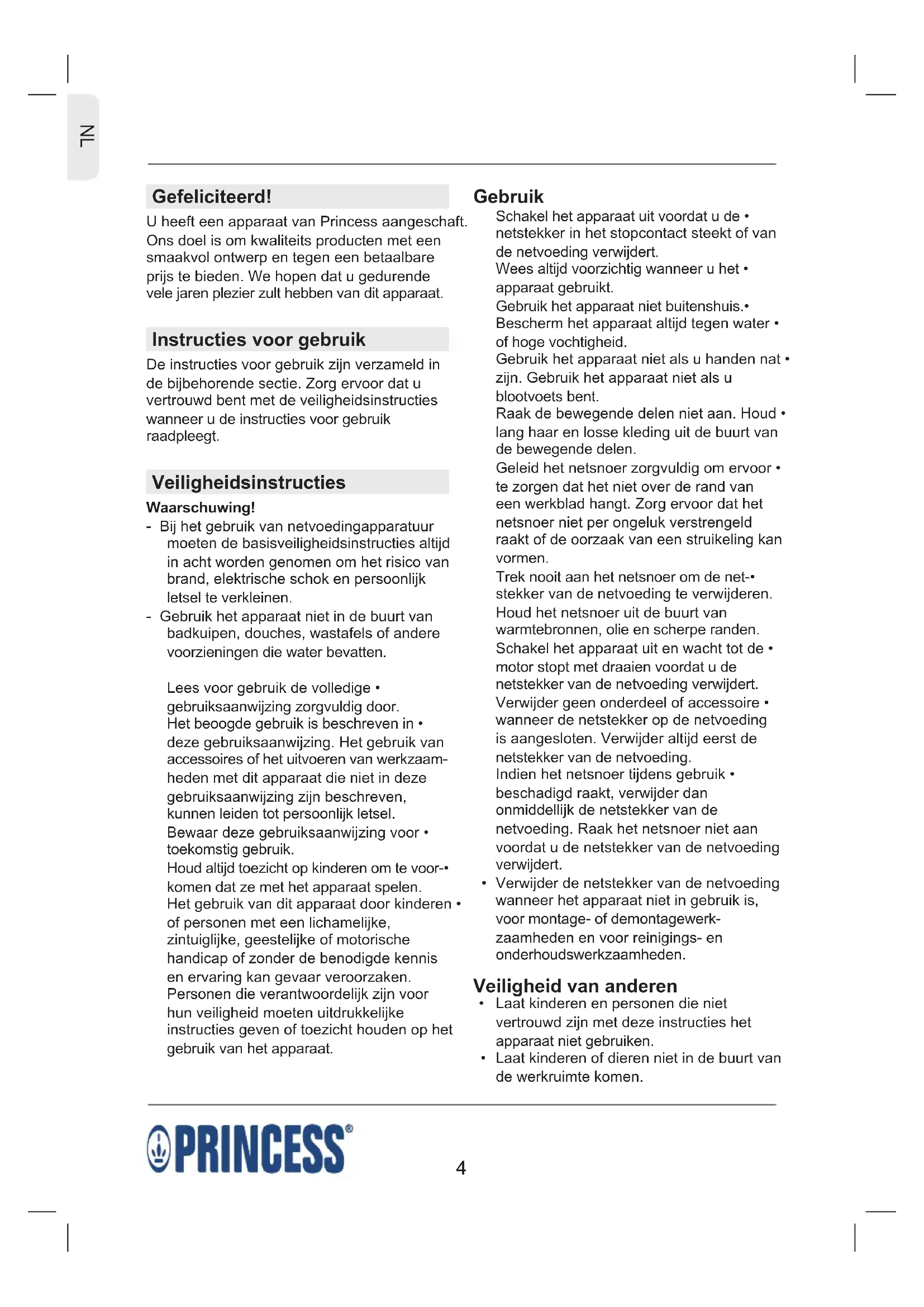 Gefeliciteerd! U heeft een apparaat van Princess aangeschaft. Ons doel is om kwaliteits producten met een smaakvol ontwerp en tegen een betaalbare prijs te bieden. We hopen dat u gedurende vele jaren plezier zult hebben van dit apparaat. Instructies voor gebruik De instructies voor gebruik zijn verzameld in de bijbehorende sectie. Zorg ervoor dat u vertrouwd bent met de veiligheidsinstructies wanneer u de instructies voor gebruik raadpleegt. Veiligheidsinstructies Waarschuwing! - Bij het gebruik van netvoedingapparatuur moeten de basisveiligheidsinstructies altijd in acht worden genomen om het risico van brand, elektrische schok en persoonlijk letsel te verkleinen. - Gebruik het apparaat niet in de buurt van badkuipen, douches, wastafels of andere voorzieningen die water bevatten. Lees voor gebruik de volledige • gebruiksaanwijzing zorgvuldig door. Het beoogde gebruik is beschreven in • deze gebruiksaanwijzing. Het gebruik van accessoires of het uitvoeren van werkzaam- heden met dit apparaat die niet in deze gebruiksaanwijzing zijn beschreven, kunnen leiden tot persoonlijk letsel. Bewaar deze gebruiksaanwijzing voor • toekomstig gebruik. Houd altijd toezicht op kinderen om te voor-• komen dat ze met het apparaat spelen. Het gebruik van dit apparaat door kinderen • of personen met een lichamelijke, zintuiglijke, geestelijke of motorische handicap of zonder de benodigde kennis en ervaring kan gevaar veroorzaken. Personen die verantwoordelijk zijn voor hun veiligheid moeten uitdrukkelijke instructies geven of toezicht houden op het gebruik van het apparaat. Gebruik Schakel het apparaat uit voordat u de • netstekker in het stopcontact steekt of van de netvoeding verwijdert. Wees altijd voorzichtig wanneer u het • apparaat gebruikt. Gebruik het apparaat niet buitenshuis.• Bescherm het apparaat altijd tegen water • of hoge vochtigheid. Gebruik het apparaat niet als u handen nat • zijn. Gebruik het apparaat niet als u blootvoets bent. Raak de bewegende delen niet aan. Houd • lang haar en losse kleding uit de buurt van de bewegende delen. Geleid het netsnoer zorgvuldig om ervoor • te zorgen dat het niet over de rand van een werkblad hangt. Zorg ervoor dat het netsnoer niet per ongeluk verstrengeld raakt of de oorzaak van een struikeling kan vormen. Trek nooit aan het netsnoer om de net-• stekker van de netvoeding te verwijderen. Houd het netsnoer uit de buurt van warmtebronnen, olie en scherpe randen. Schakel het apparaat uit en wacht tot de • motor stopt met draaien voordat u de netstekker van de netvoeding verwijdert. Verwijder geen onderdeel of accessoire • wanneer de netstekker op de netvoeding is aangesloten. Verwijder altijd eerst de netstekker van de netvoeding. Indien het netsnoer tijdens gebruik • beschadigd raakt, verwijder dan onmiddellijk de netstekker van de netvoeding. Raak het netsnoer niet aan voordat u de netstekker van de netvoeding verwijdert. Verwijder de netstekker van de netvoeding • wanneer het apparaat niet in gebruik is, voor montage- of demontagewerk- zaamheden en voor reinigings- en onderhoudswerkzaamheden. Veiligheid van anderen Laat kinderen en personen die niet • vertrouwd zijn met deze instructies het apparaat niet gebruiken. Laat kinderen of dieren niet in de buurt van • de werkruimte komen.5