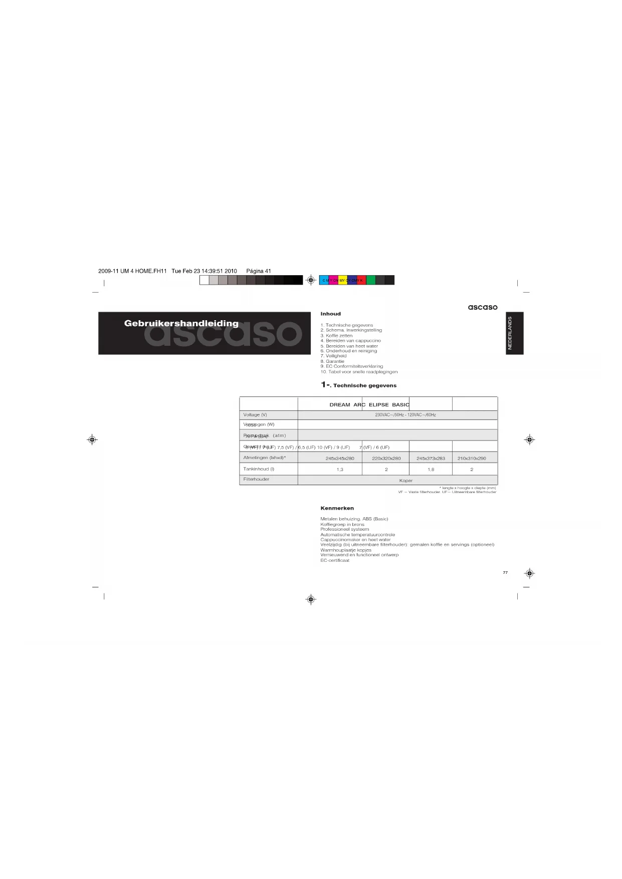 NEDERLANDSNEDERLANDSAantal koppen Ontkalkenkoffie per dag >10 maandelijks 5-10 tweemaandelijks 1-5 driemaandelijksafbeelding 8 ARC ELIPSEBASICDREAMafbeelding 82009-11 UM 4 HOME.FH11 Tue Feb 23 14:39:51 2010 Página 46 C M Y CM MY CY CMY K ascaso ascaso