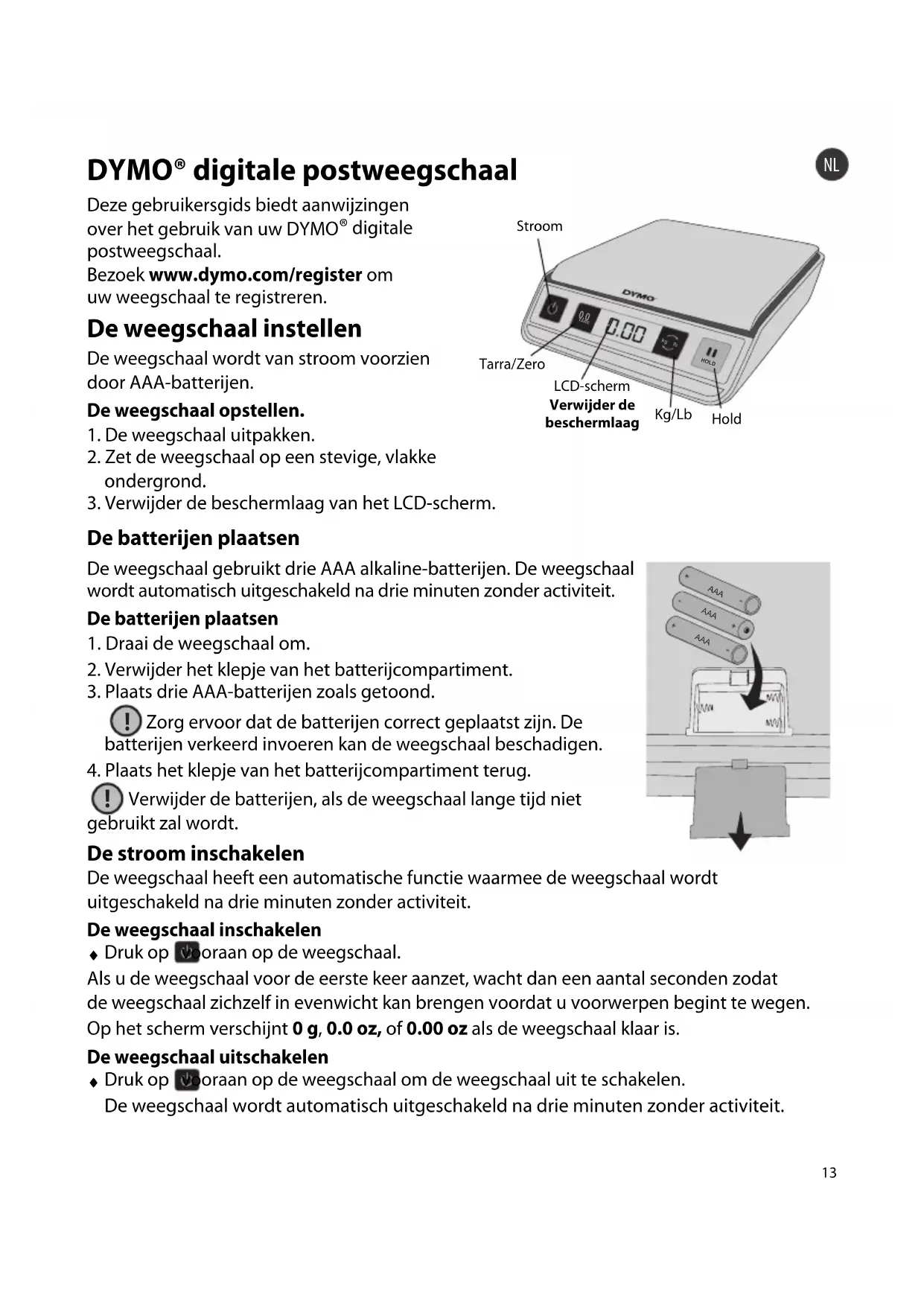 DYMO® digitale postweegschaal Deze gebruikersgids biedt aanwijzingen over het gebruik van uw DYMO ® digitale postweegschaal. Bezoek www.dymo.com/register om uw weegschaal te registreren. De weegschaal instellen De weegschaal wordt van stroom voorzien door AAA-batterijen. De weegschaal opstellen.