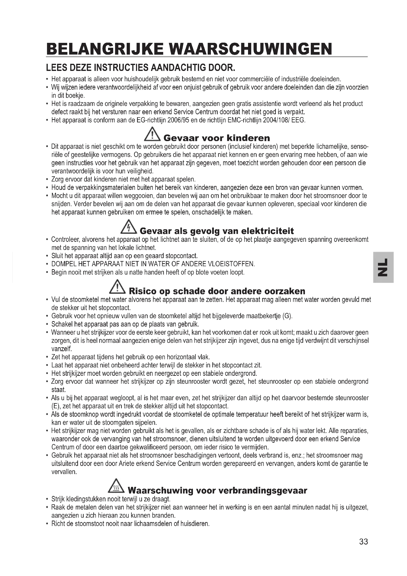 - Het strijkijzer mag niet worden gebruikt als het is gevallen, als er zichtbare schade is of als hij water lekt. Alle reparaties, waaronder ook de vervanging van het stroomsnoer, dienen uitsluitend te worden uitgevoerd door een erkend Service Centrum of door een daartoe gekwaliceerd persoon, om ieder risico te vermijden. • Gebruik het apparaat niet als het stroomsnoer beschadigingen vertoont, deels verbrand is, enz.; het stroomsnoer mag uitsluitend door een door Ariete erkend Service Centrum worden gerepareerd en vervangen, anders komt de garantie te vervallen. Waarschuwing voor verbrandingsgevaar