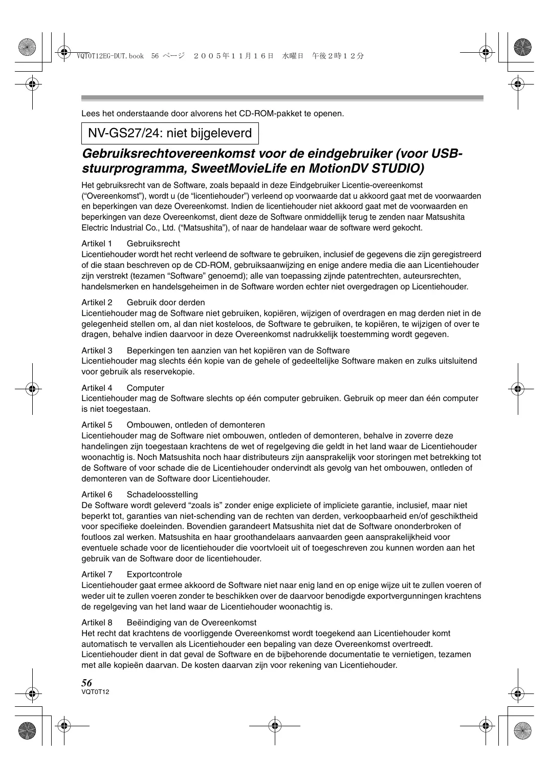 Lees het onderstaande door alvorens het CD-ROM-pakket te openen. NV-GS27/24: niet bijgeleverd Gebruiksrechtovereenkomst voor de eindgebruiker (voor USBstuurprogramma, SweetMovieLife en MotionDV STUDIO) Het gebruiksrecht van de Software, zoals bepaald in deze Eindgebruiker Licentie-overeenkomst (“Overeenkomst”), wordt u (de “licentiehouder”) verleend op voorwaarde dat u akkoord gaat met de voorwaarden en beperkingen van deze Overeenkomst. Indien de licentiehouder niet akkoord gaat met de voorwaarden en beperkingen van deze Overeenkomst, dient deze de Software onmiddellijk terug te zenden naar Matsushita Electric Industrial Co., Ltd. (“Matsushita”), of naar de handelaar waar de software werd gekocht. Artikel 1 Gebruiksrecht Licentiehouder wordt het recht verleend de software te gebruiken, inclusief de gegevens die zijn geregistreerd of die staan beschreven op de CD-ROM, gebruiksaanwijzing en enige andere media die aan Licentiehouder zijn verstrekt (tezamen “Software” genoemd); alle van toepassing zijnde patentrechten, auteursrechten, handelsmerken en handelsgeheimen in de Software worden echter niet overgedragen op Licentiehouder. Artikel 2 Gebruik door derden Licentiehouder mag de Software niet gebruiken, kopiëren, wijzigen of overdragen en mag derden niet in de gelegenheid stellen om, al dan niet kosteloos, de Software te gebruiken, te kopiëren, te wijzigen of over te dragen, behalve indien daarvoor in deze Overeenkomst nadrukkelijk toestemming wordt gegeven. Artikel 3 Beperkingen ten aanzien van het kopiëren van de Software Licentiehouder mag slechts één kopie van de gehele of gedeeltelijke Software maken en zulks uitsluitend voor gebruik als reservekopie. Artikel 4 Computer Licentiehouder mag de Software slechts op één computer gebruiken. Gebruik op meer dan één computer is niet toegestaan. Artikel 5 Ombouwen, ontleden of demonteren Licentiehouder mag de Software niet ombouwen, ontleden of demonteren, behalve in zoverre deze handelingen zijn toegestaan krachtens de wet of regelgeving die geldt in het land waar de Licentiehouder woonachtig is. Noch Matsushita noch haar distributeurs zijn aansprakelijk voor storingen met betrekking tot de Software of voor schade die de Licentiehouder ondervindt als gevolg van het ombouwen, ontleden of demonteren van de Software door Licentiehouder. Artikel 6 Schadeloosstelling De Software wordt geleverd “zoals is” zonder enige expliciete of impliciete garantie, inclusief, maar niet beperkt tot, garanties van niet-schending van de rechten van derden, verkoopbaarheid en/of geschiktheid voor specifieke doeleinden. Bovendien garandeert Matsushita niet dat de Software ononderbroken of foutloos zal werken. Matsushita en haar groothandelaars aanvaarden geen aansprakelijkheid voor eventuele schade voor de licentiehouder die voortvloeit uit of toegeschreven zou kunnen worden aan het gebruik van de Software door de licentiehouder. Artikel 7 Exportcontrole Licentiehouder gaat ermee akkoord de Software niet naar enig land en op enige wijze uit te zullen voeren of weder uit te zullen voeren zonder te beschikken over de daarvoor benodigde exportvergunningen krachtens de regelgeving van het land waar de Licentiehouder woonachtig is. Artikel 8 Beëindiging van de Overeenkomst Het recht dat krachtens de voorliggende Overeenkomst wordt toegekend aan Licentiehouder komt automatisch te vervallen als Licentiehouder een bepaling van deze Overeenkomst overtreedt. Licentiehouder dient in dat geval de Software en de bijbehorende documentatie te vernietigen, tezamen met alle kopieën daarvan. De kosten daarvan zijn voor rekening van Licentiehouder.