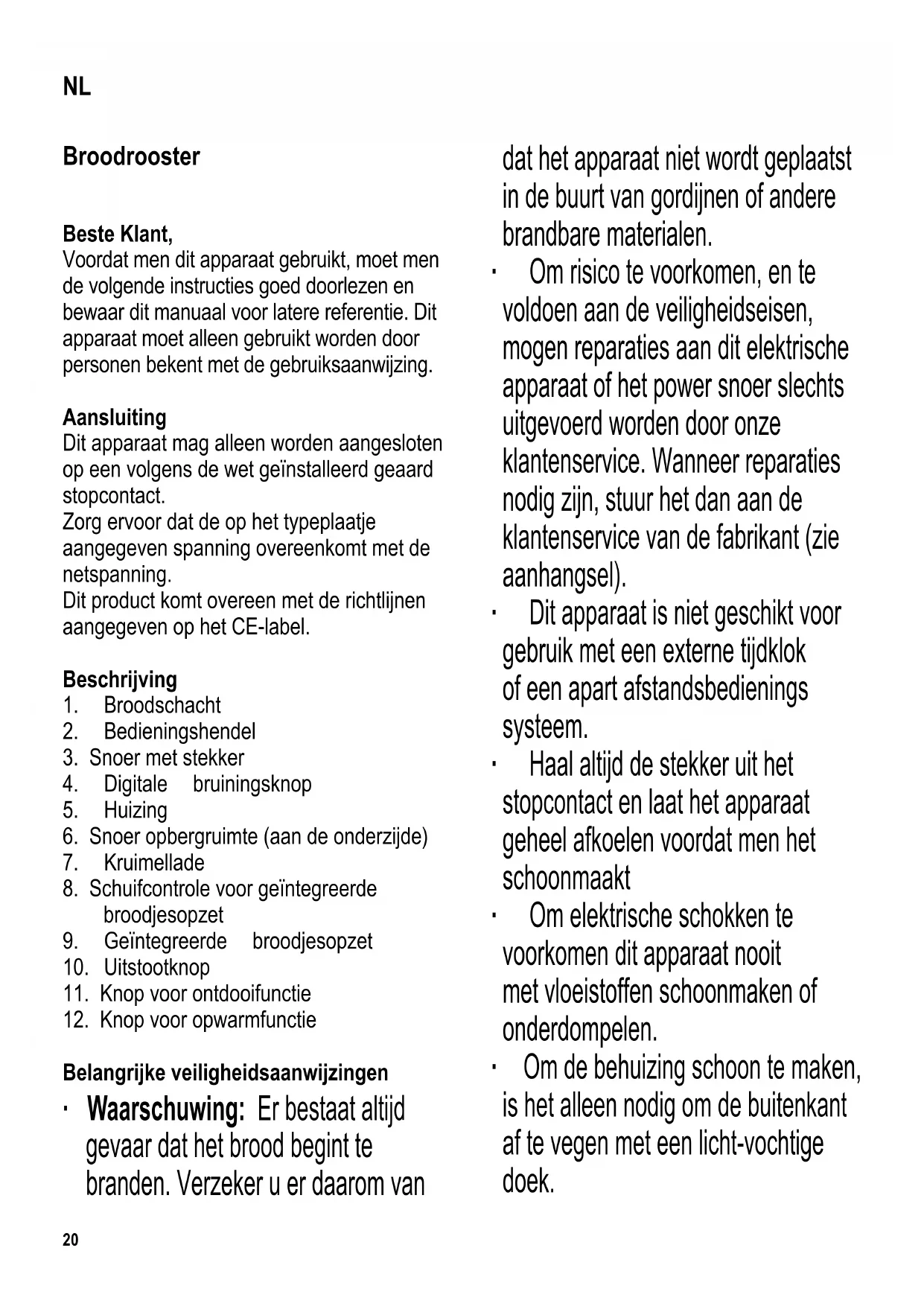 Belangrijke veiligheidsaanwijzingen ∙ Waarschuwing: Er bestaat altijd gevaar dat het brood begint te branden. Verzeker u er daarom van dat het apparaat niet wordt geplaatst in de buurt van gordijnen of andere brandbare materialen. ∙ Om risico te voorkomen, en te voldoen aan de veiligheidseisen, mogen reparaties aan dit elektrische apparaat of het power snoer slechts uitgevoerd worden door onze klantenservice. Wanneer reparaties nodig zijn, stuur het dan aan de klantenservice van de fabrikant (zie aanhangsel). ∙ Dit apparaat is niet geschikt voor gebruik met een externe tijdklok of een apart afstandsbedienings systeem. ∙ Haal altijd de stekker uit het stopcontact en laat het apparaat geheel afkoelen voordat men het schoonmaakt ∙ Om elektrische schokken te voorkomen dit apparaat nooit met vloeistoffen schoonmaken of onderdompelen. ∙ Om de behuizing schoon te maken, is het alleen nodig om de buitenkant af te vegen met een licht-vochtige doek. NL21 ∙ Trek de kruimellade zijwaarts uit het broodrooster om deze kruimels te verwijderen en maak de kruimellade schoon. Zorg ervoor dat men de kruimellade terug plaatst voordat men de broodrooster weer gebruikt. ∙ Dit apparaat is bestemd voor huishoudelijk of gelijkwaardig gebruik, zoals - in bedrijfskeukens, in winkels, kantoren of andere bedrijfsruimtes, - in agrarische instellingen, - door klanten in hotels, motels enz. en gelijkwaardige accommodaties, - in bed and breakfast gasthuizen. ∙ Dit apparaat mag gebruikt worden door kinderen (tenminste 8 jaar oud) en door personen met verminderde fysische, zintuigelijke of mentale bekwaanheden, of gebrek van ervaring en kennis, wanneer deze onder begeleiding zijn of instructies ontvangen hebben over het gebruik van dit apparaat en volledig de gevaren en veiligheidsvoorschriften begrijpen. ∙ Kinderen mogen niet met het apparaat spelen. ∙ Kinderen mogen in geen geval dit apparaat schoonmaken of onderhoudswerkzaamheden uitvoeren behalve wanneer onder toezicht van een volwassene en ze tenminste 8 jaar oud zijn. ∙ Het apparaat en het snoer moeten altijd goed weggehouden worden van kinderen jonger dan 8 jaar. ∙ Waarschuwing: Houdt kinderen weg van inpakmateriaal, daar deze een bron van gevaar zijn b.v. door verstikking. ∙ Plaats het apparaat tijdens gebruik op een vlakke en hittebestendige ondergrond. ∙ Om beschadiging aan de huizing te voorkomen moet men het apparaat niet op of in de buurt van hete oppervlakken (b.v. het fornuis of open vuur) plaatsen of bedienen. ∙ Attentie: Tijdens gebruik kunnen nabijgelegen oppervlakken heet worden. Verbranding kan plaatsvinden bij het aanraken van hete onderdelen. ∙ Voordat het apparaat wordt gebruikt moet zowel de hoofdeenheid inclusief het powersnoer als gelijk welk hulpstuk, dat wordt aangebracht, eerst zorgvuldig op eventuele defecten worden gecontroleerd. Ingeval het apparaat, bijvoorbeeld, op een hard oppervlak is gevallen, of wanneer men met overdadige kracht aan het power snoer getrokken heeft, mag men het niet meer gebruiken: zelfs onzichtbare beschadiging kan ongewenste effecten hebben op de gebruiksveiligheid van het apparaat.22 ∙ Zorg dat het snoer niet in aanraking komt met een hete ondergrond. ∙ Laat het snoer nooit los hangen. ∙ Laat dit apparaat nooit onbeheerd achter. ∙ Dek de broodschacht nooit af tijdens gebruik. ∙ Probeer nooit brood uit het broodrooster te verwijderen met de vingers. Gebruik nooit objecten zoals messen/vorken in de broodschacht; de verwarmingselementen staan onder elektrische spanning. ∙ Verwijder altijd de stekker uit het stopcontact: - na gebruik, - wanneer het apparaat niet werkt, - wanneer men het apparaat schoonmaakt. ∙ Trek de stekker niet aan het snoer uit het stopcontact, trek aan de stekker zelf. ∙ Wordt dit apparaat op een verkeerde manier gebruikt of worden de veiligheidsregels niet gevolgd, dan kan de fabrikant niet aansprakelijk worden gesteld voor eventuele schades. Gebruik Algemene informatie ∙ Waarschuwing: De bedieningshendel werkt alleen wanneer de stekker in het stopcontact zit. ∙ Gebruik geen sneetjes die te dik of te groot zijn. Deze kunnen vast komen zitten in het broodrooster. De dikte mag niet meer zijn dan 14 mm. ∙ Schakel het apparaat altijd uit en verwijder de stekker uit het stopcontact wanneer er een probleem is of tijdens het schoonmaken. ∙ Gebruik een bot houten voorwerp om een sneetje te verwijderen dat vast zit. Raak nooit het metalen verwarmingselement aan. Gebruik voor de eerste keer ∙ Maak het broodrooster goed schoon (zie Onderhoud en schoonmaken). ∙ Zet de broodrooster aan en laat deze tenminste vijf cycli doorlopen op de maximale bruiningsstand zonder dat er brood in zit. ∙ Laat het broodrooster daarbij iedere keer opnieuw afkoelen. ∙ Wanneer men dit apparaat voor de eerste keer gebruikt zal het broodrooster een lichte geur afgeven (en mogelijk een beetje rook). Dit zal vanzelf weggaan na een korte periode. Men moet daarom voor voldoende ventilatie zorgen door de ramen of buitendeuren te openen. Automatische uitschakeling Dit apparaat komt met een automatische uitschakeling feature. Wanneer een sneetje brood vast komt te zitten en kan niet worden uitgestoten nadat de bruinen klaar is, zal de broodrooster automatisch uitschakelen. Wanneer dit gebeurt, ontkoppel het apparaat van het stroomnet en verwijder het sneetje brood zoals wordt beschreven in de sectie Algemene informatie. Instellen van de bruiningsgraad De gewenste bruiningsgraad kan ingesteld worden met de digitale bruiningsknop zodra de bedieningshendel omlaaggedrukt is. Licht: Niveaus 1-3 Donker: Niveaus 5-7 Bij gebruik van gesneden brood wat specifi ek bestemd is voor het roosteren, raden wij aan de bruiningsgraad in te stellen23 op stand 4. De bruiningsgraad die het laatst geselecteerd is blijft bewaard voor de volgende rooster cyclus. Gebruik ∙ Stop de stekker in het stopcontact. ∙ Plaats het brood in de sleuf van de broodrooster en duw de bedieningshendel naar bened