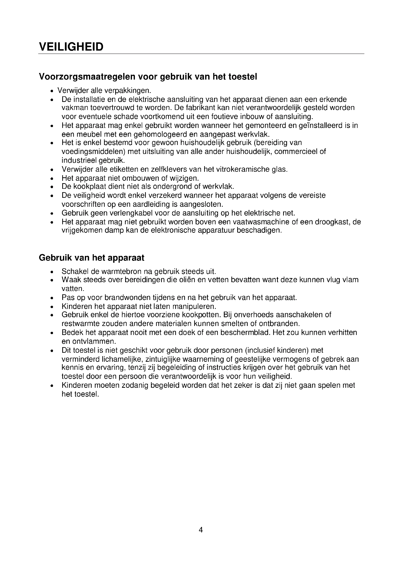 MILIEUBESCHERMING ............................................................................................................9 INSTALLATIEVOORSCHRIFTEN ..........................................................................................10 ELEKTRISCHE AANSLUITING ..............................................................................................114 VEILIGHEID Voorzorgsmaatregelen voor gebruik van het toestel Verwijder alle verpakkingen. De installatie en de elektrische aansluiting van het apparaat dienen aan een erkende vakman toevertrouwd te worden. De fabrikant kan niet verantwoordelijk gesteld worden voor eventuele schade voortkomend uit een foutieve inbouw of aansluiting. Het apparaat mag enkel gebruikt worden wanneer het gemonteerd en geïnstalleerd is in een meubel met een gehomologeerd en aangepast werkvlak. Het is enkel bestemd voor gewoon huishoudelijk gebruik (bereiding van voedingsmiddelen) met uitsluiting van alle ander huishoudelijk, commercieel of industrieel gebruik. Verwijder alle etiketten en zelfklevers van het vitrokeramische glas. Het apparaat niet ombouwen of wijzigen. De kookplaat dient niet als ondergrond of werkvlak. De veiligheid wordt enkel verzekerd wanneer het apparaat volgens de vereiste voorschriften op een aardleiding is aangesloten. Gebruik geen verlengkabel voor de aansluiting op het elektrische net. Het apparaat mag niet gebruikt worden boven een vaatwasmachine of een droogkast, de vrijgekomen damp kan de elektronische apparatuur beschadigen. Gebruik van het apparaat Schakel de warmtebron na gebruik steeds uit. Waak steeds over bereidingen die oliën en vetten bevatten want deze kunnen vlug vlam vatten. Pas op voor brandwonden tijdens en na het gebruik van het apparaat. Kinderen het apparaat niet laten manipuleren. Gebruik enkel de hiertoe voorziene kookpotten. Bij onverhoeds aanschakelen of restwarmte zouden andere materialen kunnen smelten of ontbranden. Bedek het apparaat nooit met een doek of een beschermblad. Het zou kunnen verhitten en ontvlammen. Dit toestel is niet geschikt voor gebruik door personen (inclusief kinderen) met verminderd lichamelijke, zintuiglijke waarneming of geestelijke vermogens of gebrek aan kennis en ervaring, tenzij zij begeleiding of instructies krijgen over het gebruik van het toestel door een persoon die verantwoordelijk is voor hun veiligheid. Kinderen moeten zodanig begeleid worden dat het zeker is dat zij niet gaan spelen met het toestel.5 Voorzorgsmaatregelen tegen beschadiging Beschadigde kookpotten of kookpotten met ruwe bodem (niet geëmailleerd gietijzer) kunnen het glas beschadigen. De aanwezigheid van zand of andere schuurmaterialen kunnen het glas beschadigen. Laat geen voorwerpen (zelfs kleine) op het glas vallen. Vermijd het stoten van kookpotten tegen de rand van het glas. Verzeker u ervan dat de ventilatie van het apparaat verloopt volgens de instructies van de fabrikant. Plaats of laat geen lege kookpotten op de kookplaat. Vermijd het contact van suiker, synthetische stoffen of aluminiumfolie met de hete zones. Deze stoffen kunnen tijdens het afkoelen het vitrokeramische oppervlak doen barsten of aantasten: schakel het apparaat uit en verwijder ze onmiddellijk van de nog hete zones (opgepast: risico voor brandwonden) Plaats nooit een warme kookpot op de bedieningszone. Indien er onder het inbouwapparaat een lade is, zorg dan voor een voldoende afstand (2 cm) tussen de inhoud van de lade en de onderkant van het apparaat teneinde een goede ventilatie te verzekeren. Leg geen ontvlambare voorwerpen (bvb. sprays) in de lade onder de kookplaat. Eventuele bestekbakken dienen in warmtebestendig materiaal te zijn uitgevoerd. Voorzorgsmaatregelen bij defect van het apparaat Bij het vaststellen van een defect, het apparaat uitzetten en de elektrische toevoer uitschakelen. Schakel onmiddellijk de elektrische stroom van het apparaat uit indien er een barst of spleet in de vitrokeramiek is en verwittig de dienst na verkoop. De herstellingen dienen enkel door gespecialiseerd personeel te worden uitgevoerd. In geen geval het apparaat zelf openen. WAARSCHUWING: Als het glazen kookoppervlak gebroken is, schakel het toestel uit om een mogelijke elektrische schok te voorkomen. Andere voorzorgsmaatregelen Zorg ervoor dat de kookpot steeds in het midden van de kookzone staat. De bodem van de kookpot moet de kookzone zoveel mogelijk bedekken. Gebruik geen synthetische of aluminium kookpannen: deze kunnen op de nog hete zones smelten.6