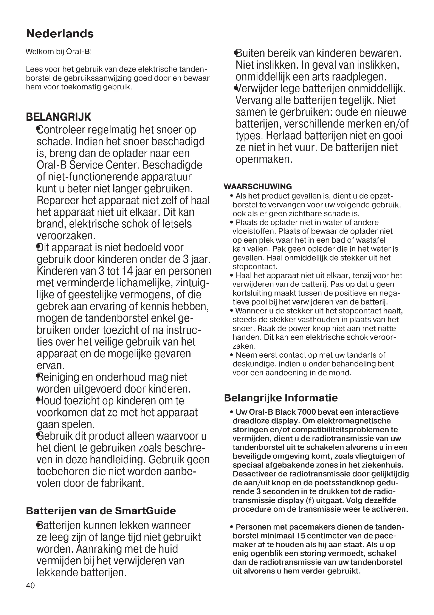 - Oral-B kan het lange termijn effect van niet- Oral-B opzetborstels niet voorspellen op het handvat. Alle Oral-B opzetborstels hebben het Oral-B logo envoldoen aan Oral-B’s hoogste kwaliteitsnormen. Oral-B verkoopt geen opzetborstels of andere stukken onder aan andere merknaam. 30 Dagen Niet Tevreden Geld Terug garantie Doe de 30 dagen test! Oral-B Black 7000 met SmartGuide is Oral-B’s meest geavanceerde elektrische tandenborstel voor buitengewone reiniging, whitening, zacht voor tandvlees en fris voor uw mond. We zijn er zo van overtuigd dat u helemaal tevreden bent met onze nieuwe tandenborstel dat we u de niet tevreden geld terug-aanbieding doen. Probeer Oral-B Black 7000 met SmartGuide voor 30 dagen, vanaf de dag van aankoop. Als u niet 100% tevreden bent over dit product, ontvangt u het volledige aankoopbedag terug. Er worden geen vragen gesteld. Stuur binnen 30 dagen na aankoop de tandenborstel, opzetborstels en oplader in de originele doos met uw originele kassabon naar onderstaand adres: Aankopen in Nederland Oral-B NTGT HighCo DATA 08468 POSTBUS 71146 3000 PC ROTTERDAM of kijk op www.niettevredengeldterug.nl Aankopen in België DJS «Actie 30 dagen op proef» Rue de la Brasserie 2 5310 Eghezee Voor meer informatie, neem contact op met onze Consumentenservice: NL: 0800 4455388 BE: 0800 14592 92036479_D34_WE_7000_S6-68.indd 45 19.12.12 13:49 CSS APPROVED Effective Date 27Dec2012 GMT - Printed 05Mar2013 Page 44 of 6746 Velkommen til Oral-B! Før brug af tandbørsten, bedes du læse instruk- tionerne. Gem denne vejledning til fremtidig brug./ Les instruksjonene før du begynner å bruke tann- børsten. Ta vare på denne bruksanvisningen. VIGTIGT/VIKTIG