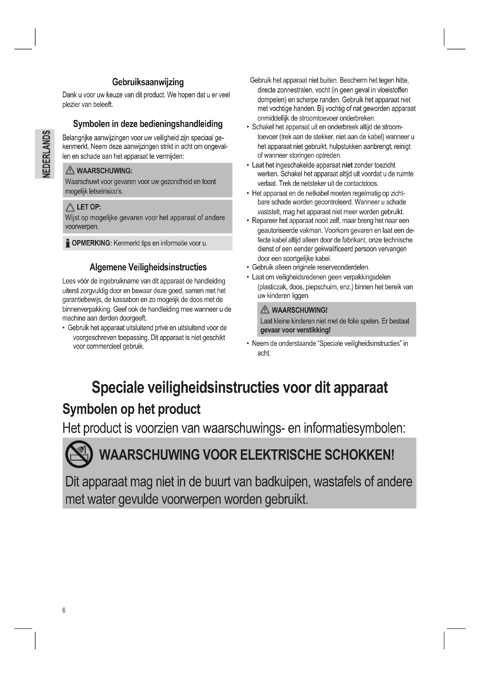 - Gebruik het apparaat uitsluitend privé en uitsluitend voor de voorgeschreven toepassing. Dit apparaat is niet geschikt voor commercieel gebruik. Speciale veiligheidsinstructies voor dit apparaat Symbolen op het product Het product is voorzien van waarschuwings- en informatiesymbolen: WAARSCHUWING VOOR ELEKTRISCHE SCHOKKEN! Dit apparaat mag niet in de buurt van badkuipen, wastafels of andere met water gevulde voorwerpen worden gebruikt.7 WAARSCHUWING: